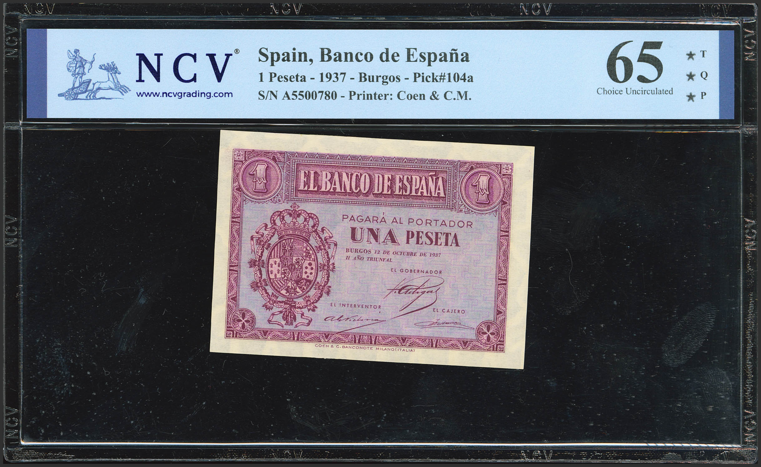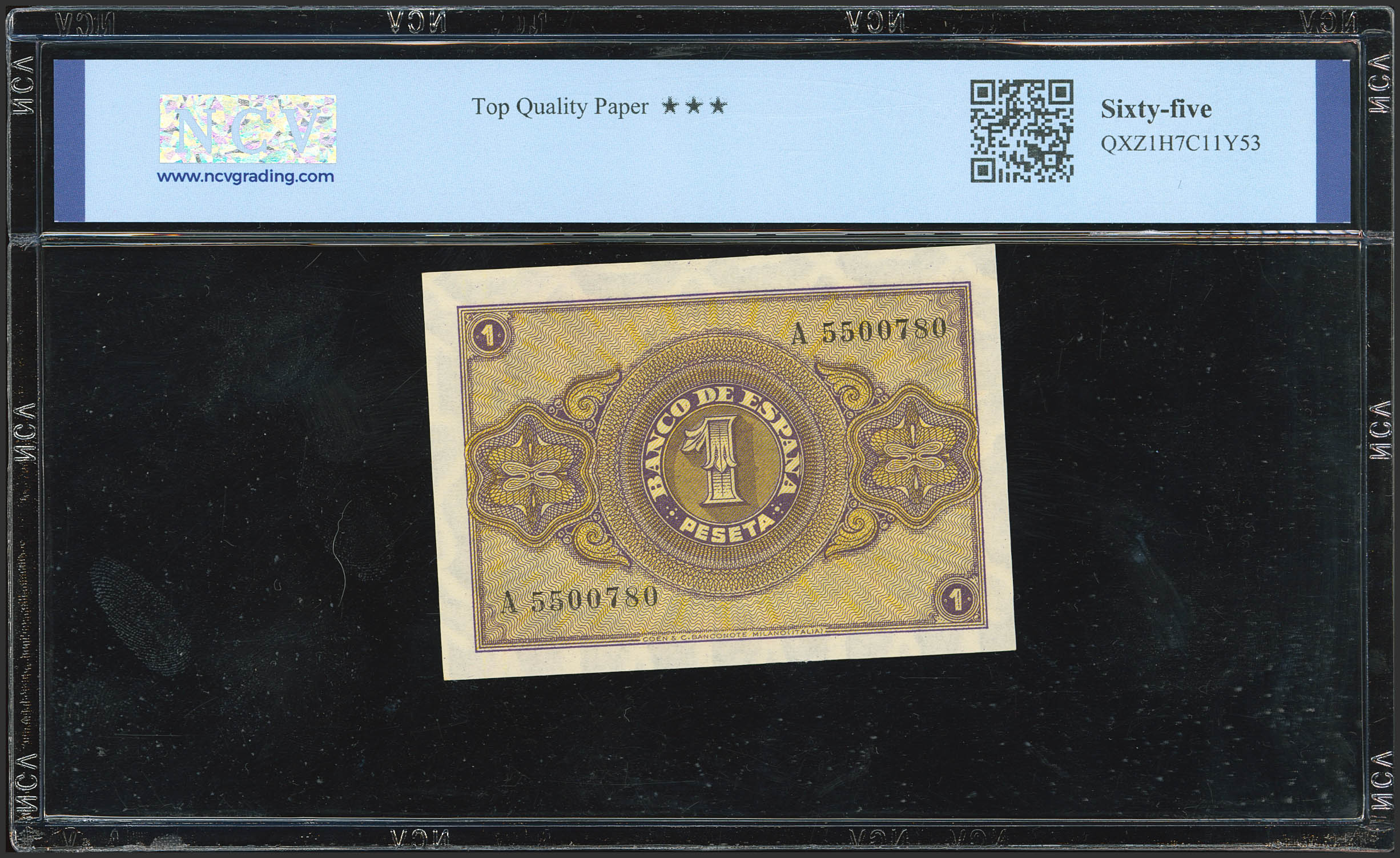 1 Peseta. October 12, 1937. Series A. (Edifil 2023: 425, Pick: 104a). Original finish. Uncirculated. NCV65TQP encapsulation.