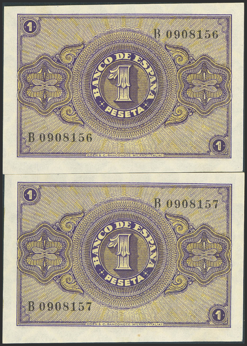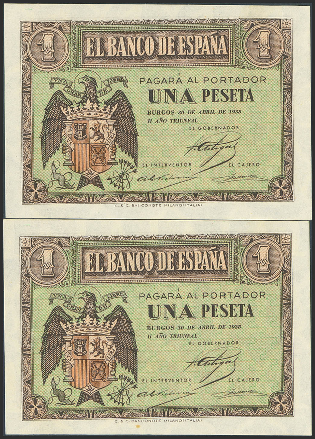English 1 Peseta. April 30, 1938. Consecutive pair. Series B. (Edifil 2023: 428a). Original finish. Uncirculated.
