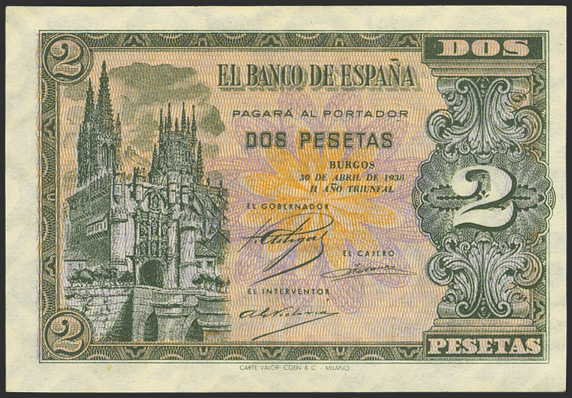2 Pesetas. April 30, 1938. Series N, last series issued. (Edifil 2023: 429b). Original condition. Uncirculated-.