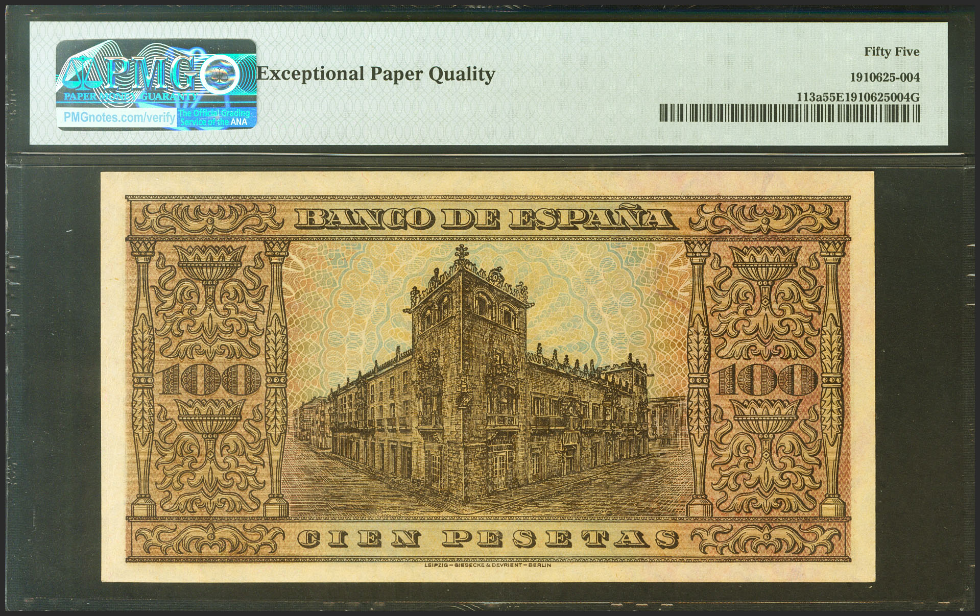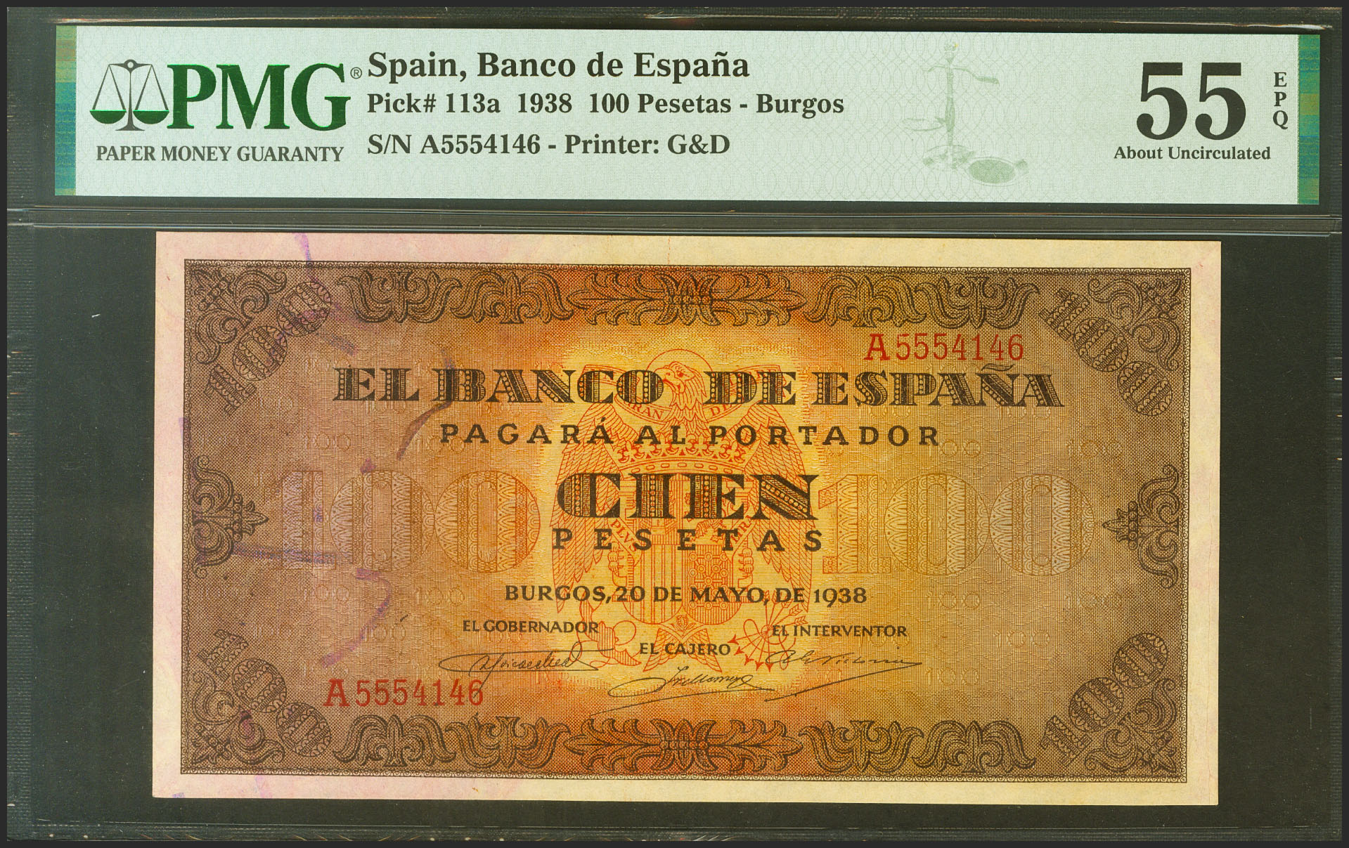 English 100 Pesetas. May 20, 1938. Series A. (Edifil 2021: 432, Pick: 113a). Original finish. EF+ Encapsulated PMG55EPQ.