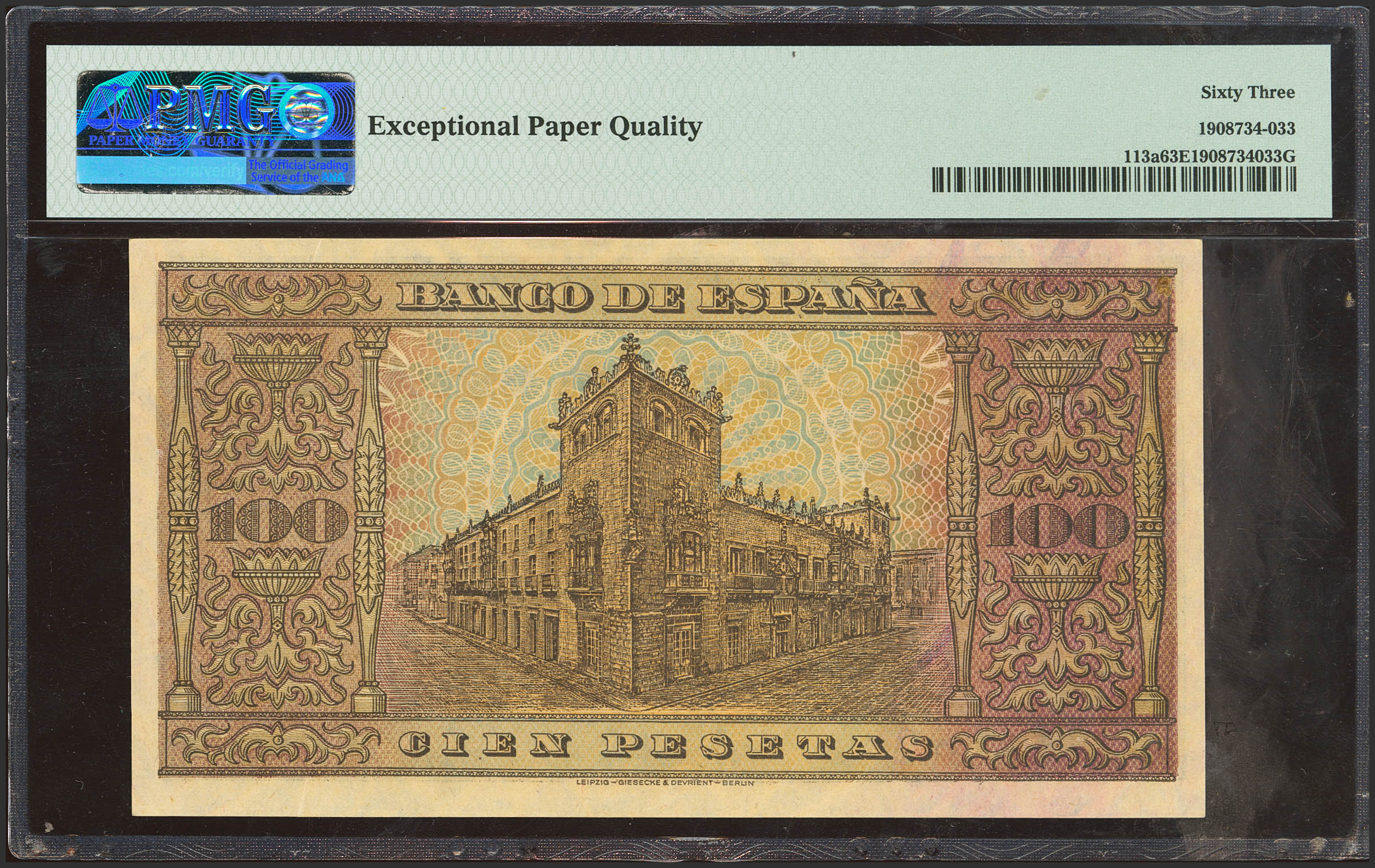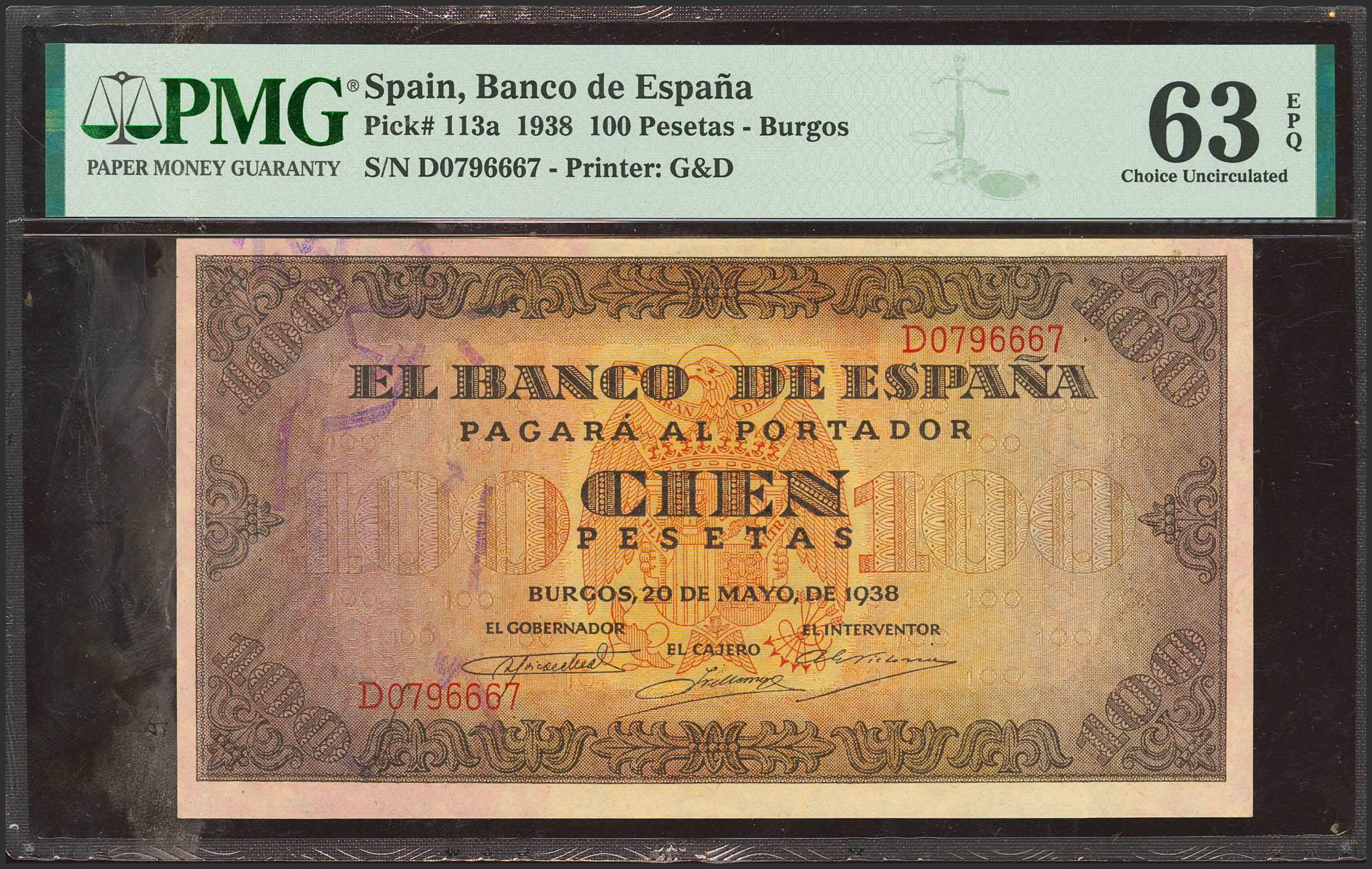 100 Pesetas. May 20, 1938. Series D. (Edifil 2023: 432a, Pick: 113a). Unusual in this exceptional quality, original finish. Uncirculated. Encapsulated PMG63EPQ.