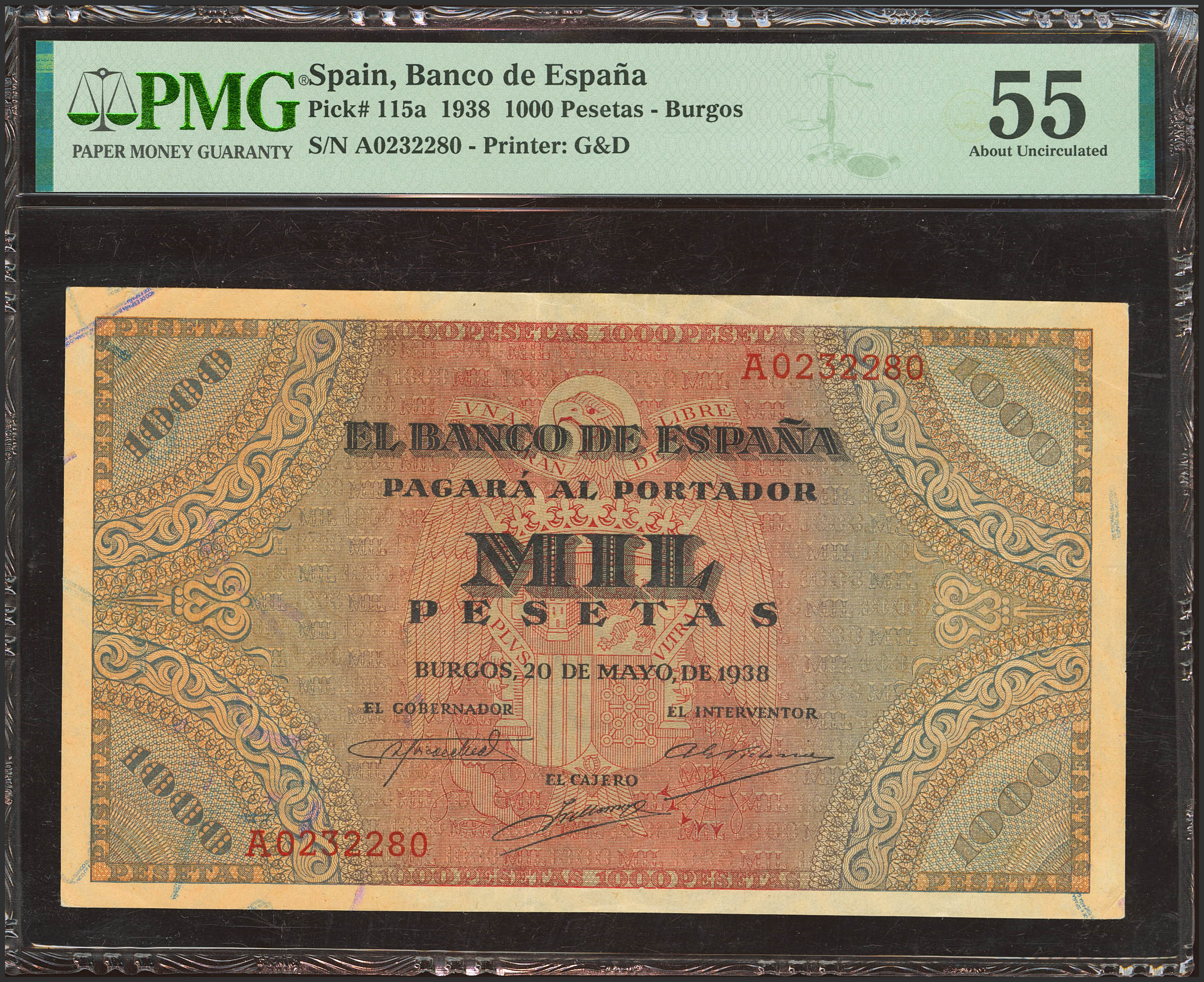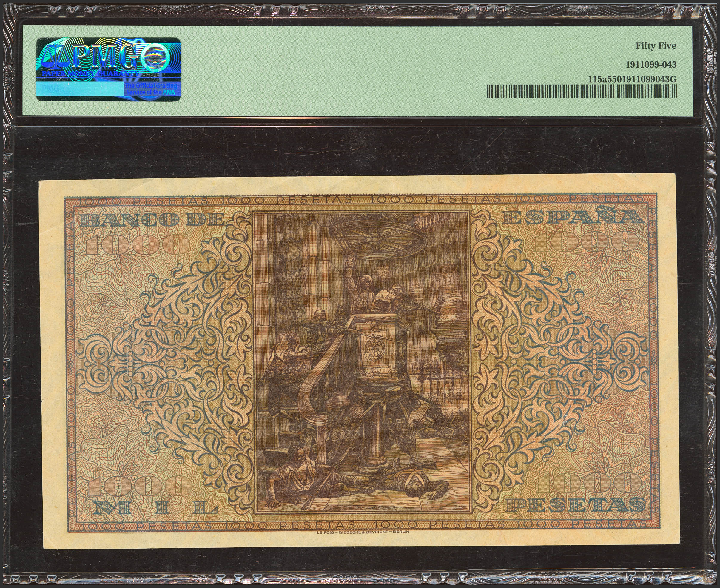 English 1000 Pesetas. May 20, 1938. Series A. (Edifil 2023: 434, Pick: 115a). Unusual in this condition. EF. PMG55 capsule.