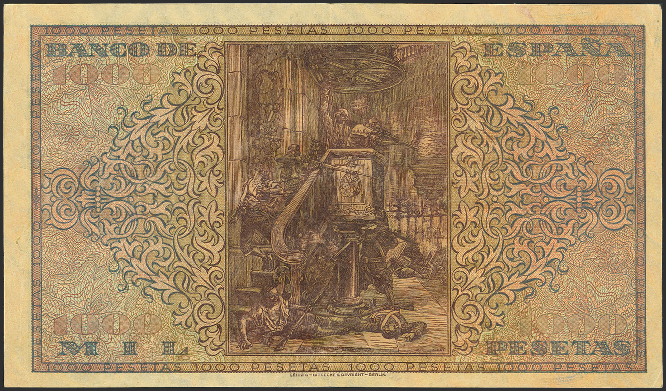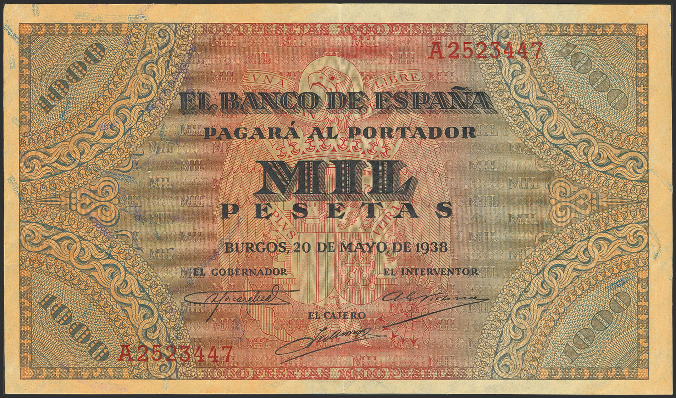 1000 Pesetas. May 20, 1938. Series A. (Edifil 2023: 434). Retains some of its original finish, a banknote of considerable presence. Extremely Fine.