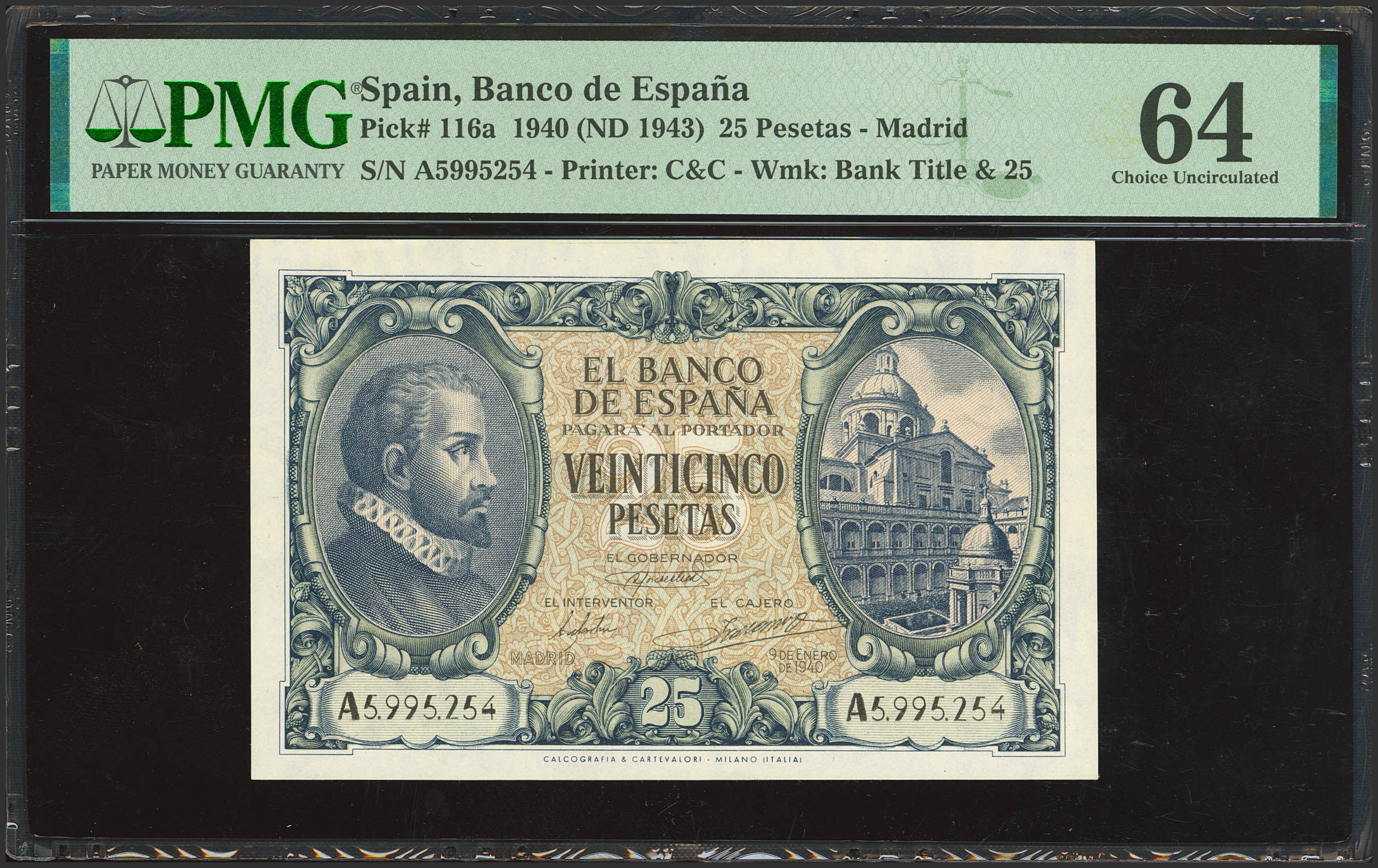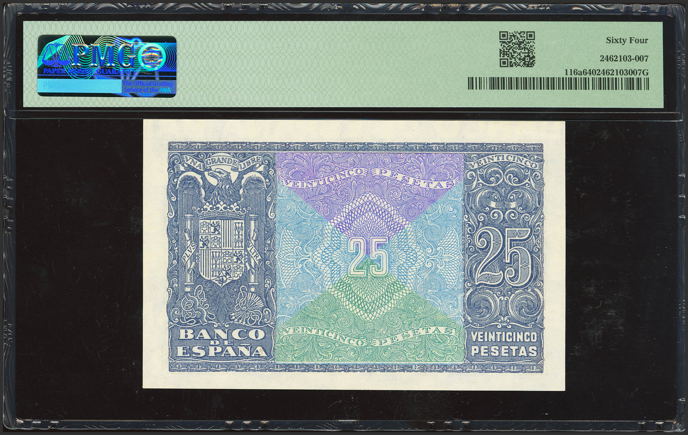 25 Pesetas. January 9, 1940. Series A. (Edifil 2023: 436, Pick: 116a). Rare, especially in this condition. Uncirculated. PMG64 encapsulated.