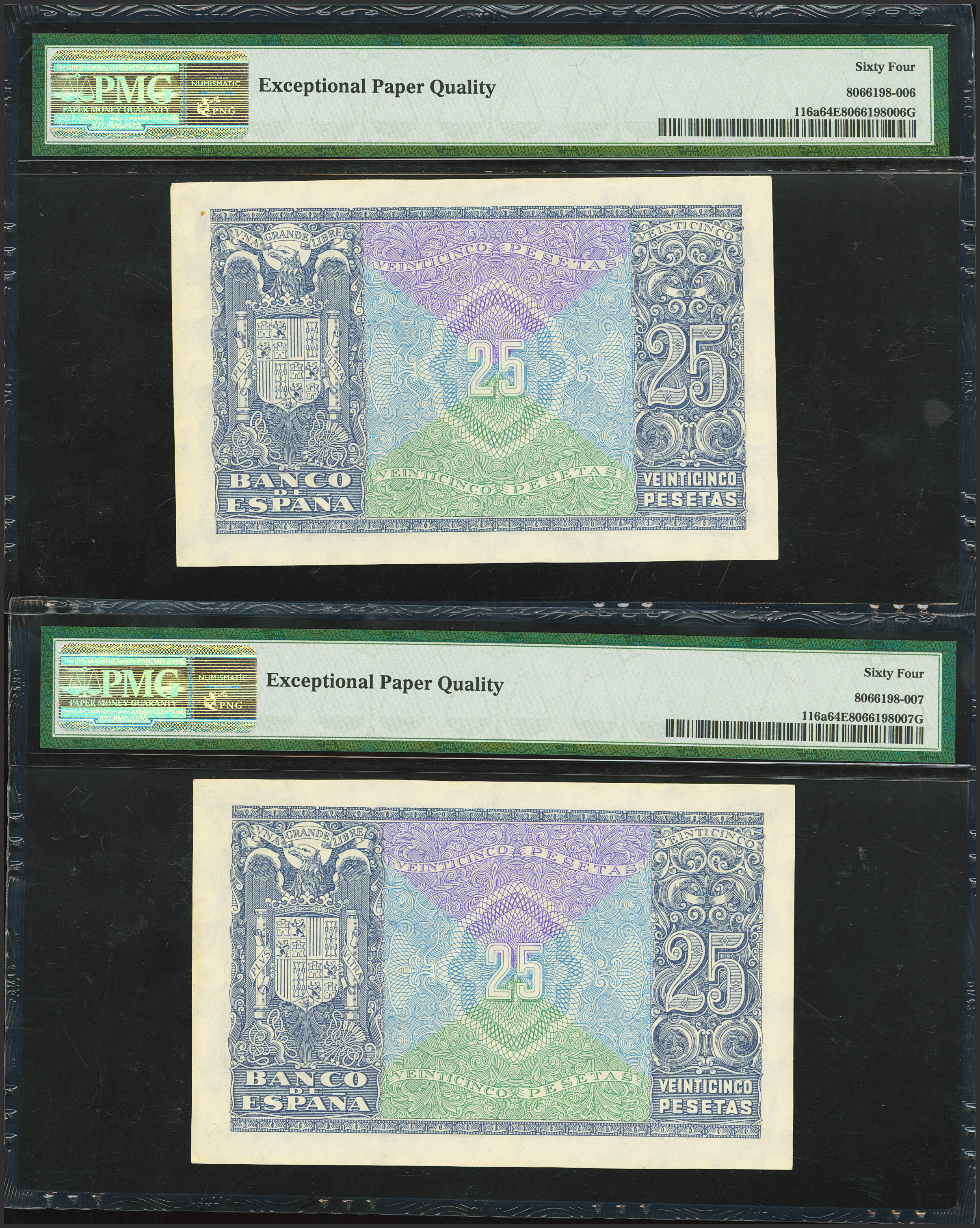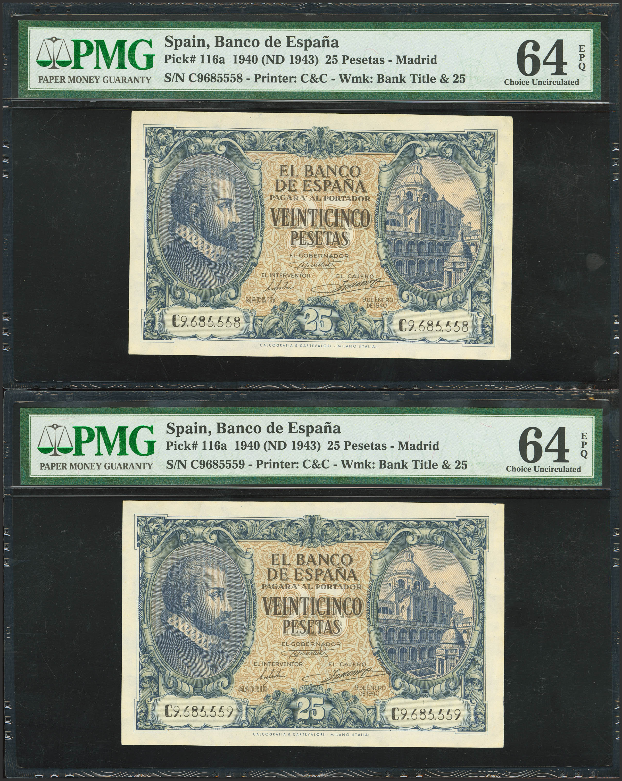 English 25 Pesetas. January 9, 1940. Consecutive pair. Series C. (Edifil 2023: 436a, Pick: 116a). Rare in this exceptional condition, original finish. Uncirculated. Both capped at PMG64EPQ.