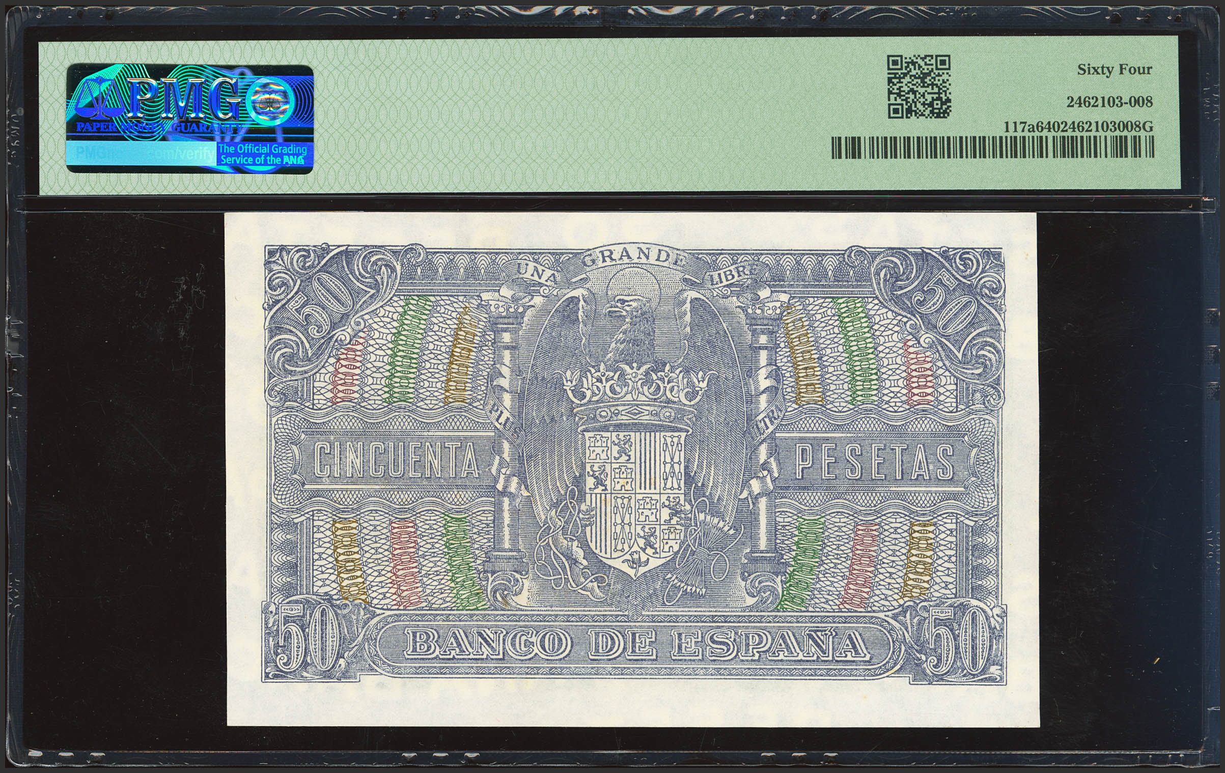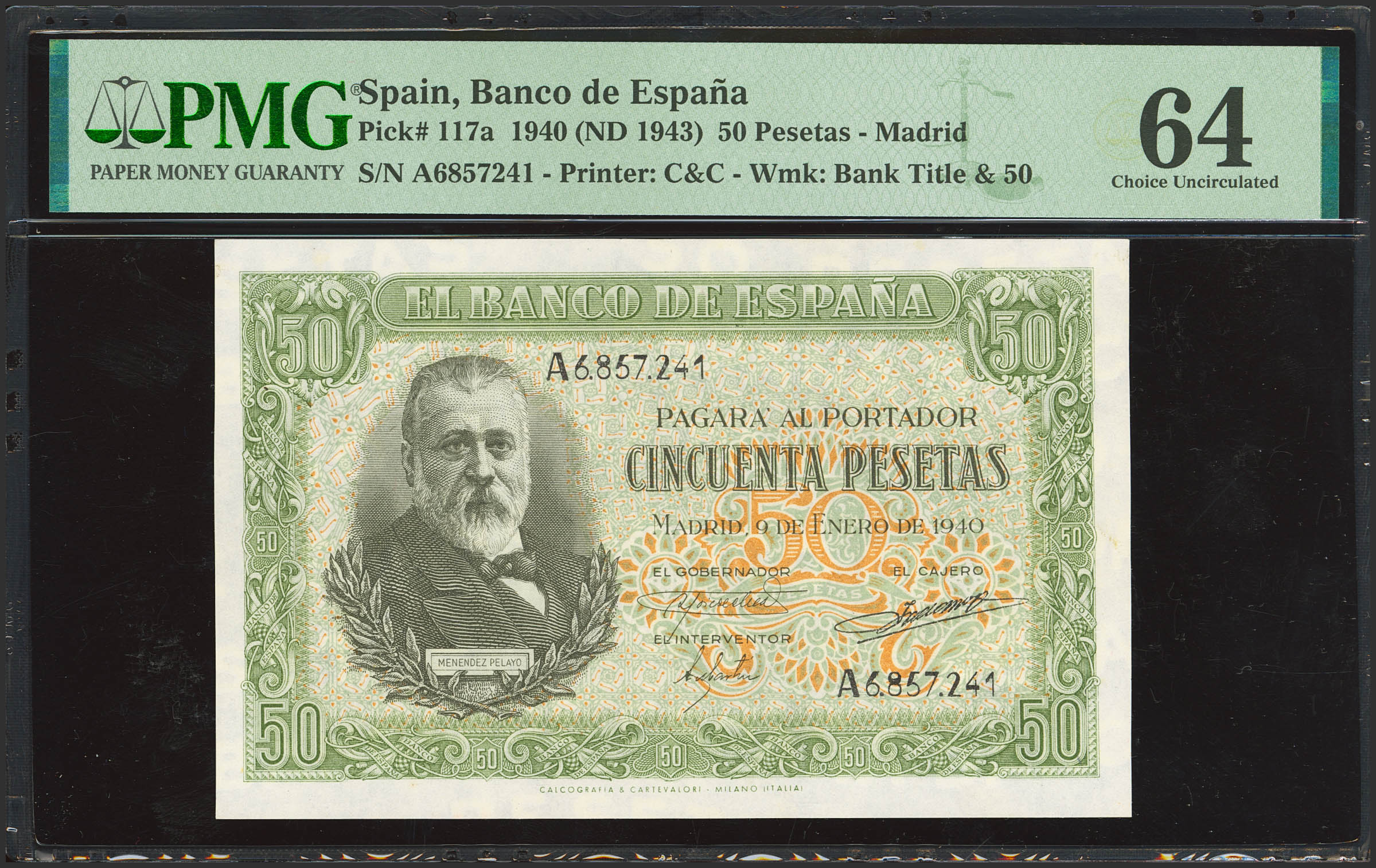 50 Pesetas. January 9, 1940. Series A. (Edifil 2023: 437, Pick: 117a). Rare, especially in this condition. Uncirculated. PMG64 encapsulated.