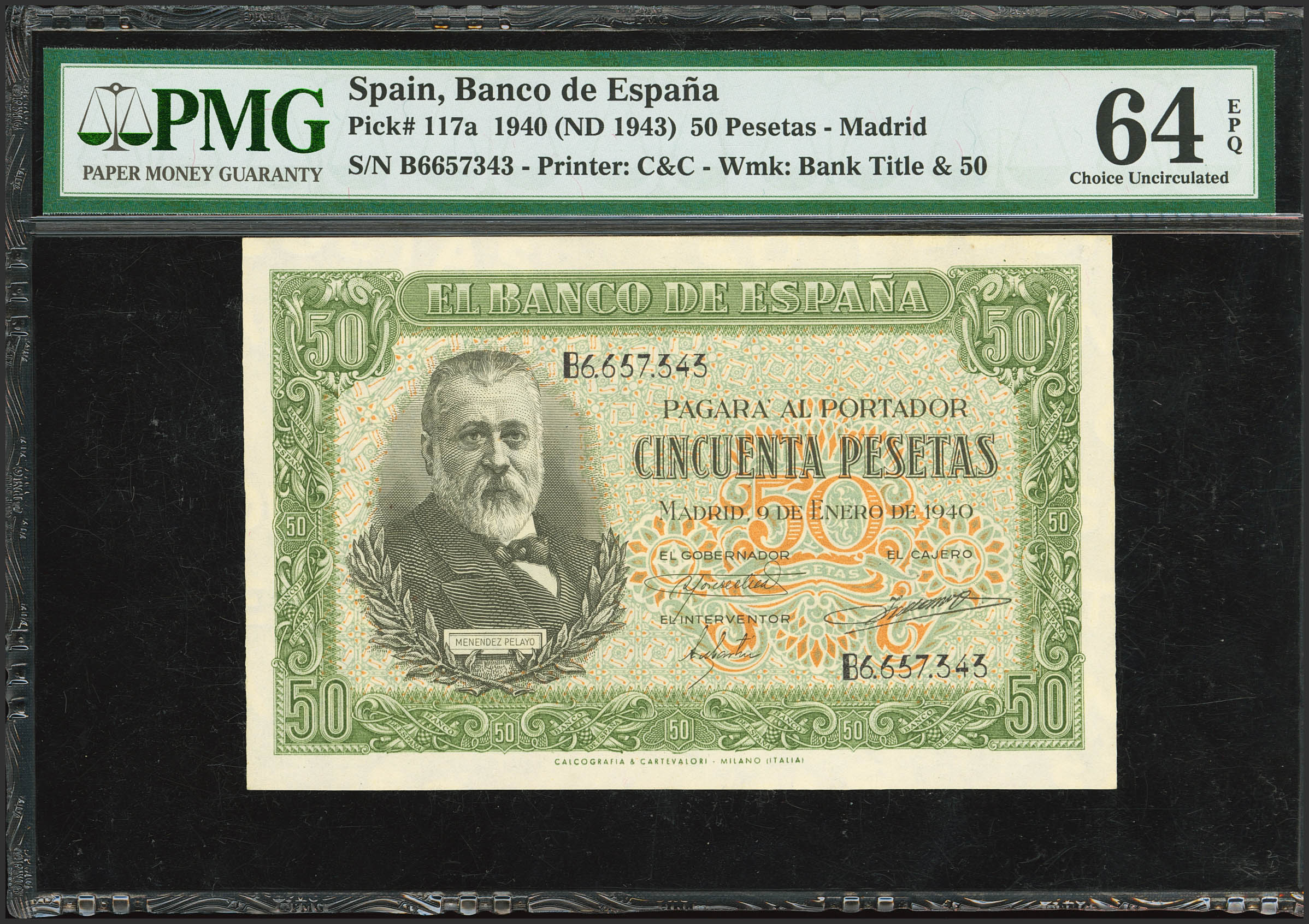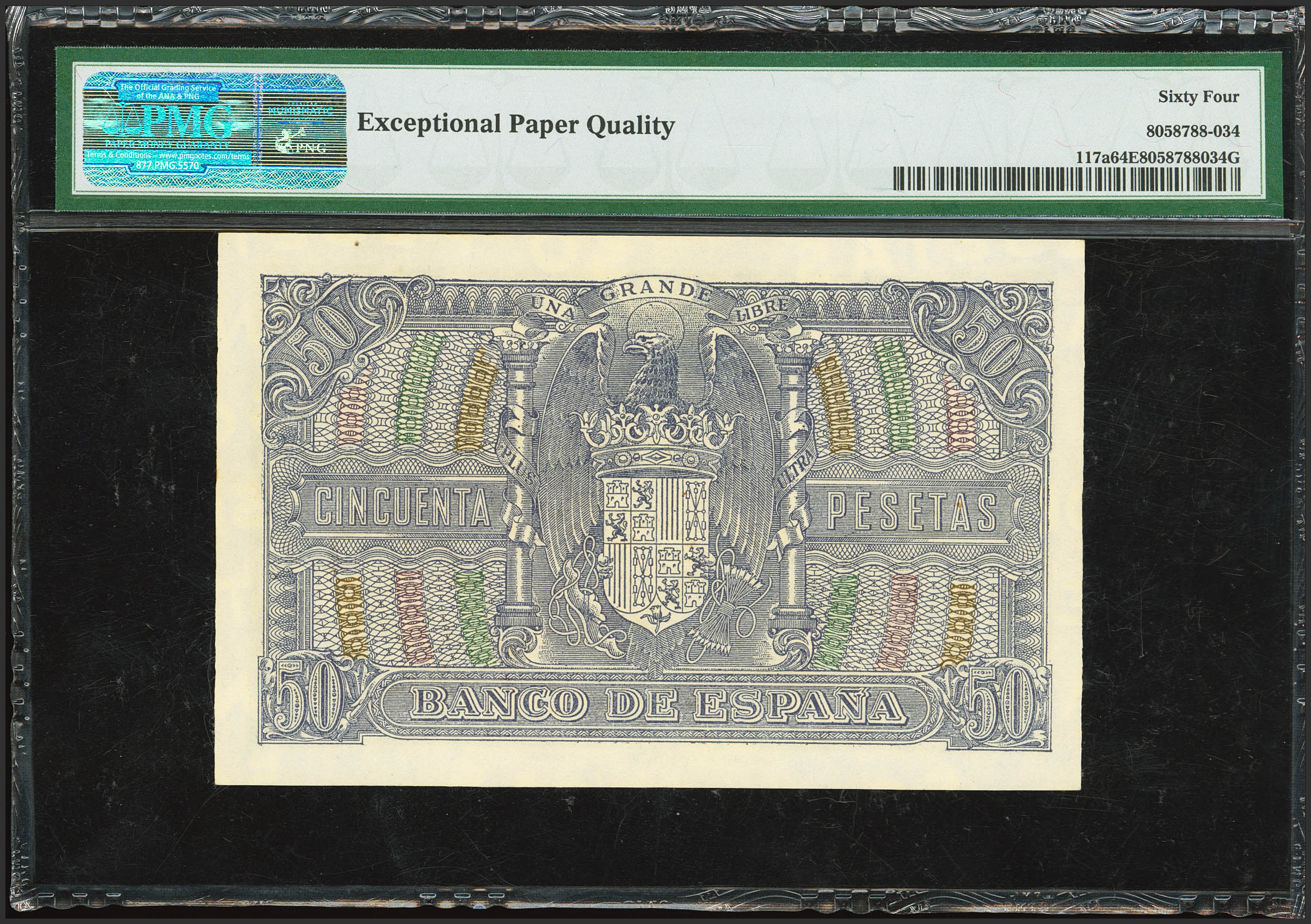 50 Pesetas. January 9, 1940. Series B. (Edifil 2023: 437a, Pick: 117a). Unusual in this condition, original finish. Uncirculated. Encapsulated PMG64EPQ.