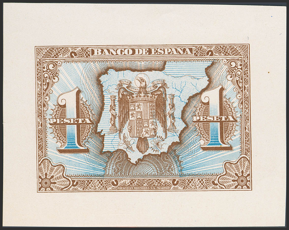 English Reverse proof, plain print, of the 1 Peseta issued on June 1, 1940. (Edifil 2023: 441BP). Uncirculated--. TO BE EXAMINED.