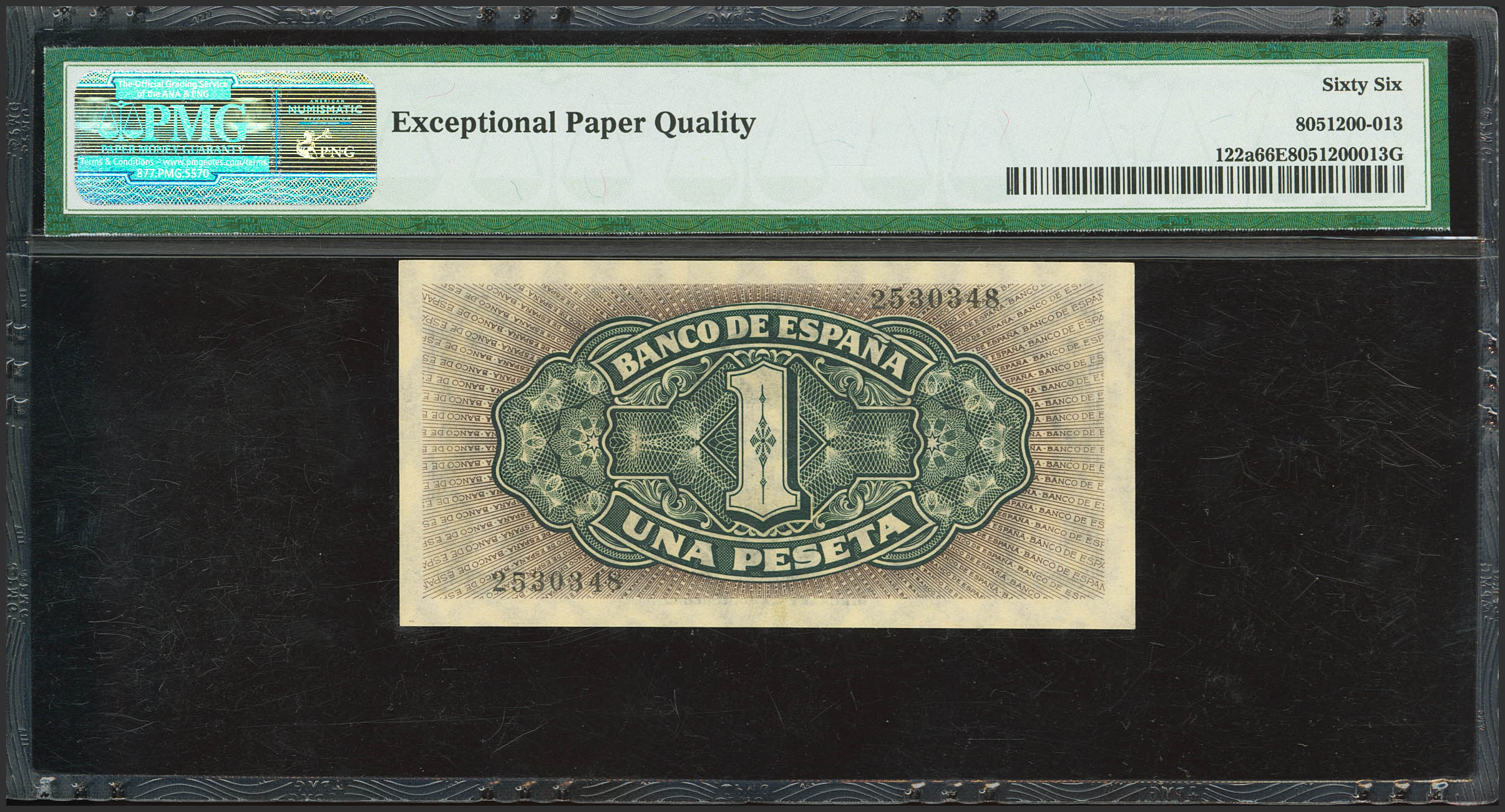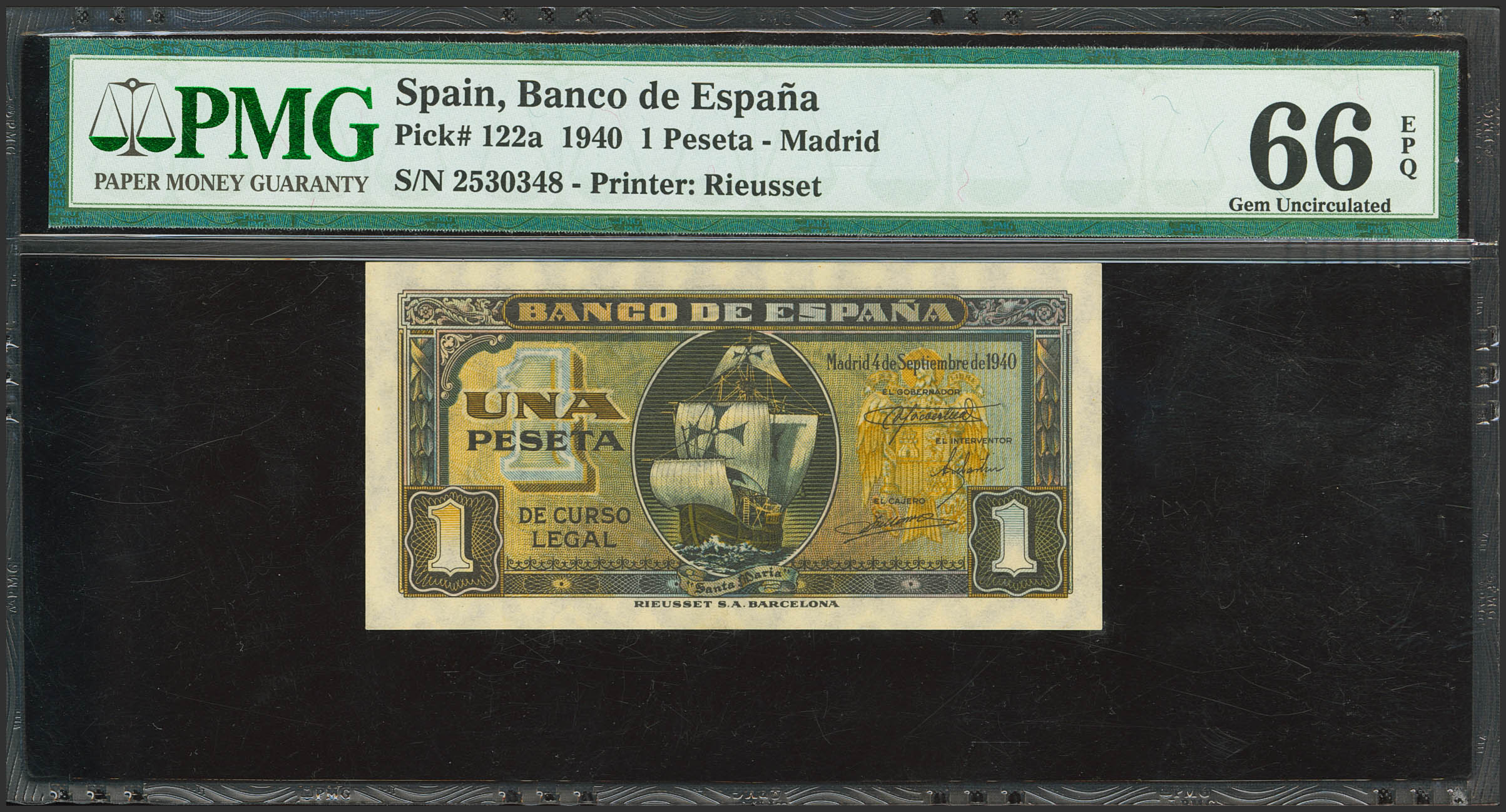 English 1 Peseta. September 4, 1940. No serial number. (Edifil 2023: 442, Pick: 122a). Original finish. Uncirculated. PMG66EPQ encapsulation.