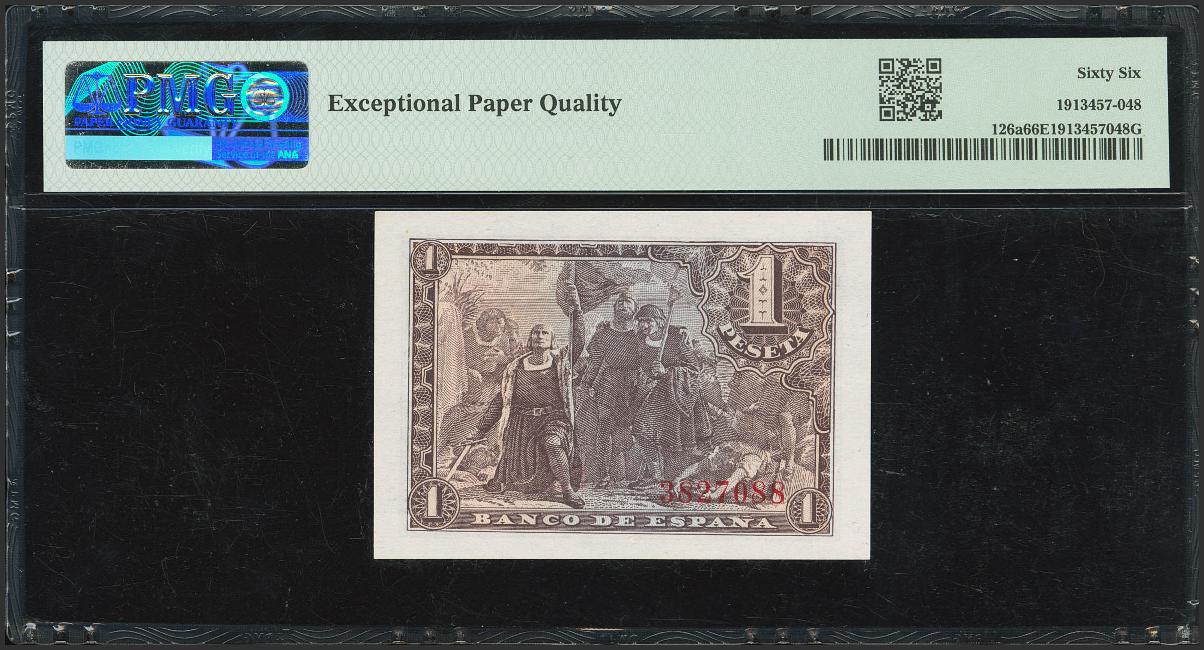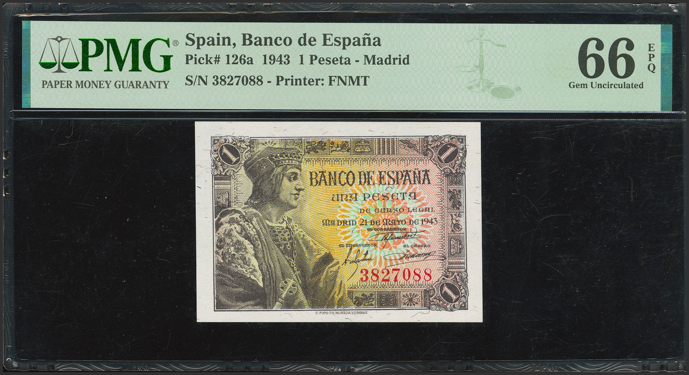 English 1 Pesetas. May 21, 1943. No serial number. (Edifil 2021: 447, Pick: 126a). Rare in this condition, original finish. Uncirculated. PMG66EPQ capsule.