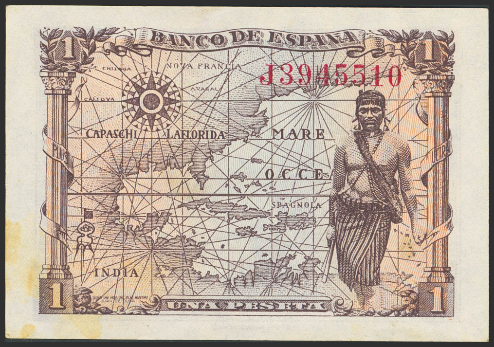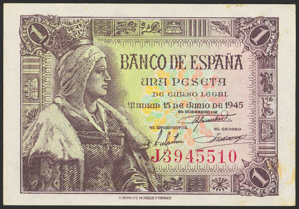 1 Peseta. June 15, 1945. Series J. (Edifil 2023: 448a). Original finish, toned. Uncirculated-.