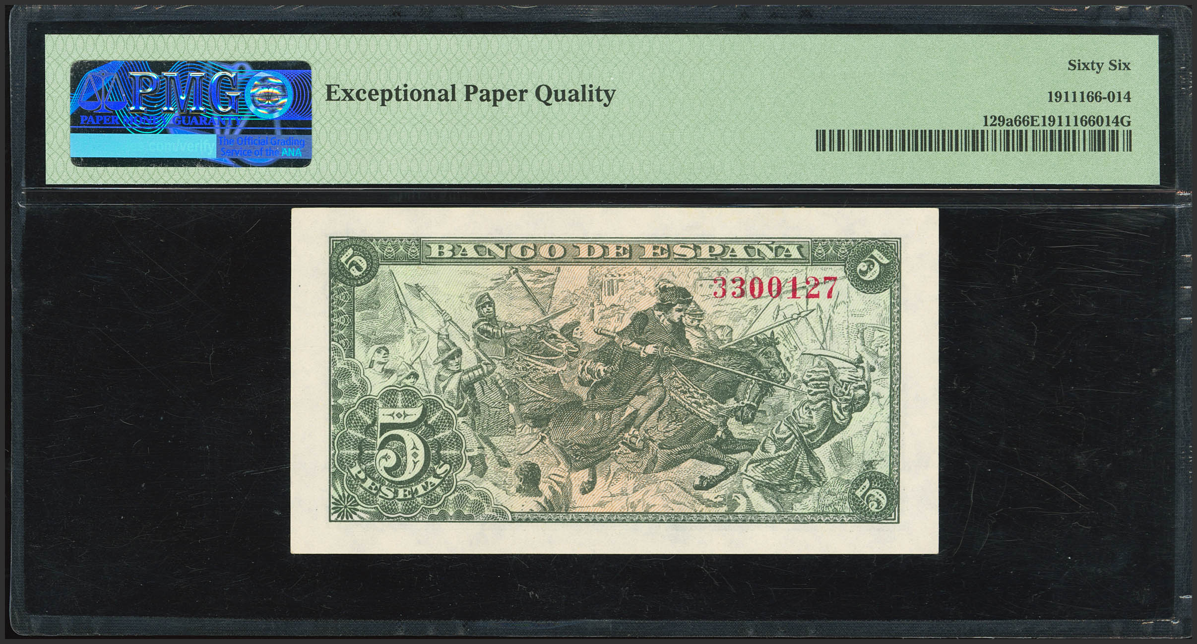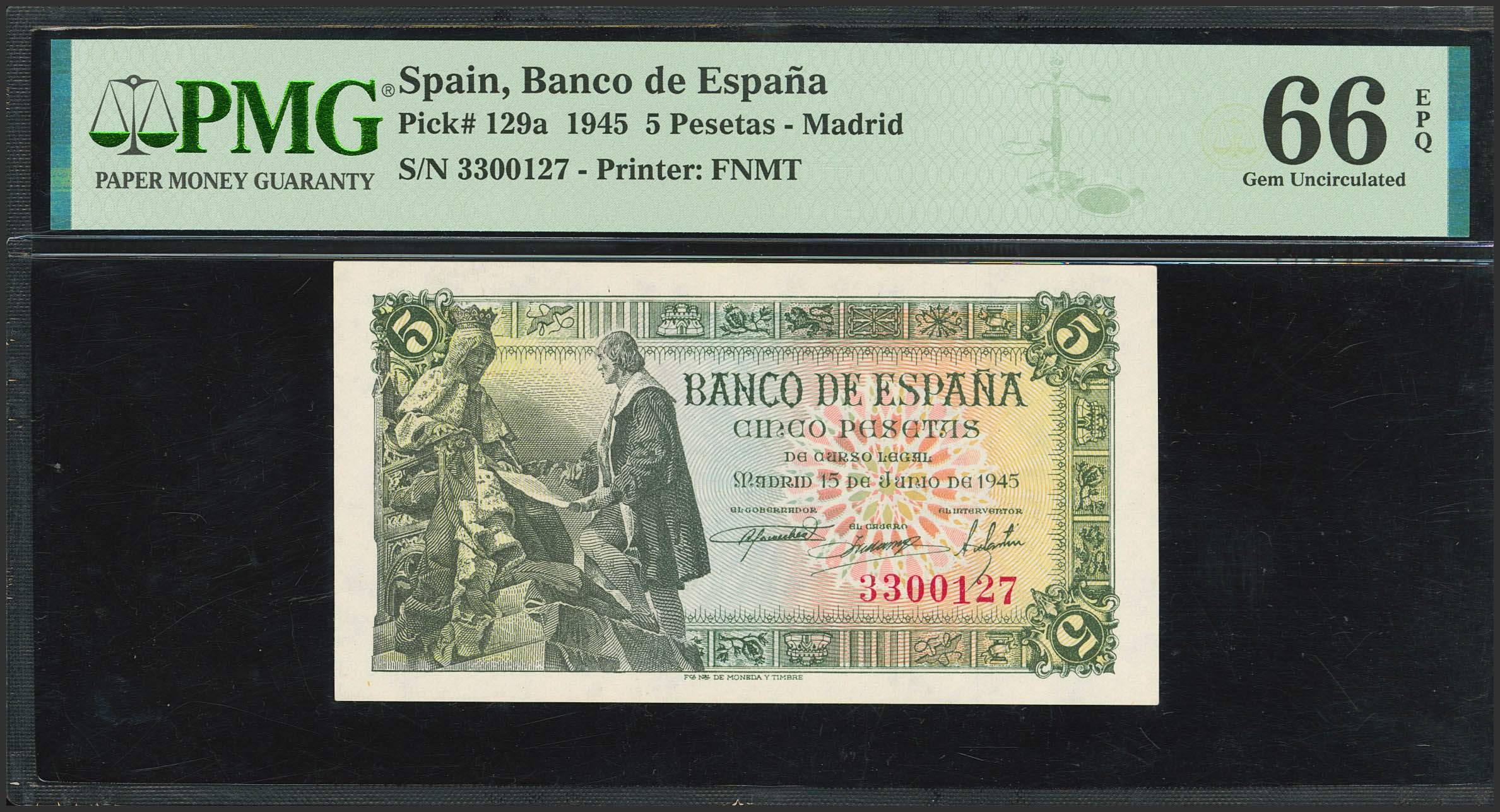 5 Pesetas. June 15, 1945. No serial number. (Edifil 2023: 449, Pick: 129a). Rare in this condition, original finish. Uncirculated. PMG66EPQ capsule.