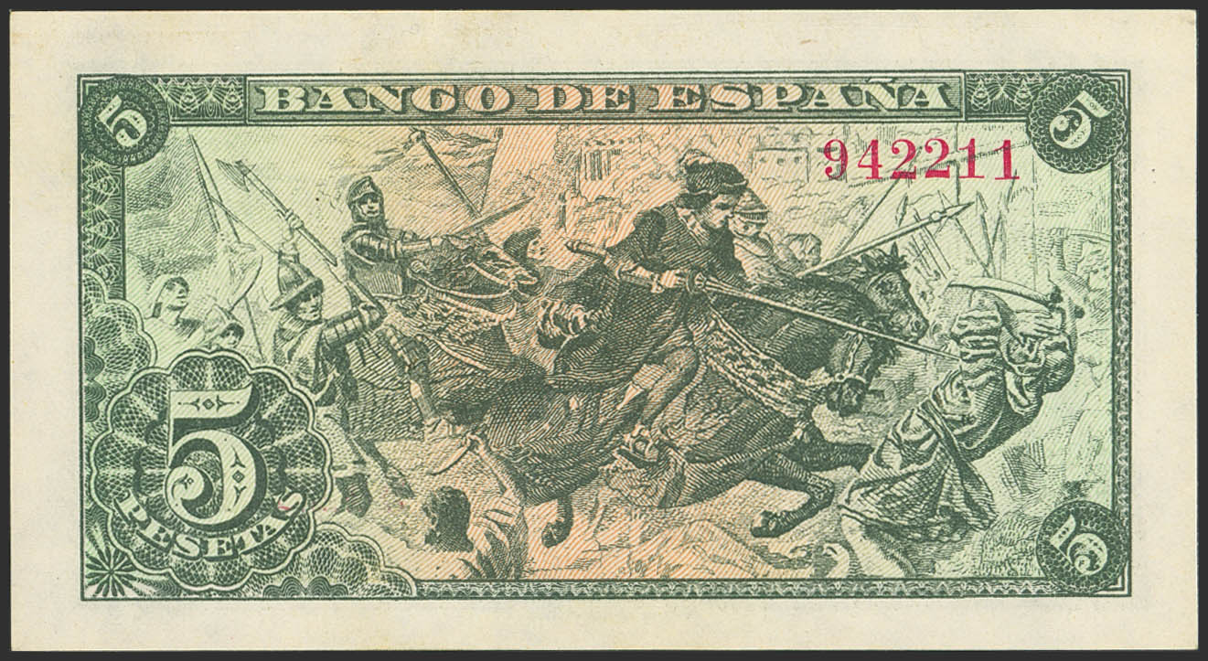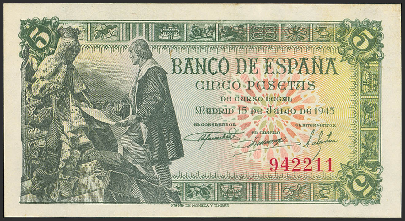 English 5 Pesetas. June 15, 1945. No series. (Edifil 2023: 449). Original condition. EF++.