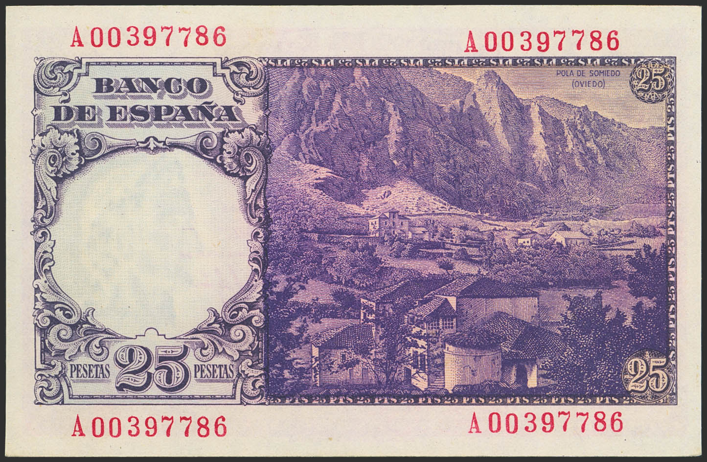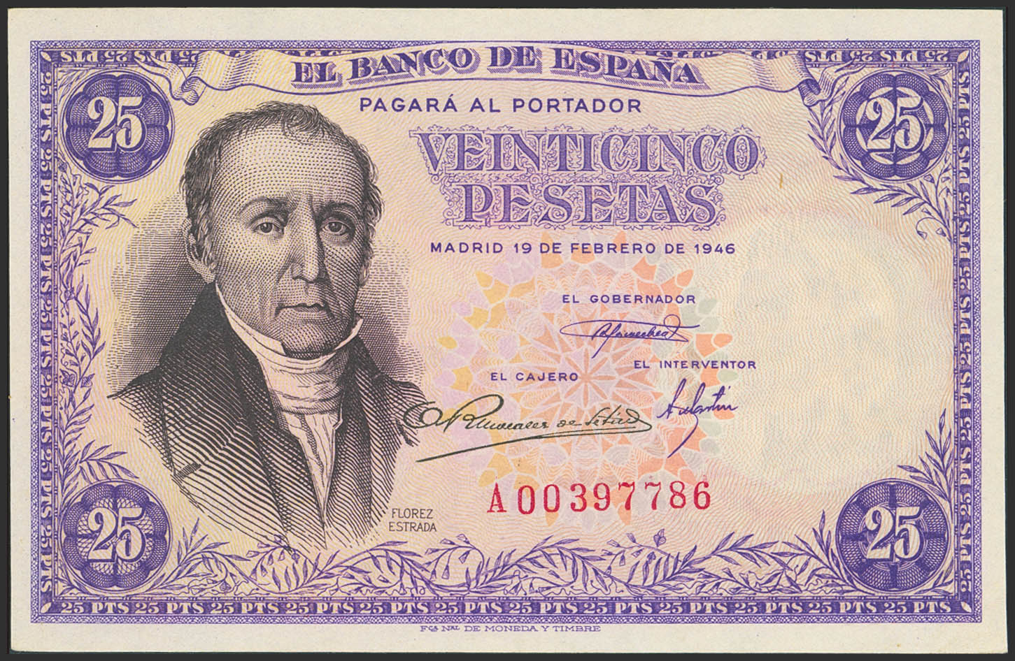 25 Pesetas. February 19, 1946. Series A. (Edifil 2023: 450a). Original condition. Uncirculated.