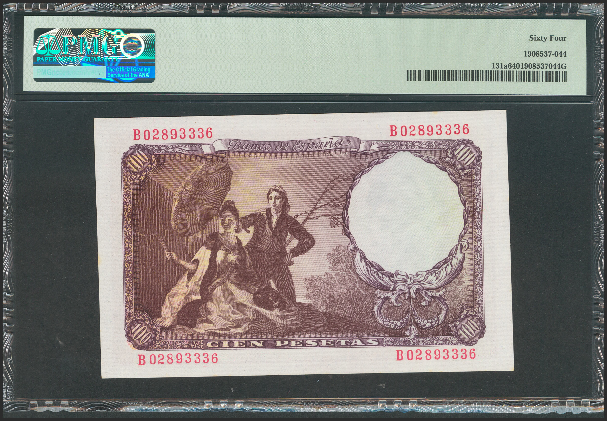 English 100 Pesetas. February 19, 1946. Series B. (Edifil 2017: 451b). Uncirculated. PMG64 encapsulated.