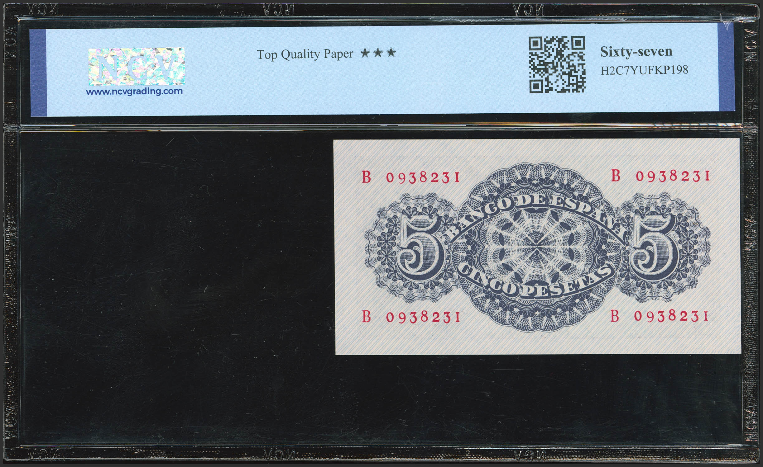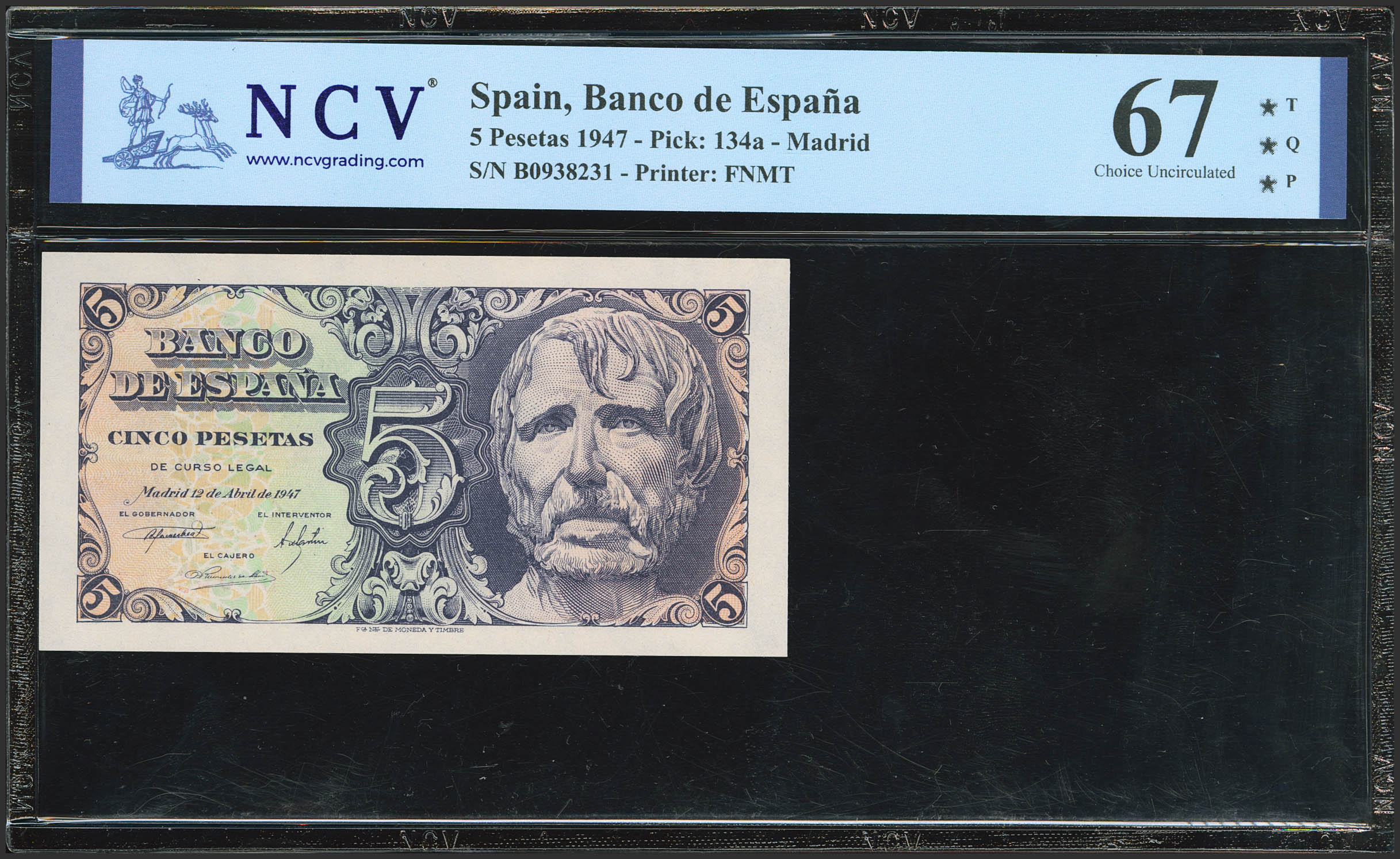 English 5 Pesetas. April 12, 1947. Series B. (Edifil 2023: 454a, Pick: 134a). Rare in this exceptional condition, original finish. Uncirculated. Encapsulated NCV67TQP.