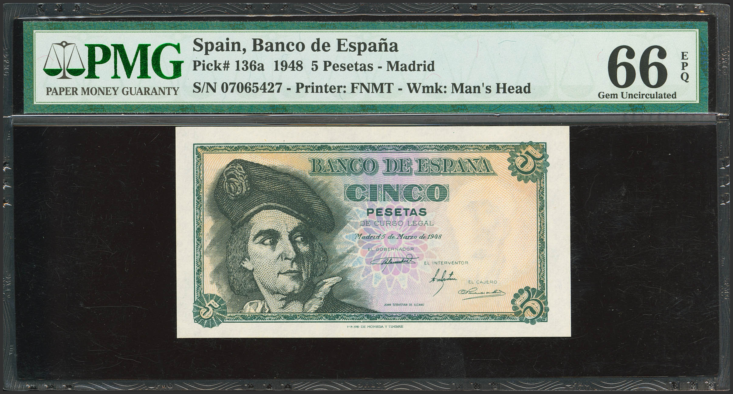 English 5 Pesetas. March 5, 1948. No serial number. (Edifil 2023: 455, Pick: 136a). Original finish. Uncirculated. PMG66EPQ encapsulated.
