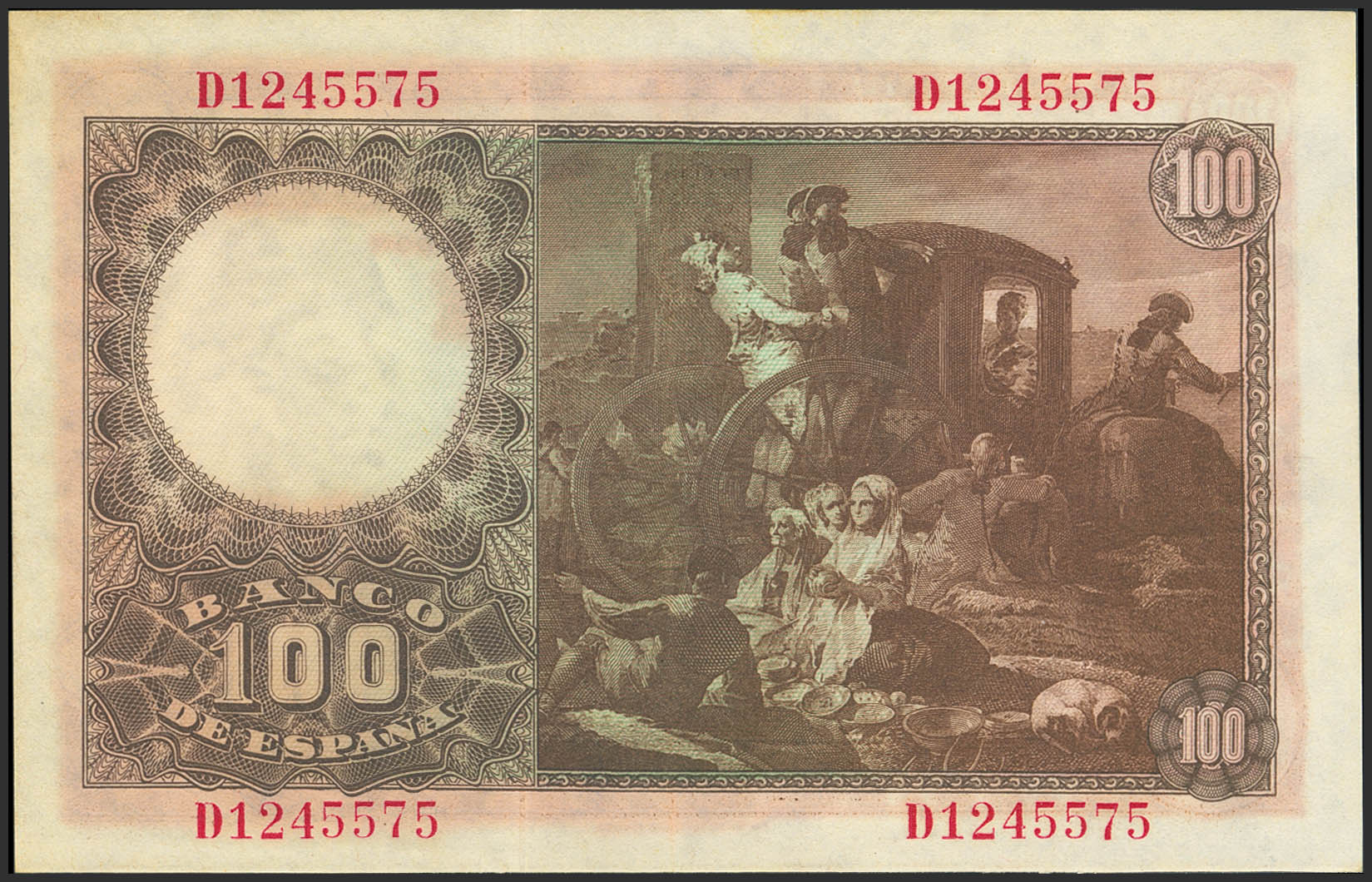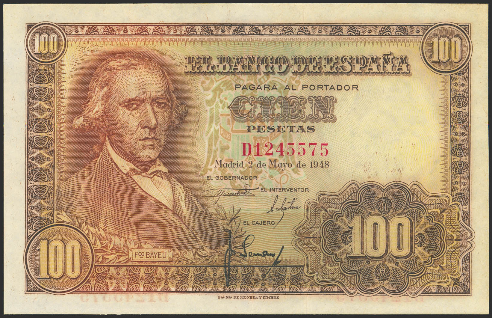 100 Pesetas. May 2, 1948. Series D. (Edifil 2023: 456a). Retains much of its original finish. Extremely Fine.