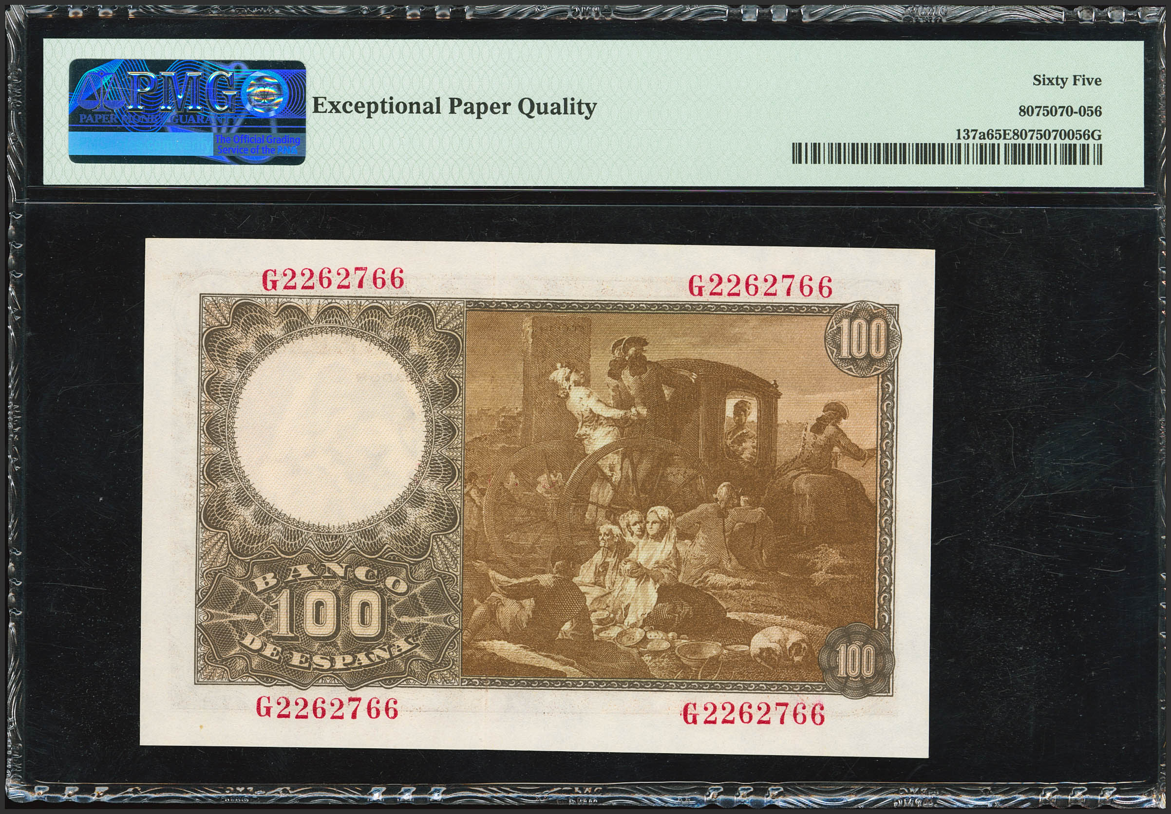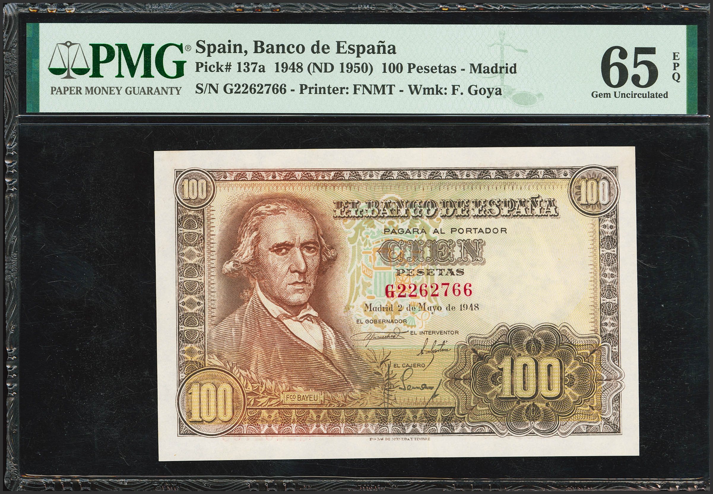 100 Pesetas. May 2, 1948. Series G. (Edifil 2023: 456a, Pick: 137a). Unusual in this exceptional quality, original finish. Uncirculated. Encapsulated PMG65EPQ.