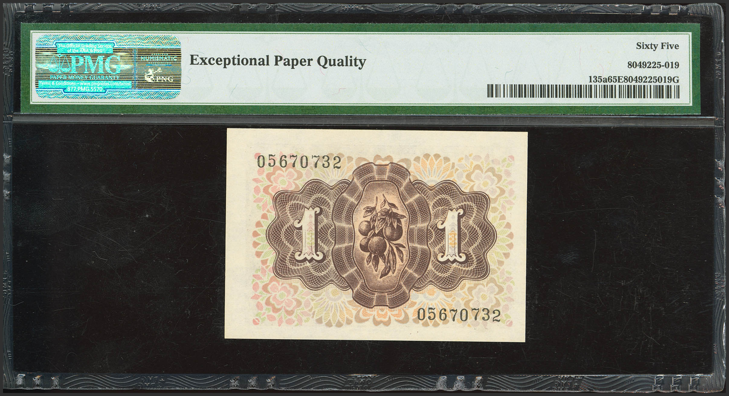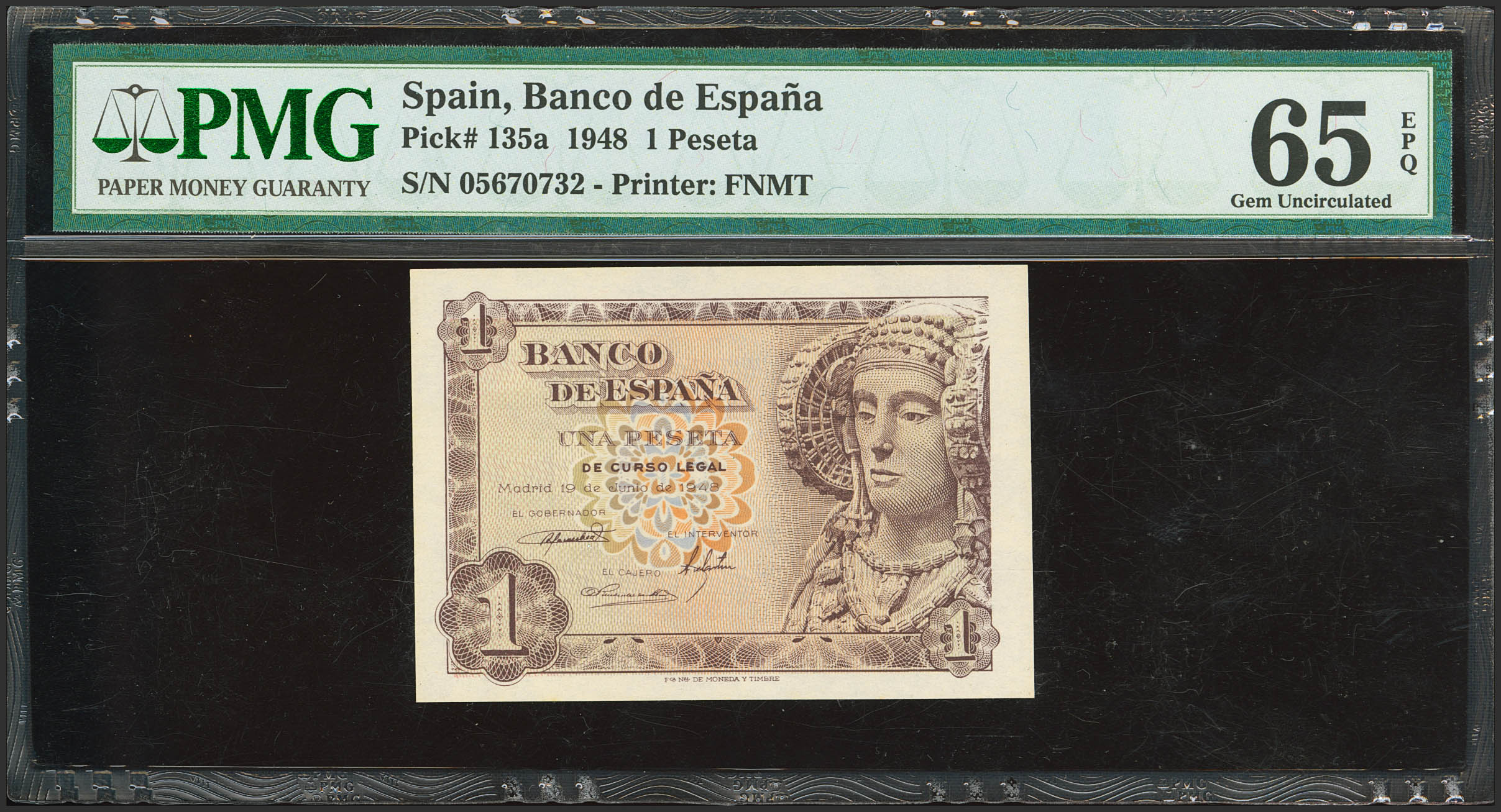 1 Peseta. June 19, 1948. No serial number. (Edifil 2023: 457, Pick: 135). Original finish. Uncirculated. PMG65EPQ encapsulation.