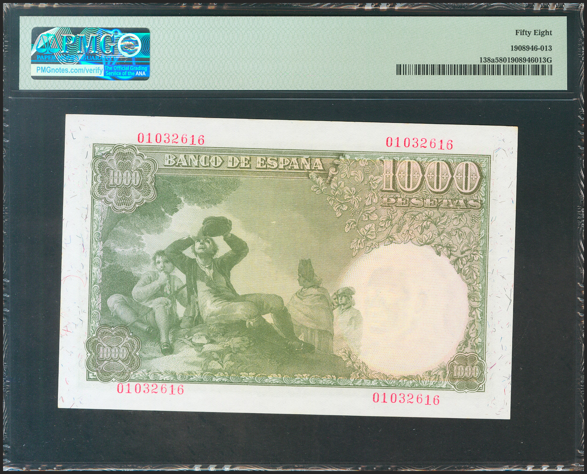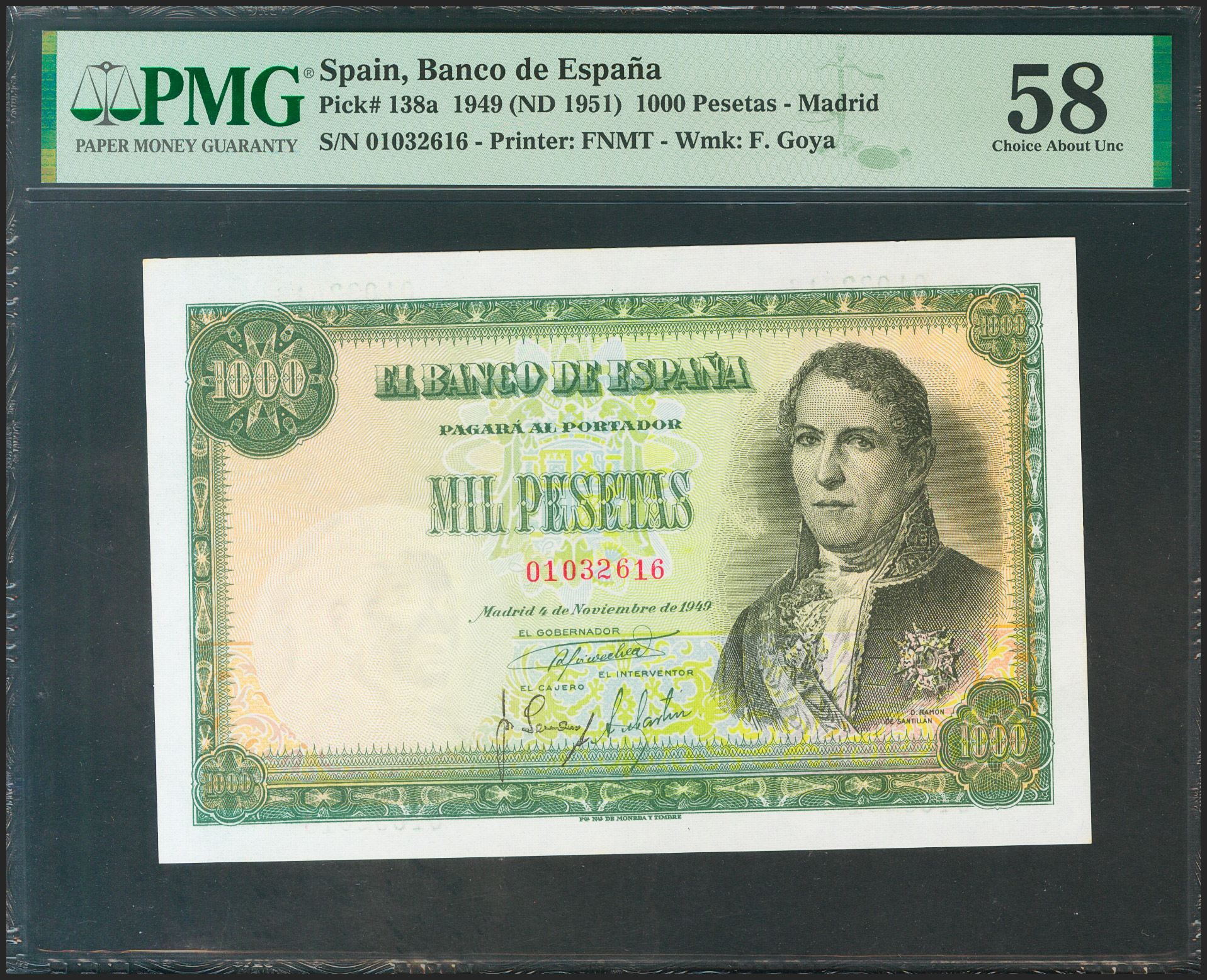 1000 Pesetas. November 4, 1949. No serial number. (Edifil 2021: 458, Pick: 138a). Unusual in this condition. Good Extremely Fine+. PMG58 package.