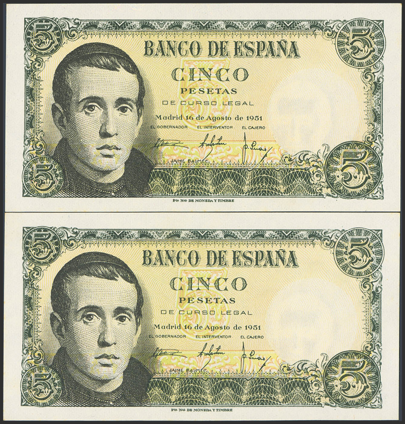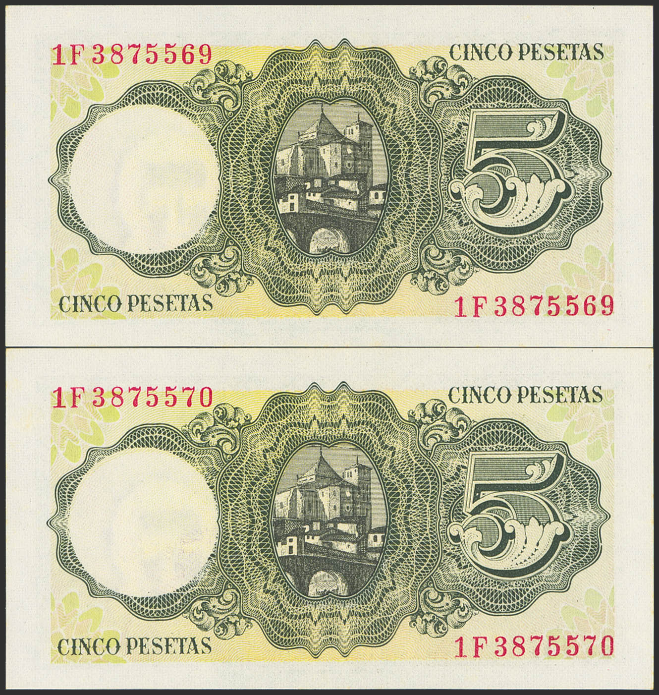5 Pesetas. August 16, 1951. Consecutive pair. Series 1F. (Edifil 2023: 459a). Original finish. Uncirculated.