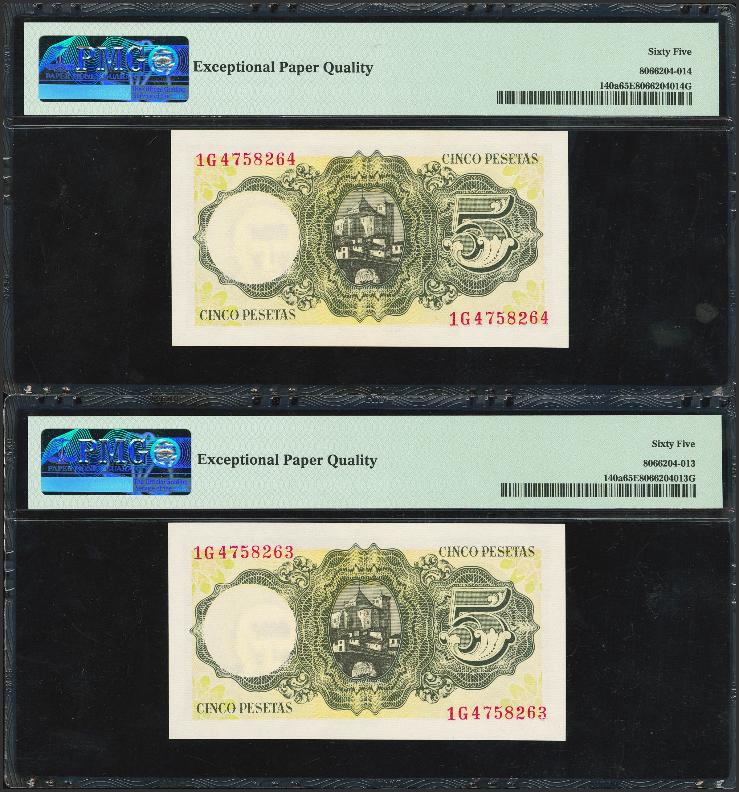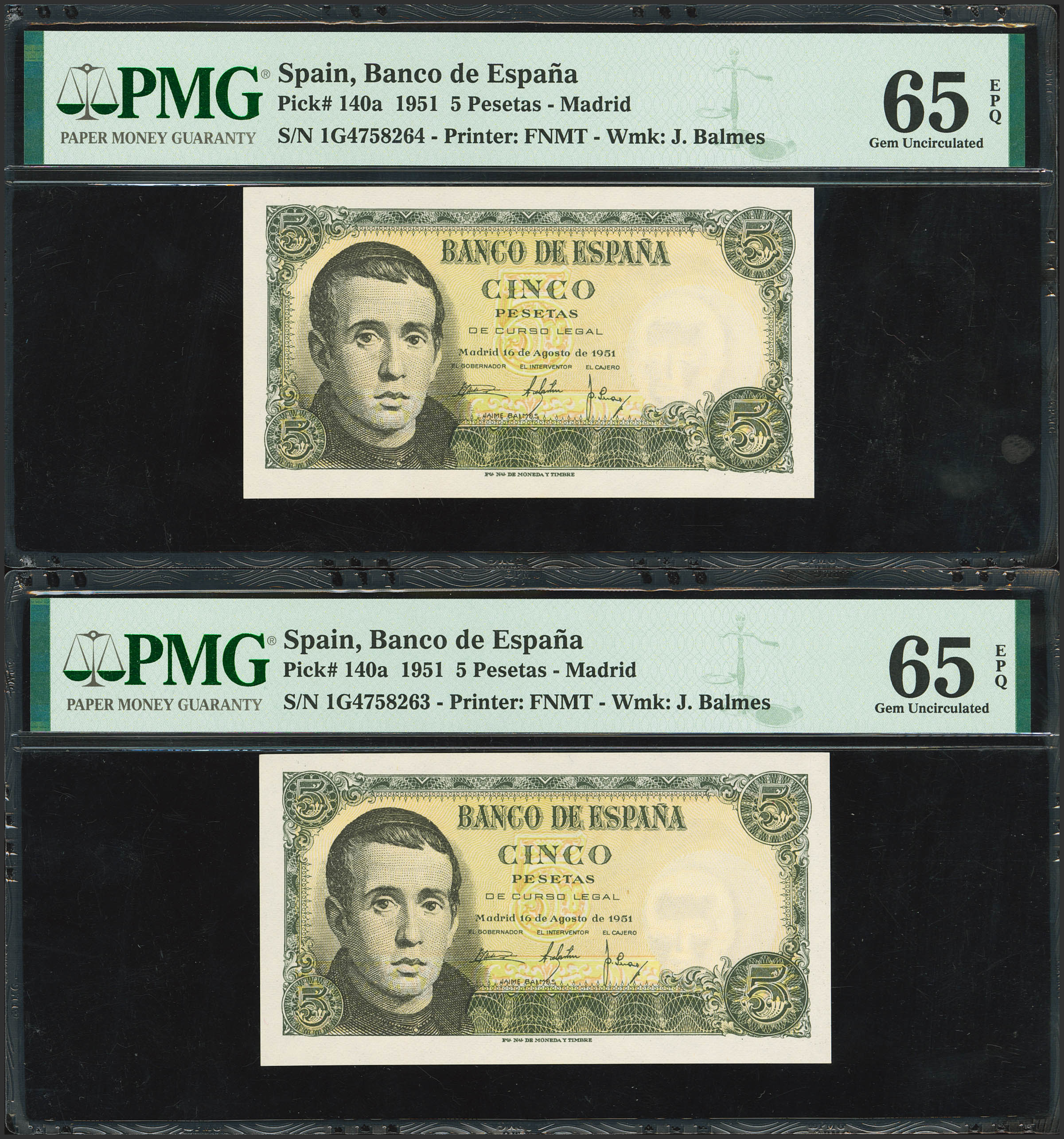 5 Pesetas. August 16, 1951. Consecutive pair. Series 1G. (Edifil 2023: 459a, Pick: 140a). Original finish. Uncirculated. PMG65EPQ capsules, both.