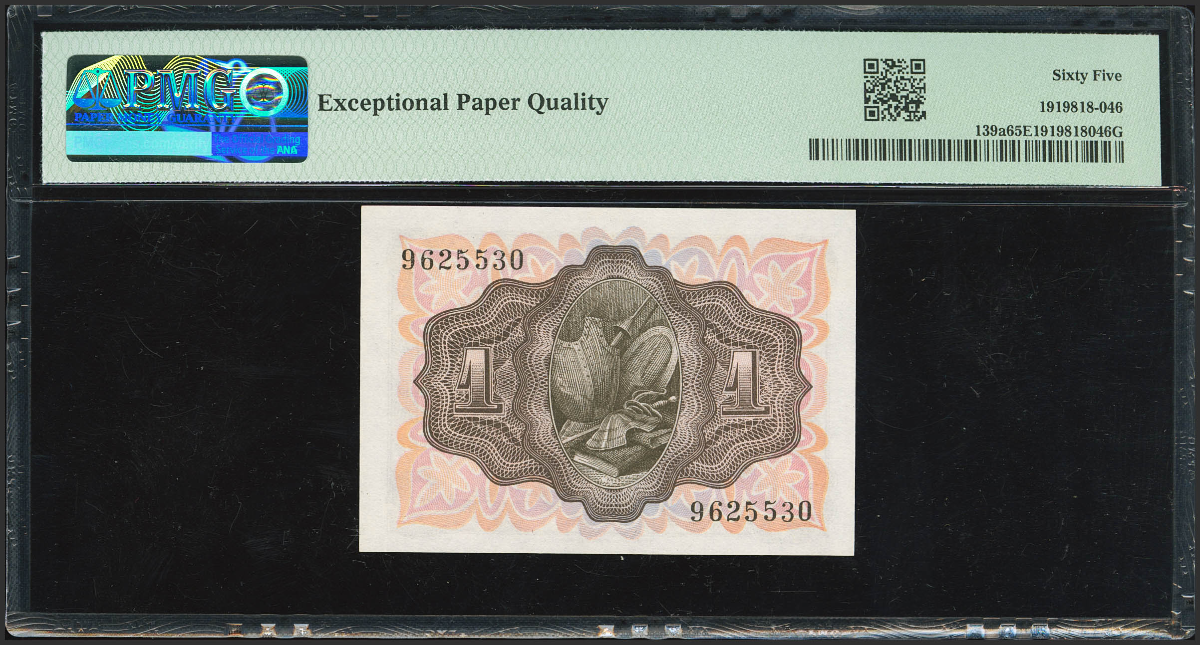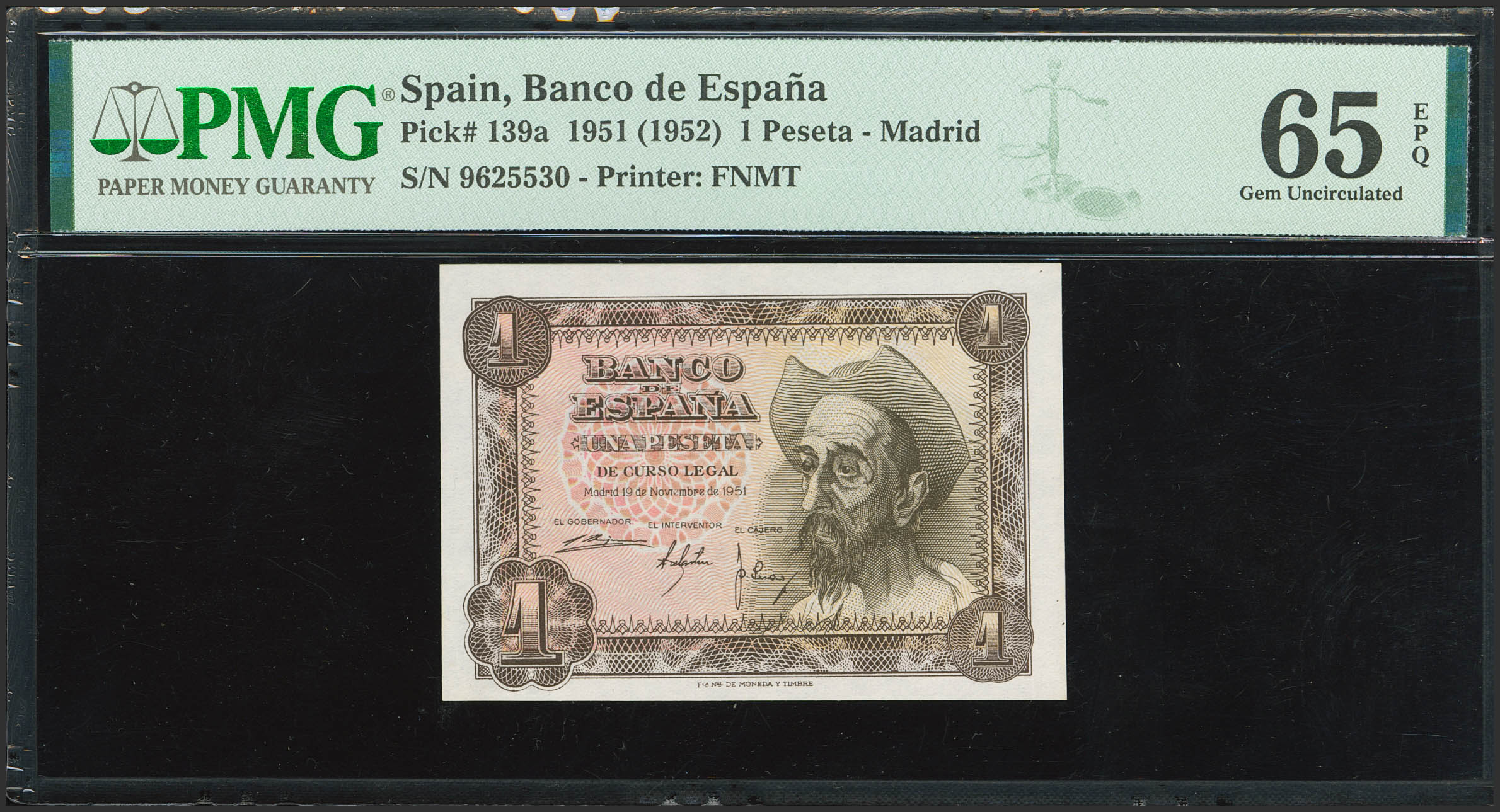1 Peseta. November 19, 1951. No serial number. (Edifil 2023: 461, Pick: 139a). Original finish. Uncirculated. PMG65EPQ encapsulation.