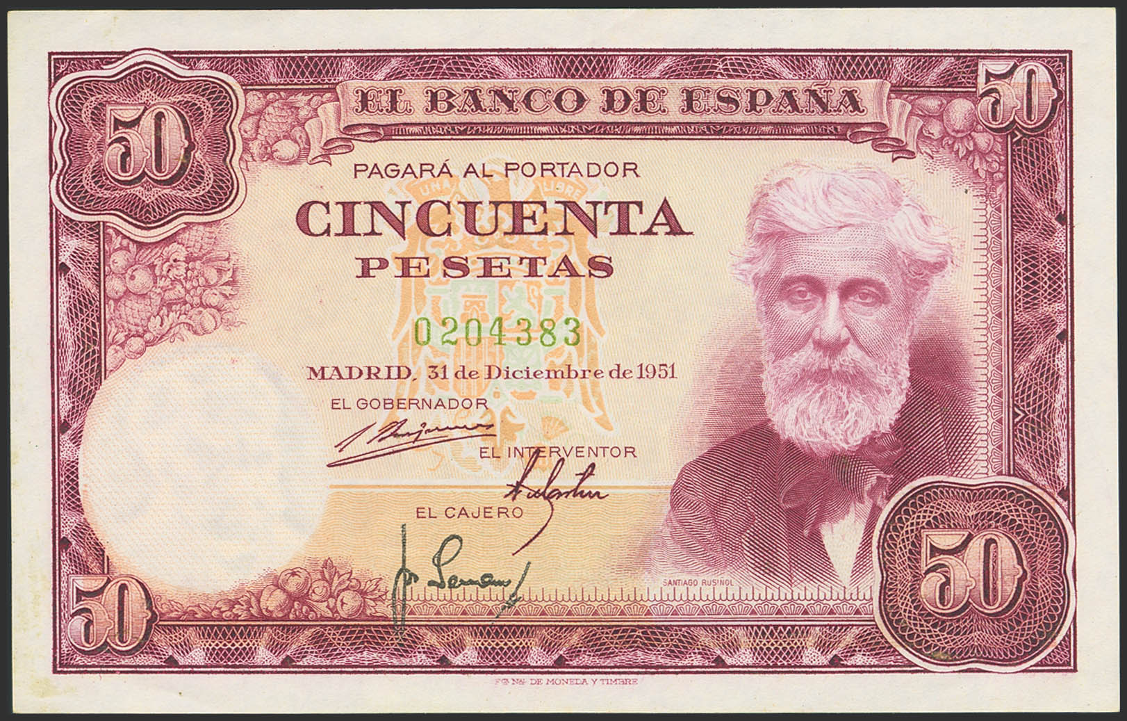 50 Pesetas. December 31, 1951. No series. (Edifil 2023: 462). Original finish. Uncirculated-.