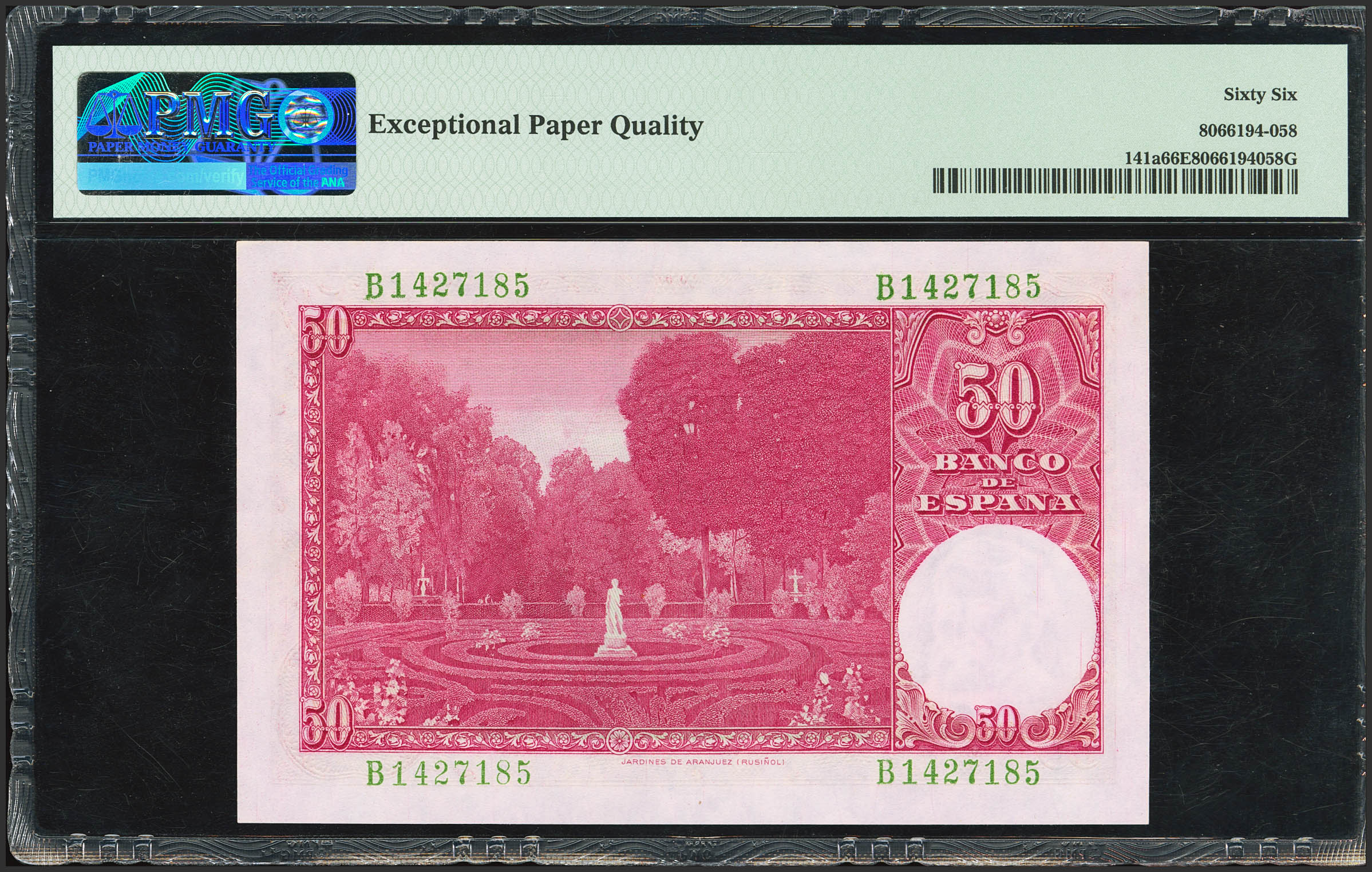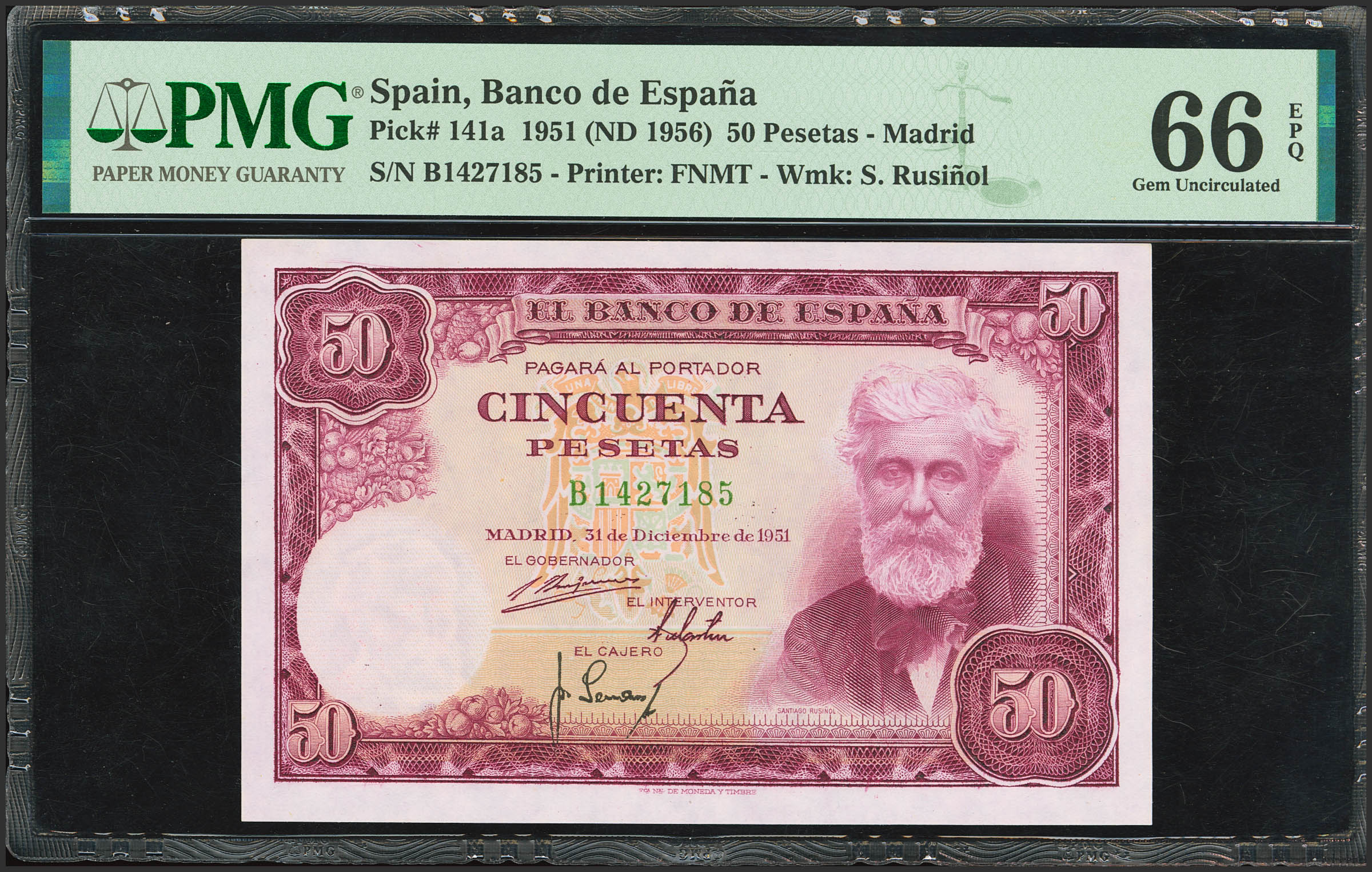 English 50 Pesetas. December 31, 1951. Series B. (Edifil 2023: 462a, Pick: 141a). Unusual in this condition, original finish. Uncirculated. PMG66EPQ capsule.