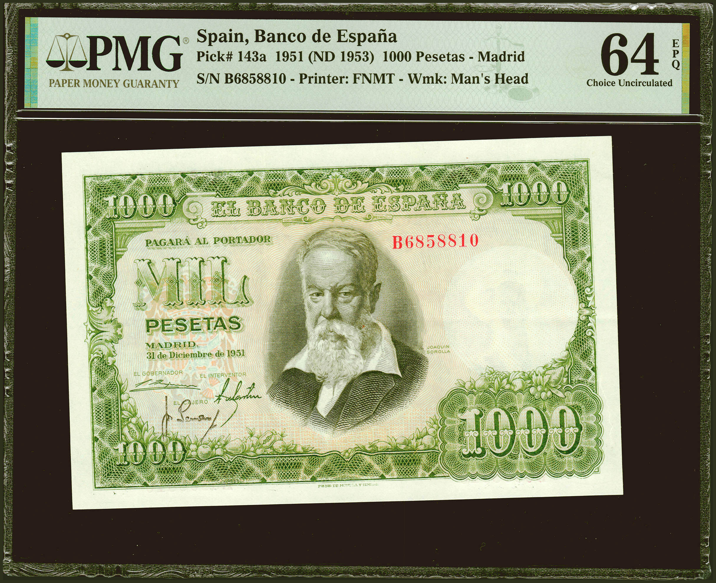 1000 Pesetas. December 31, 1951. Series B. (Edifil 2021: 463a, Pick: 143a). Original finish. Uncirculated. PMG64EPQ encapsulation.
