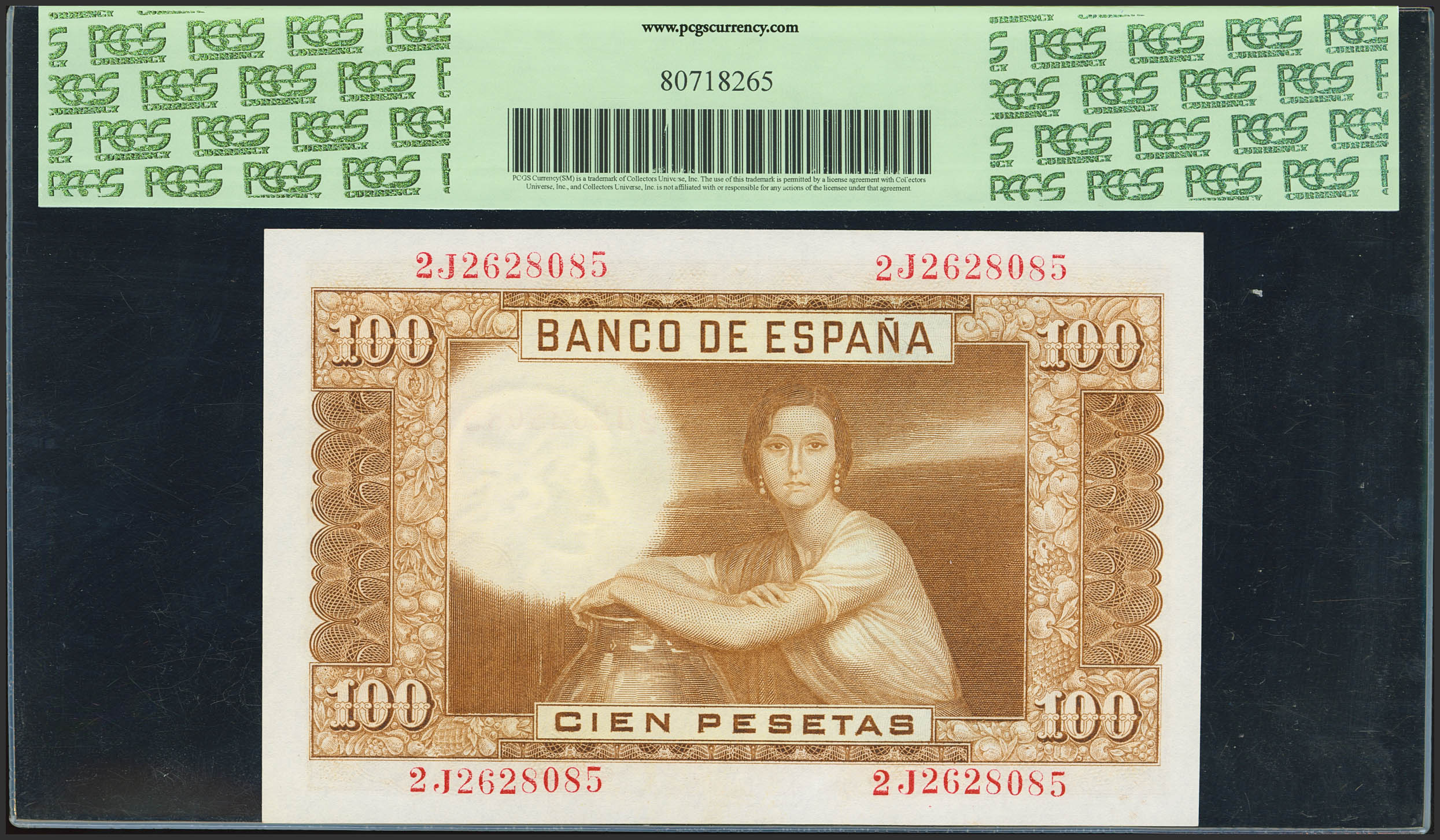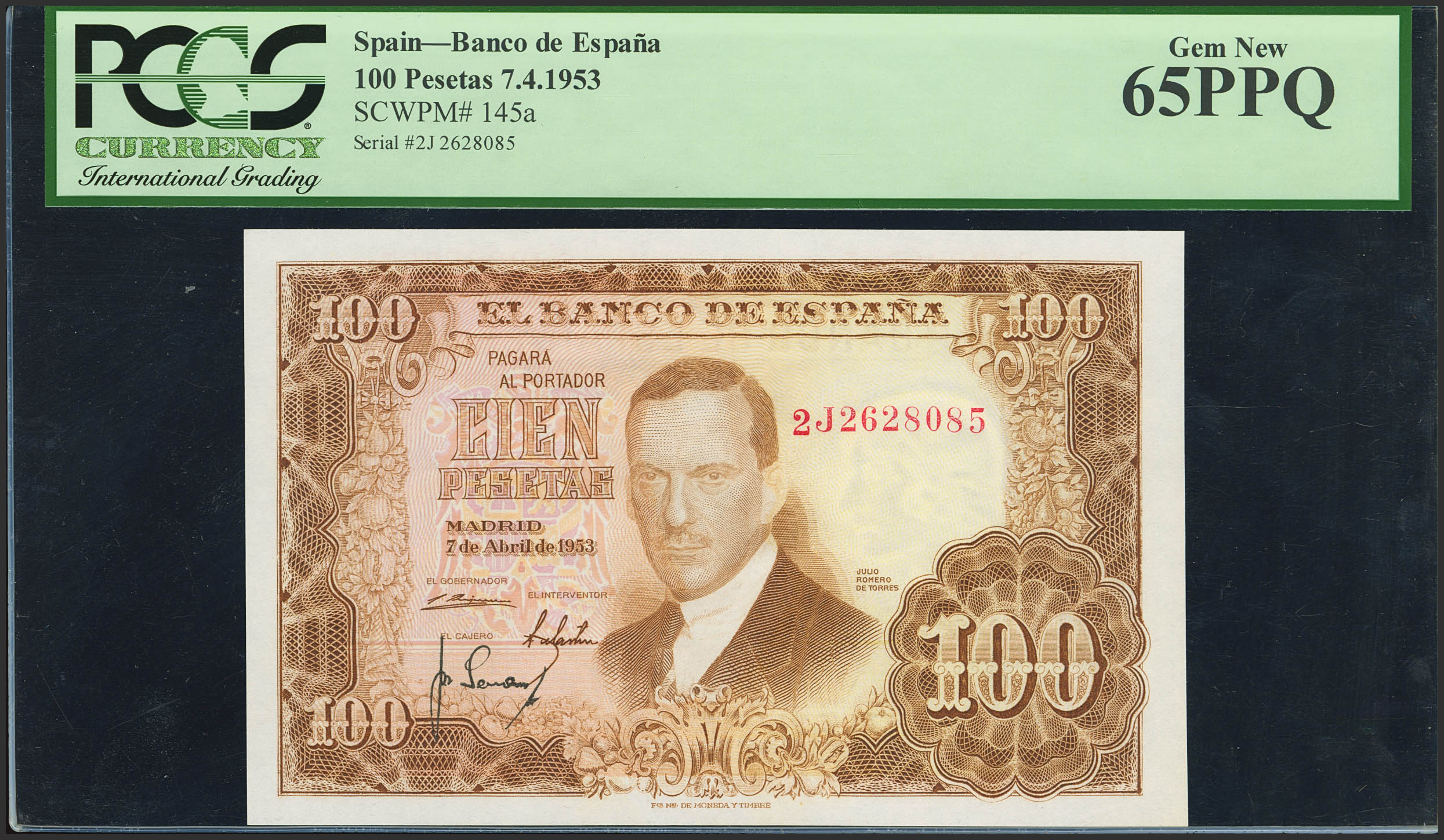 English 100 Pesetas. April 7, 1953. Series 2J. (Edifil 2023: 464c). Original finish. Uncirculated. PCGS65PPQ encapsulation.