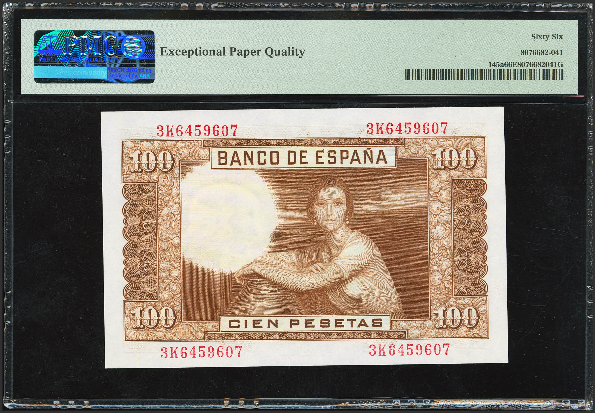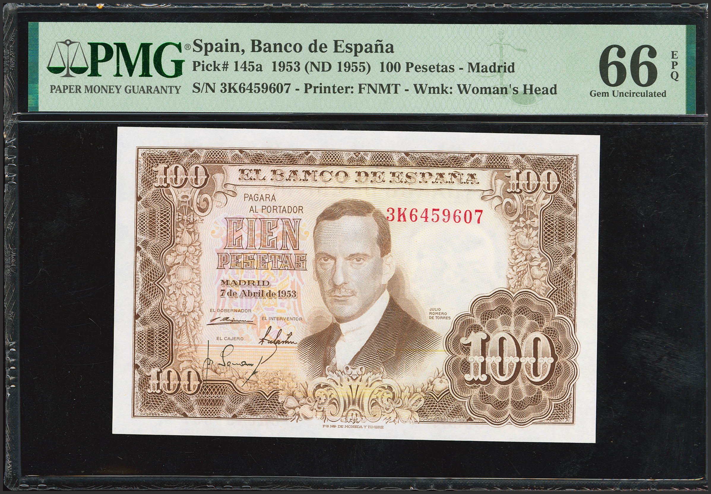 English 100 Pesetas. April 7, 1953. Series 3K. (Edifil 2023: 464b, Pick: 145a). Original finish. Uncirculated. PMG66EPQ capsule.