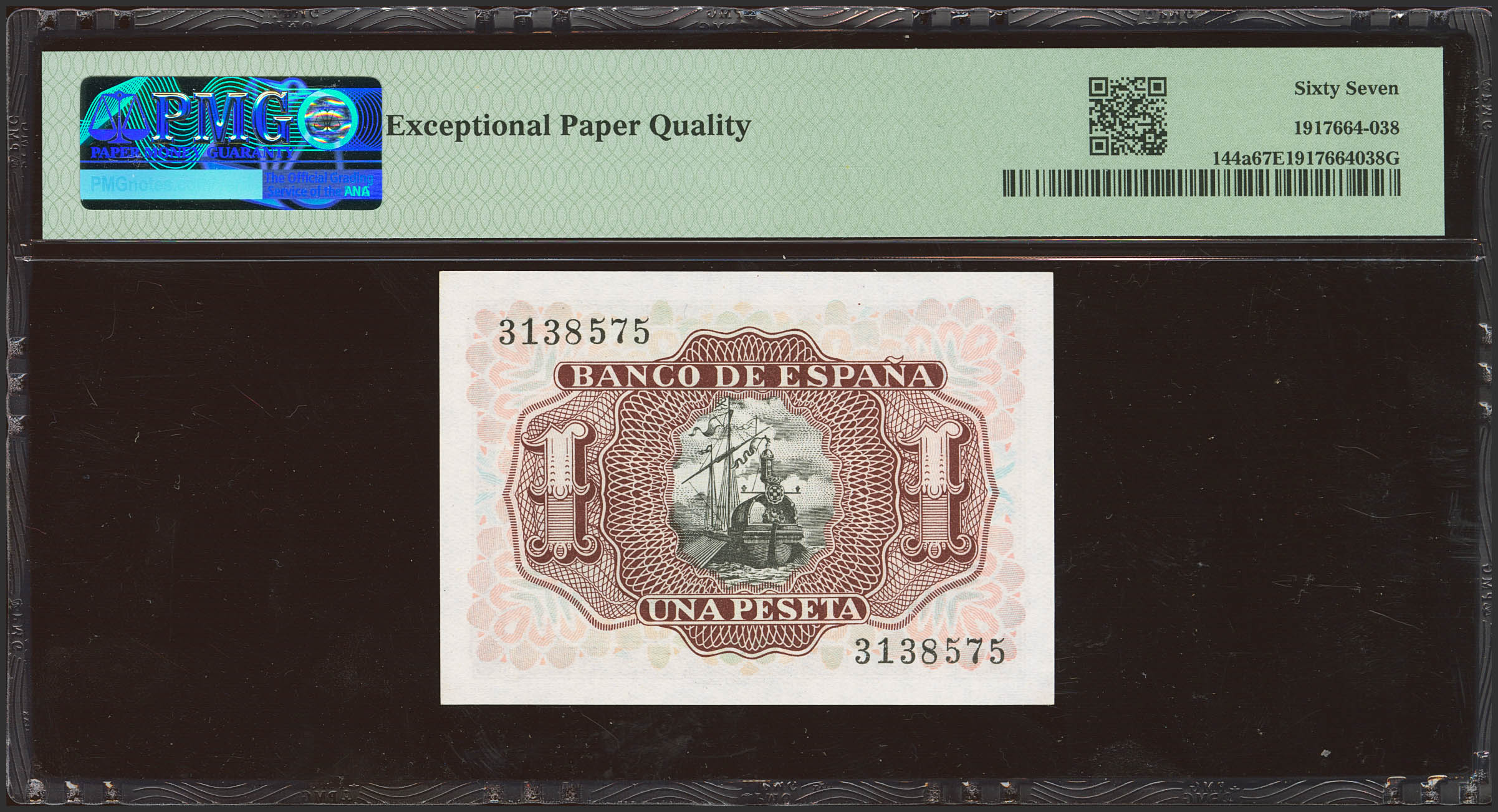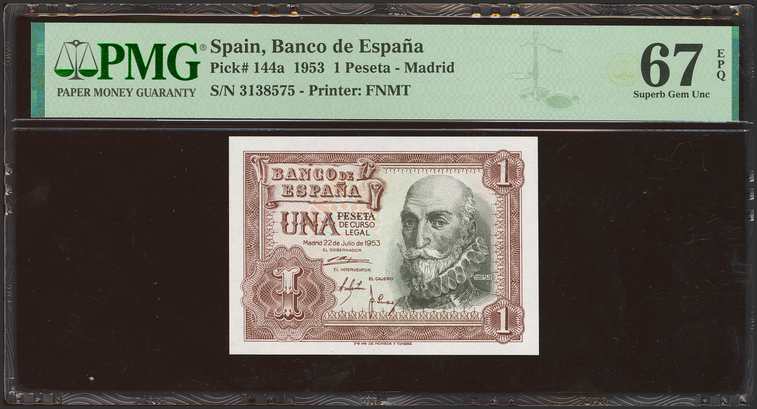 English 1 Peseta. July 22, 1953. No serial number. (Edifil 2023: 465, Pick: 144a). Rare in this condition, original finish. Uncirculated. Encapsulated PMG67EPQ.