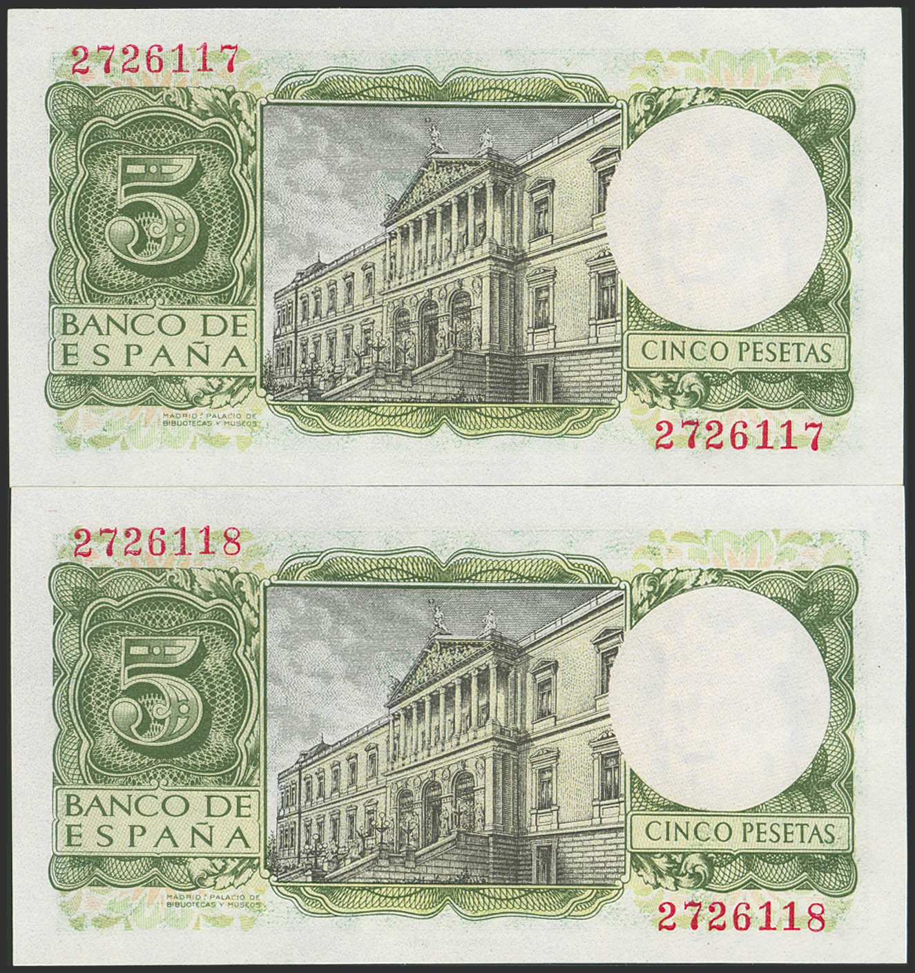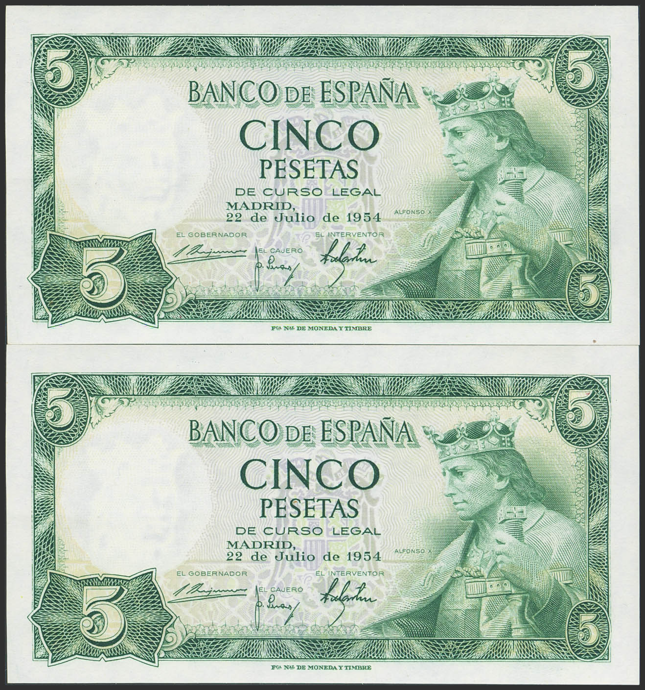 English 5 Pesetas. July 23, 1954. Consecutive pair. No series. (Edifil 2023: 466). Original finish. Uncirculated-.