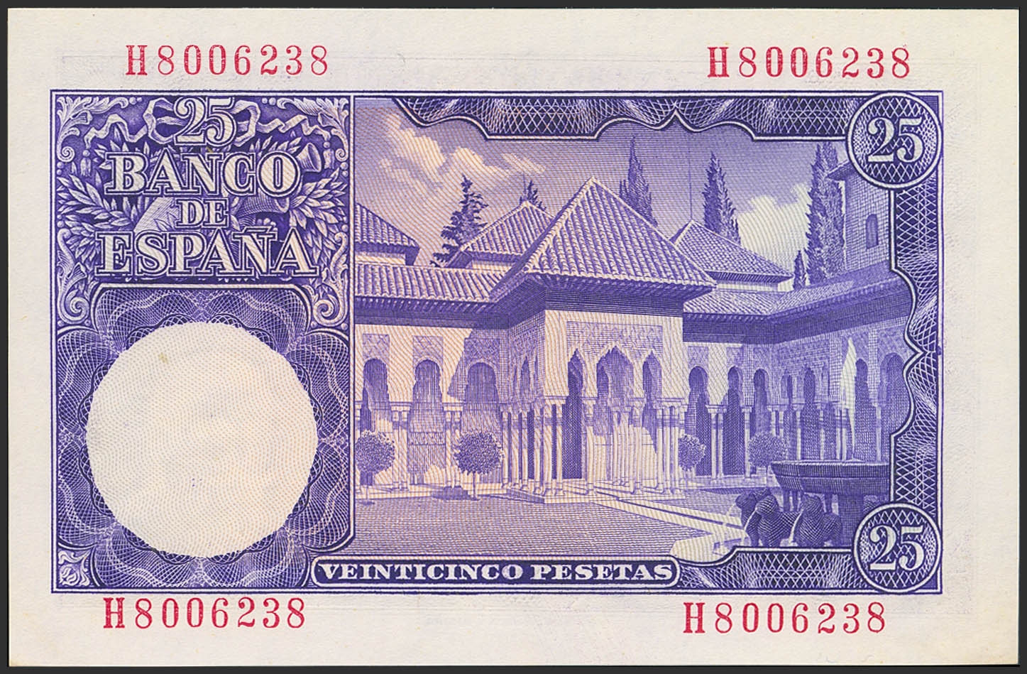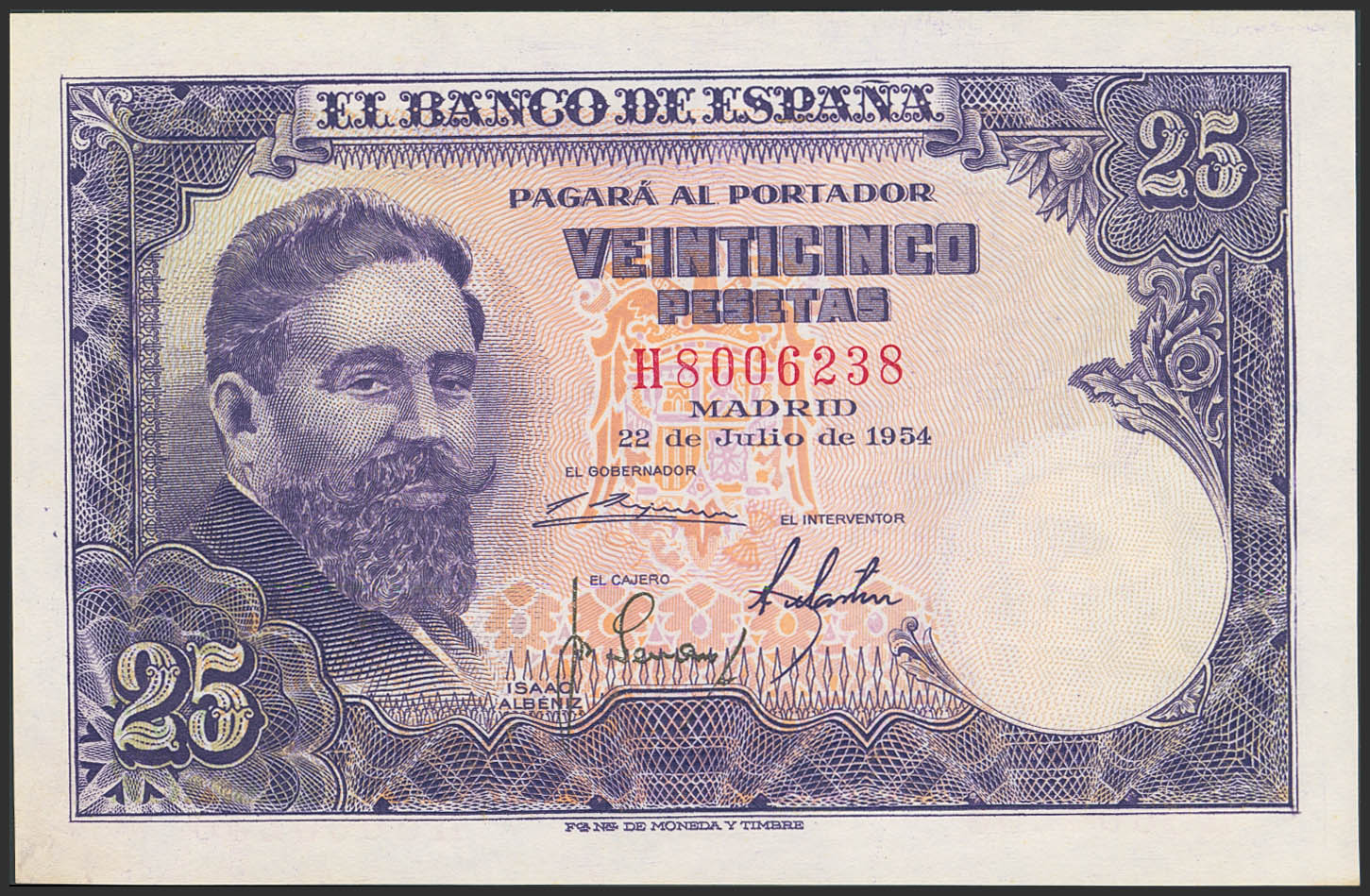 English 25 Pesetas. July 22, 1954. Series H. (Edifil 2023: 467a). Original finish. Uncirculated.