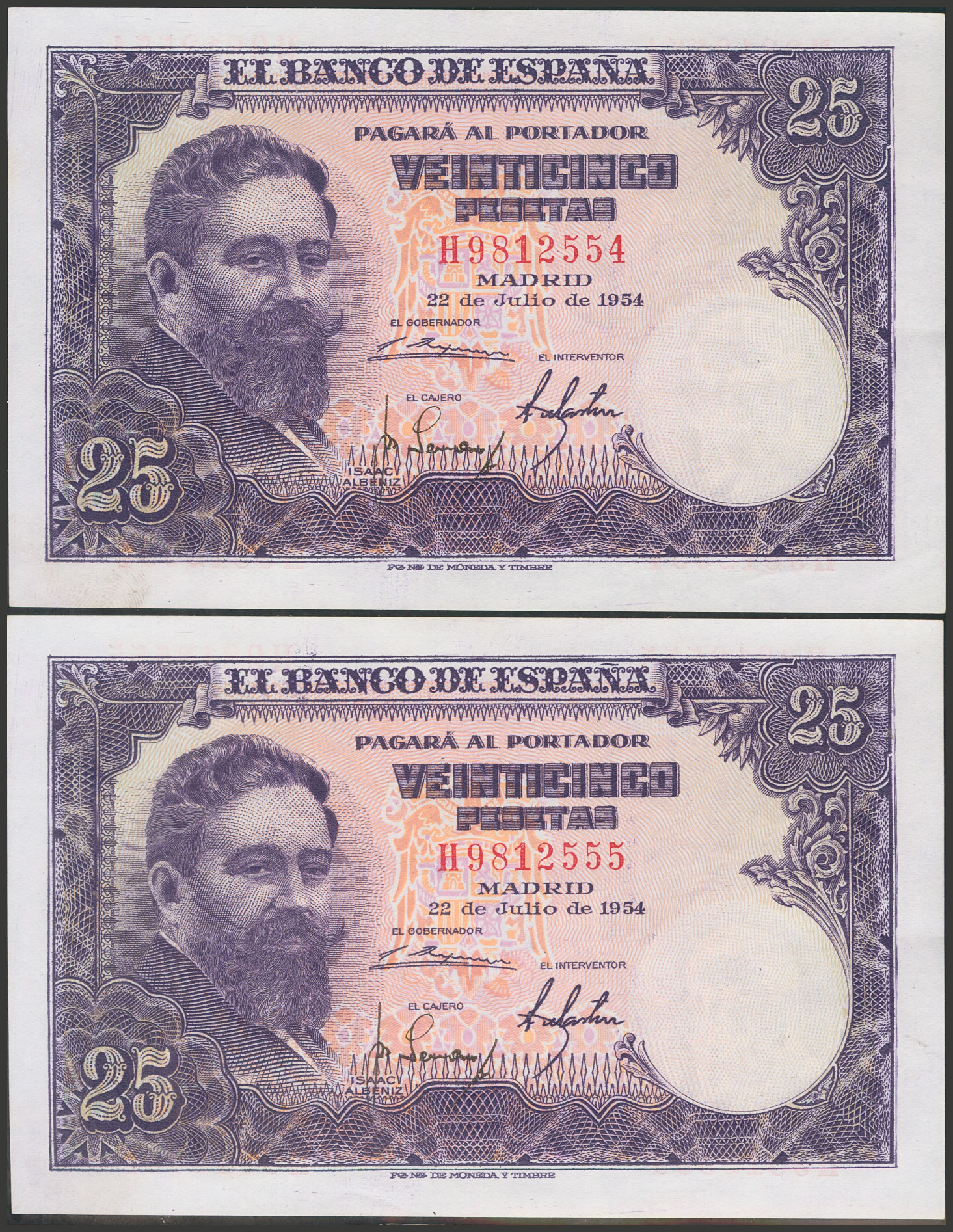25 Pesetas. July 22, 1954. Consecutive pair. Series H. (Edifil 2017: 467a). Retains all its original finish. Uncirculated-.