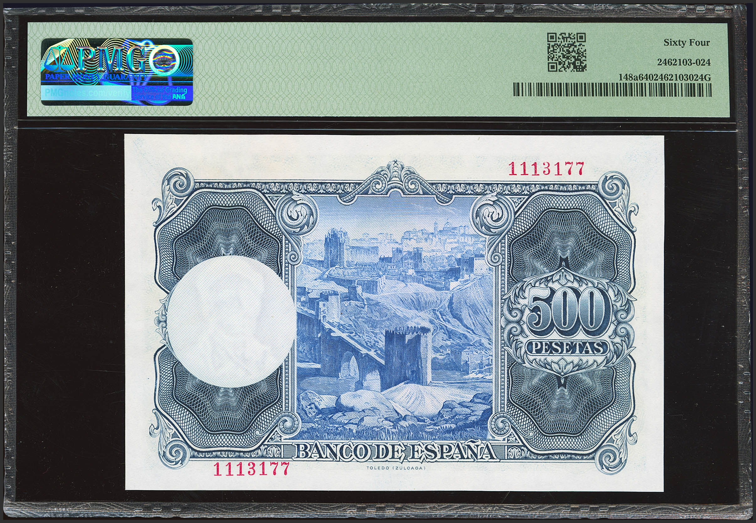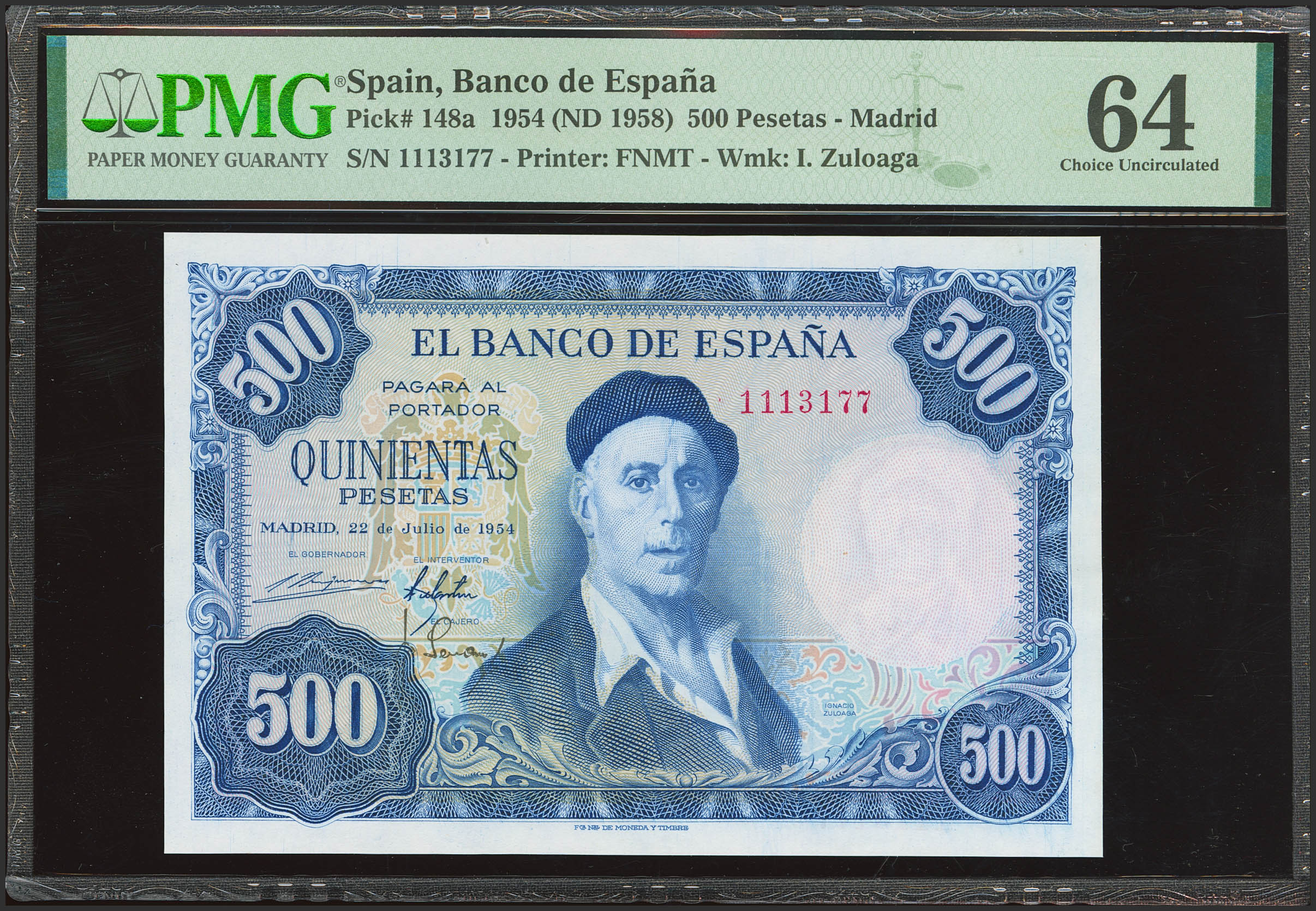 500 Pesetas. July 22, 1954. No serial number. (Edifil 2023: 468, Pick: 148a). Rare in this condition. Uncirculated. PMG64 package.