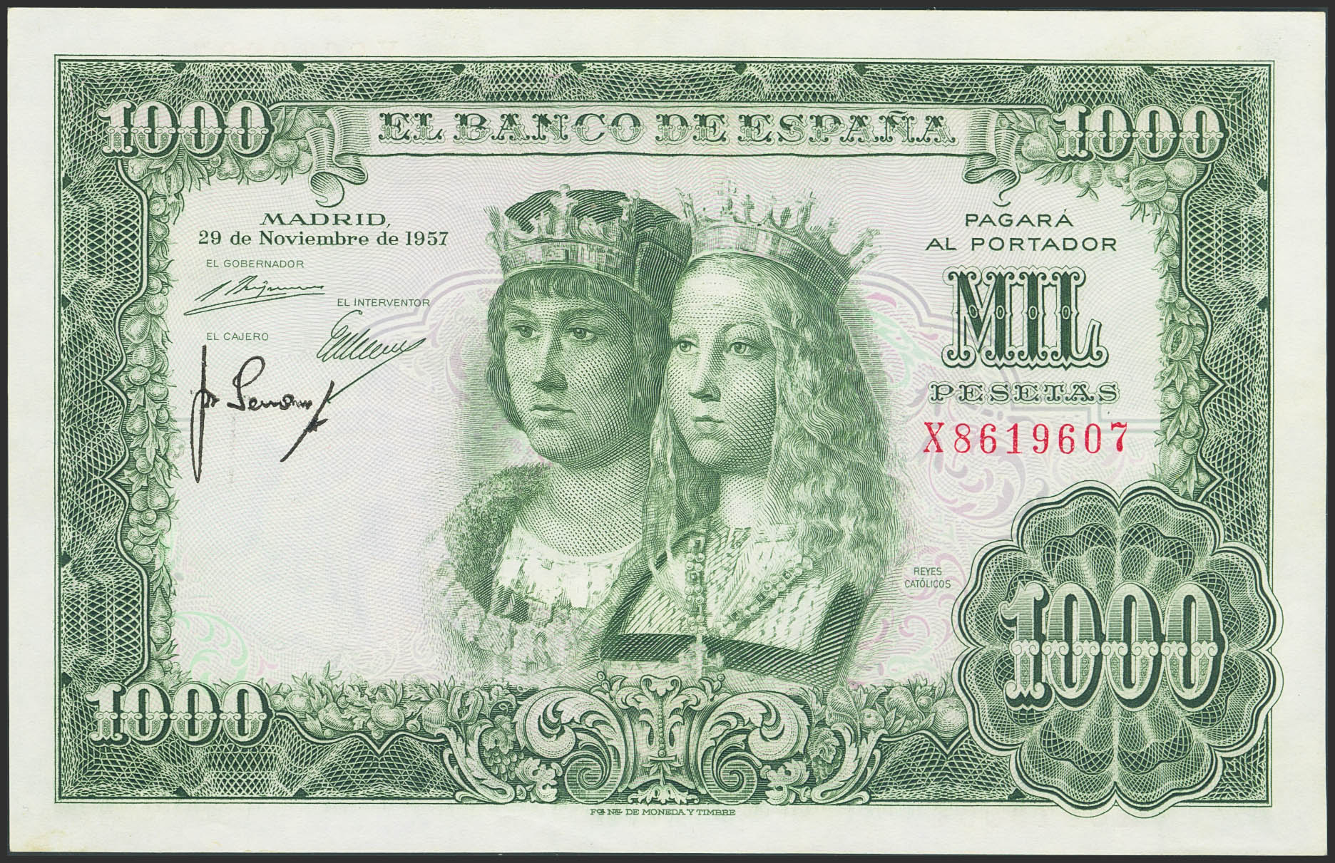 1000 Pesetas. November 29, 1957. Series X. (Edifil 2023: 469b). Original condition. EF+.