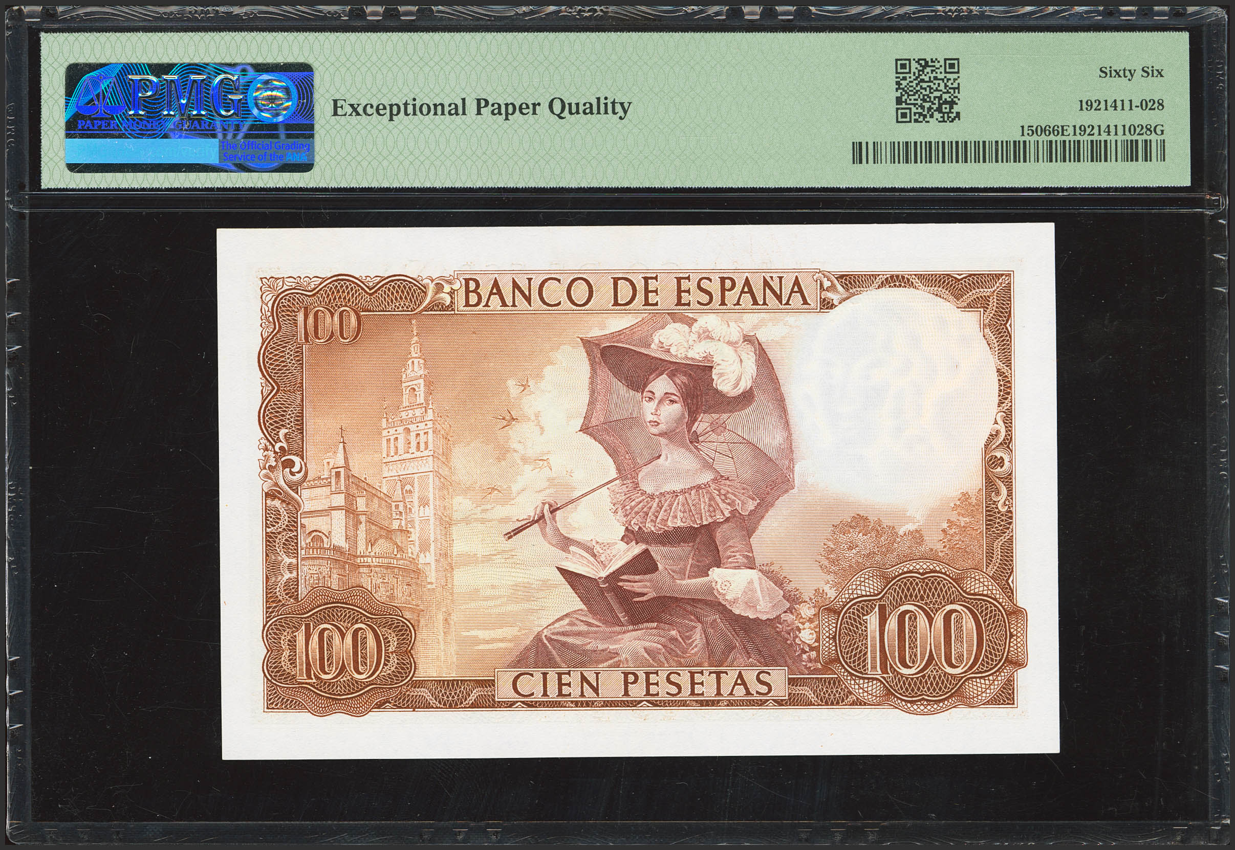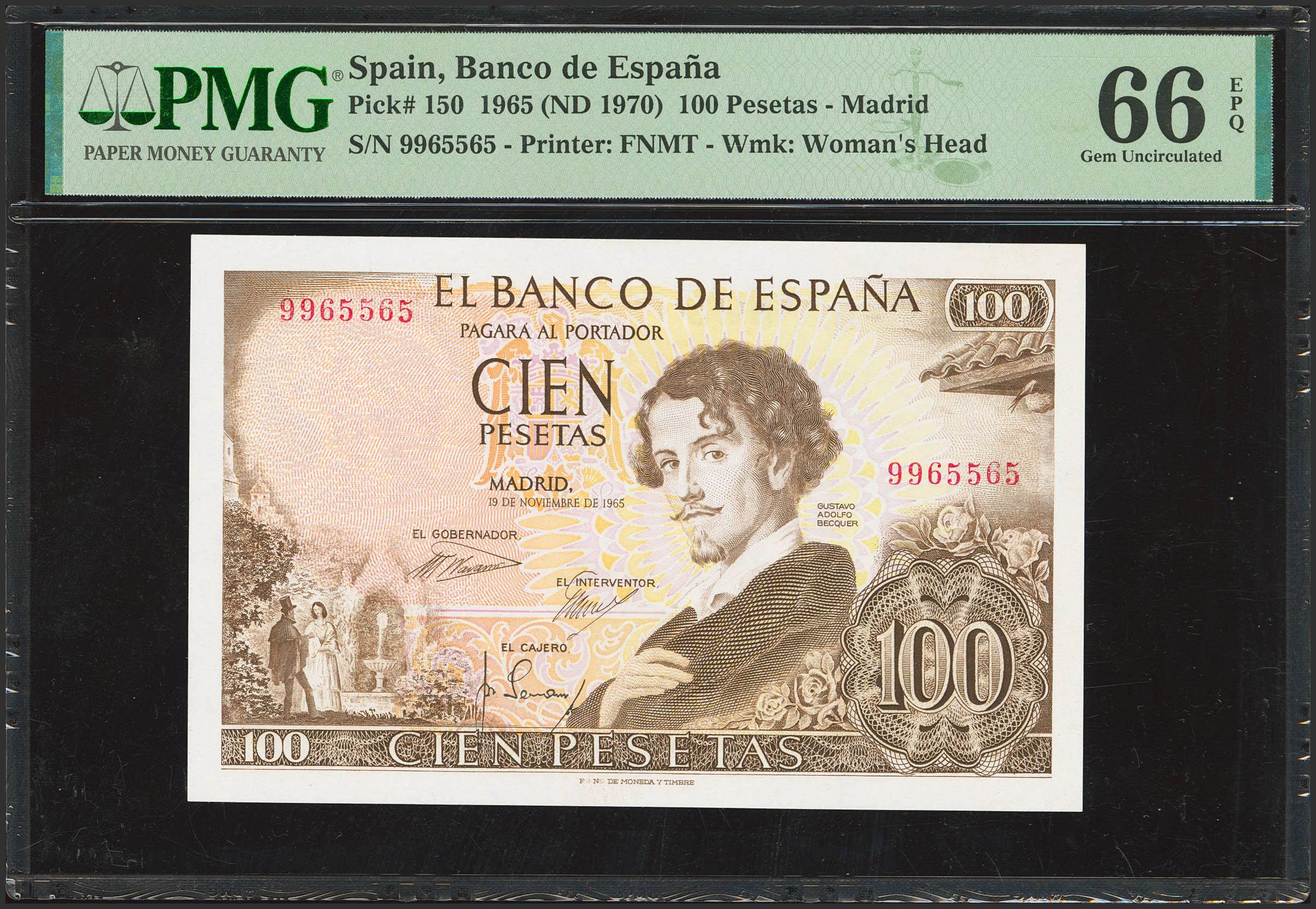 100 Pesetas. November 19, 1965. No serial number. (Edifil 2023: 470, Pick: 150). Original finish. Uncirculated. PMG66EPQ capsule.