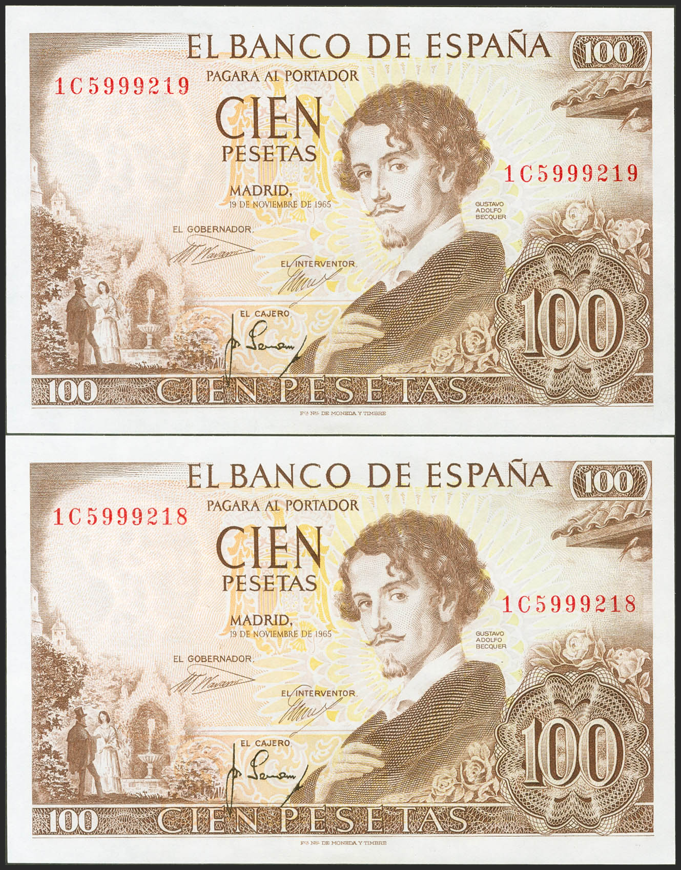 100 Pesetas. November 19, 1965. Consecutive pair. Series 1C. (Edifil 2021: 470a). Retains all its original finish. Uncirculated.