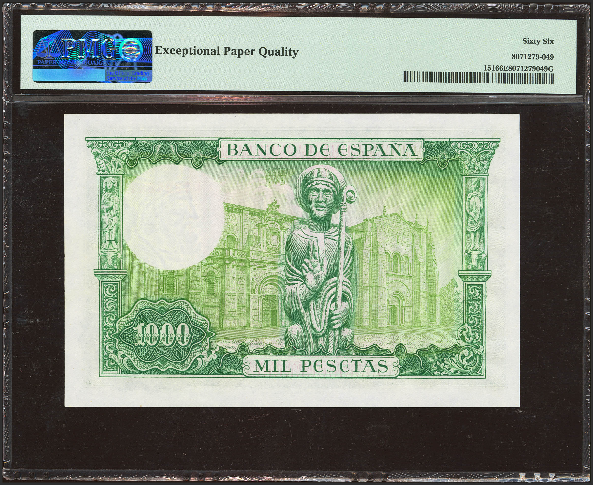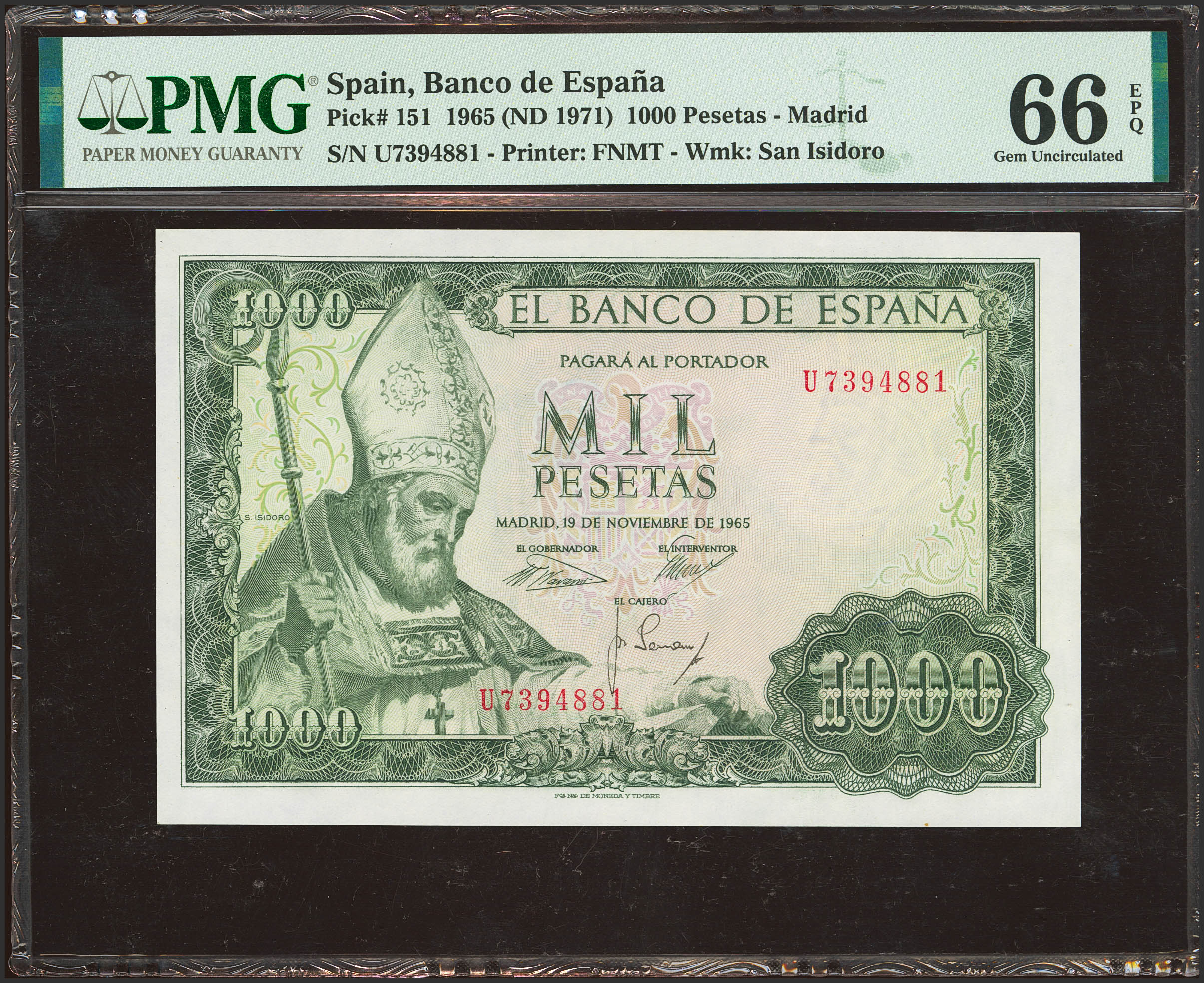 1000 Pesetas. November 19, 1965. Series U. (Edifil 2023: 471b, Pick: 151). Rare in this exceptional condition, original finish. Uncirculated. PMG66EPQ capsule.