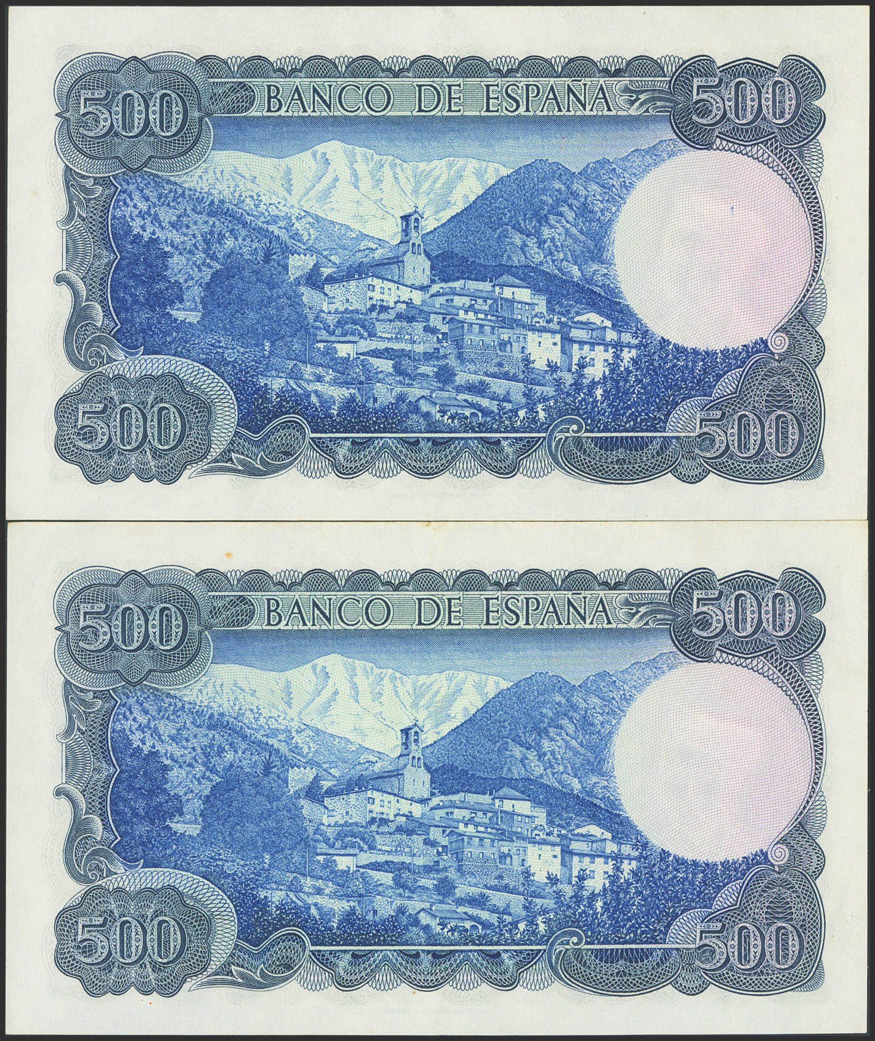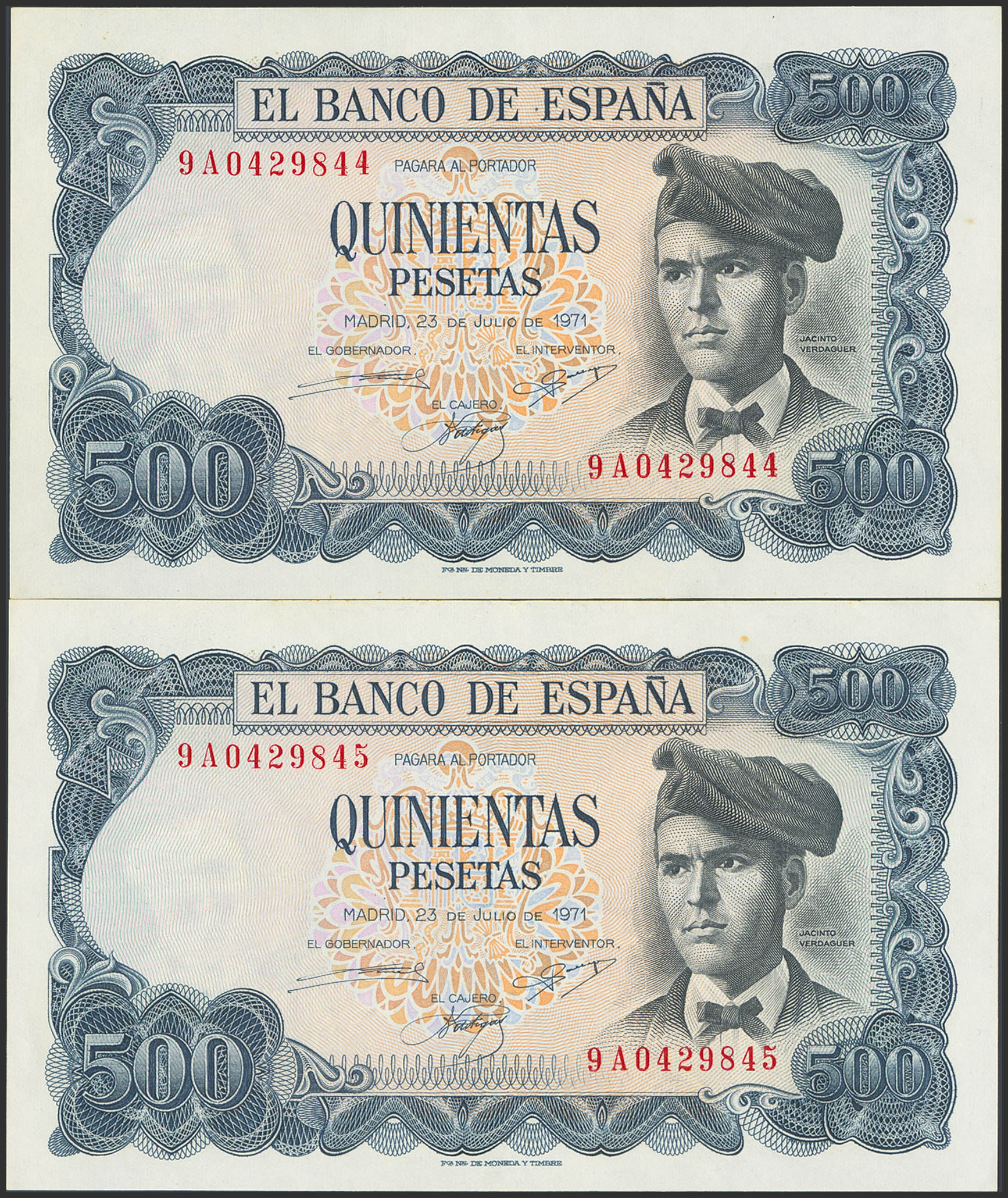 500 Pesetas. July 23, 1971. Consecutive pair. Special Series 9A. (Edifil 2023: 473b). Retains all its original finish. Extremely Fine.