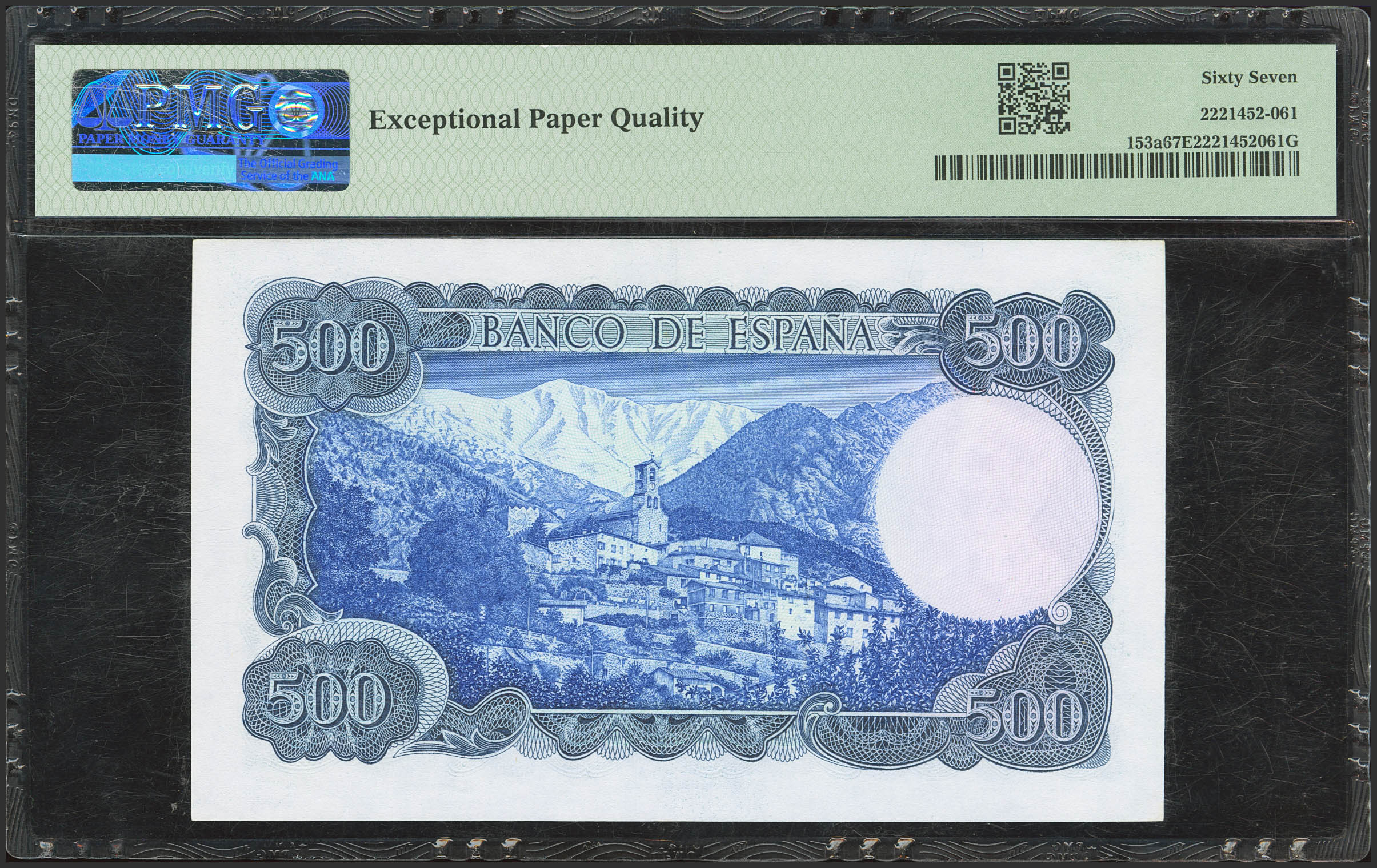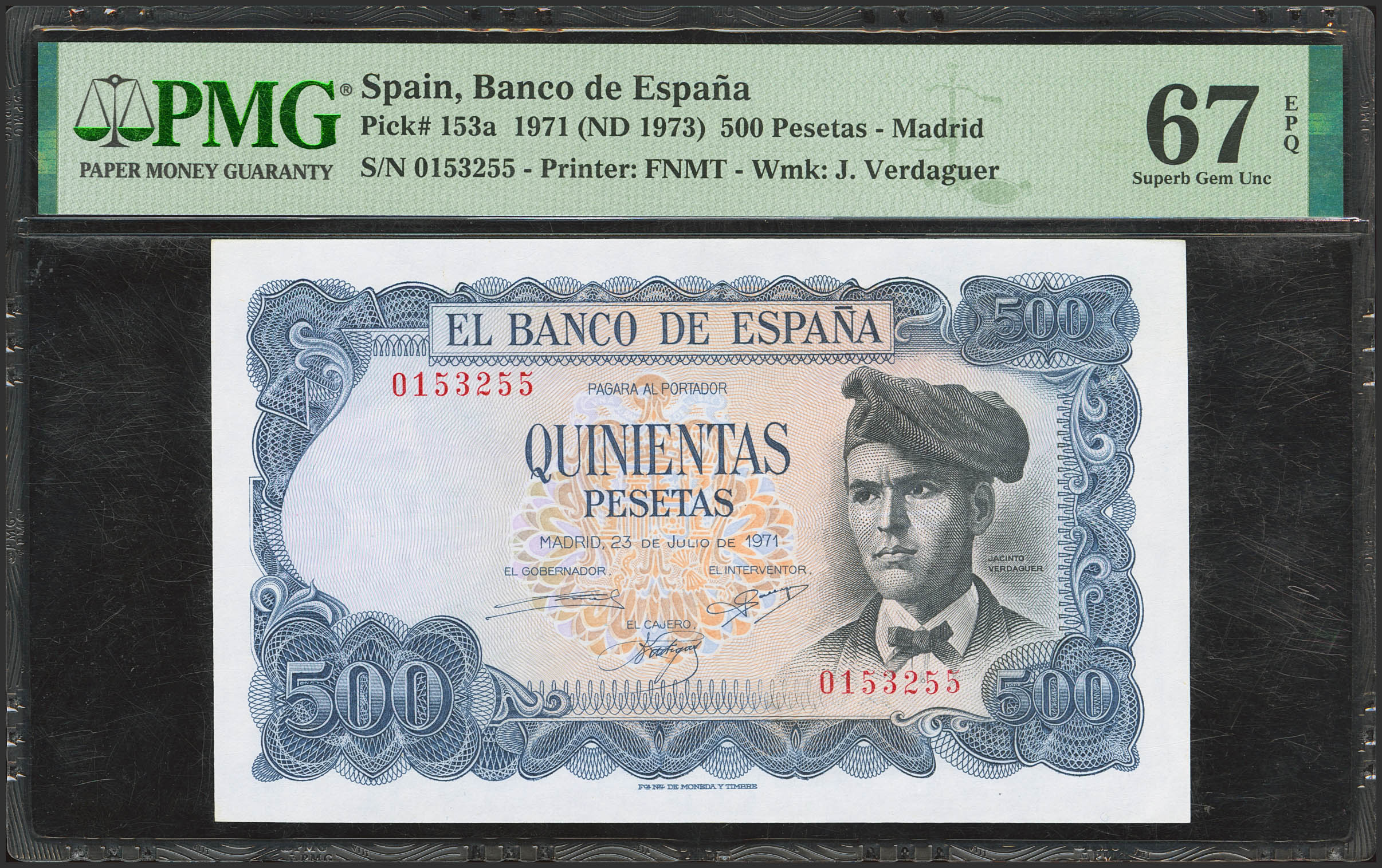 English 500 Pesetas. July 23, 1971. No serial number. (Edifil 2023: 473, Pick: 153a). Original finish. Uncirculated. PMG67EPQ encapsulated.