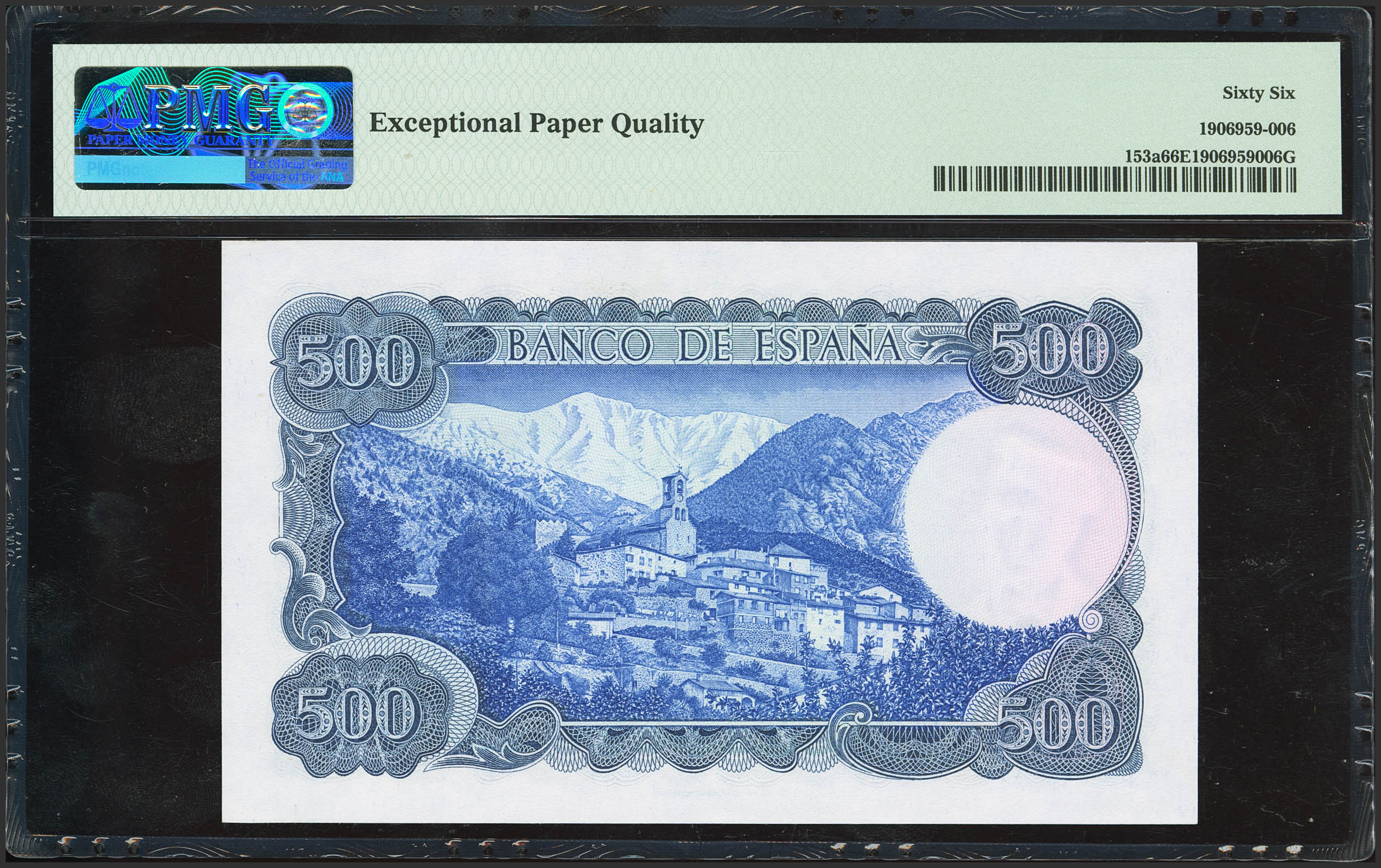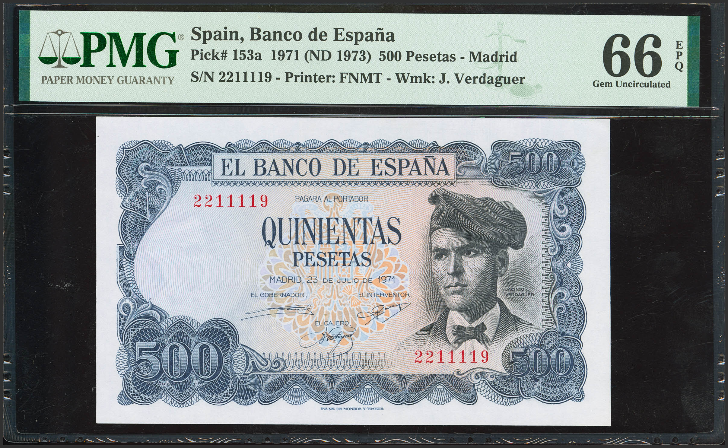 English 500 Pesetas. July 23, 1971. No serial number. (Edifil 2023: 473, Pick: 153a). Original finish. Uncirculated. PMG66EPQ capsule.