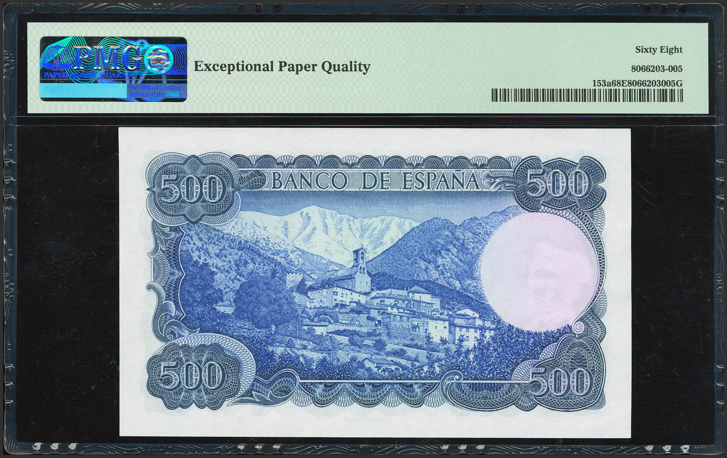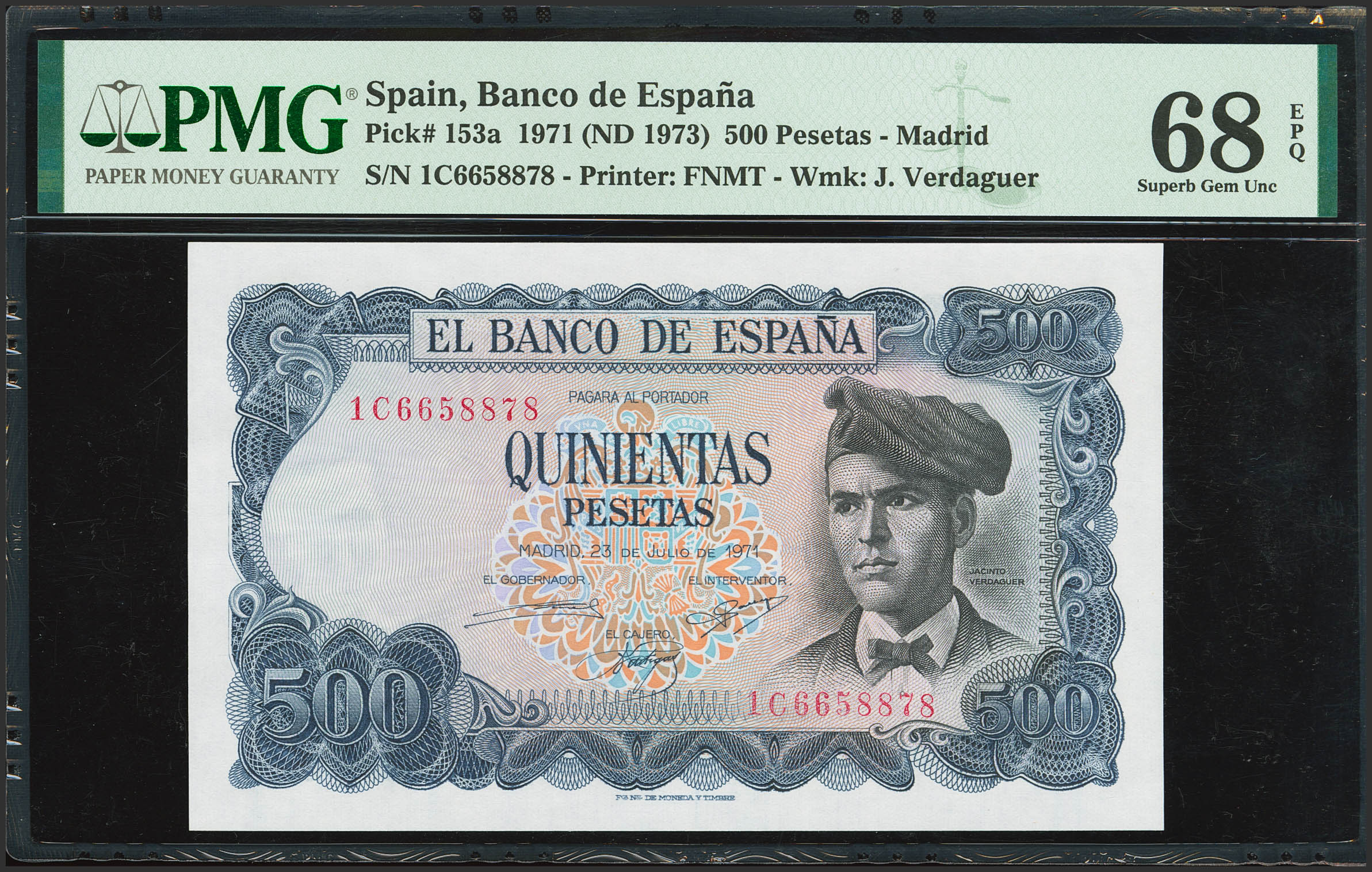English 500 Pesetas. July 23, 1971. Series 1C. (Edifil 2023: 473a, Pick: 153a). Original finish. Uncirculated. PMG68EPQ encapsulation.