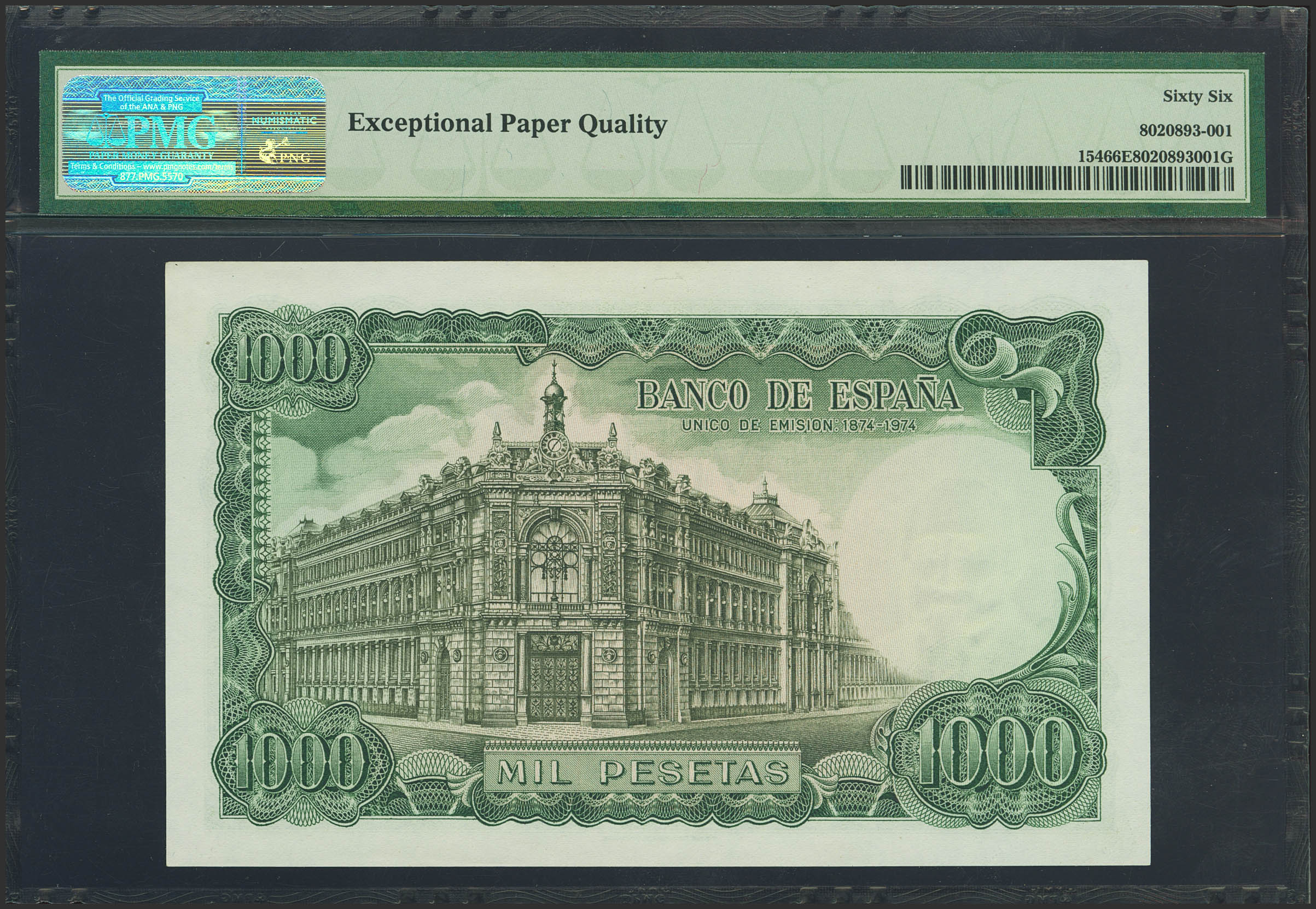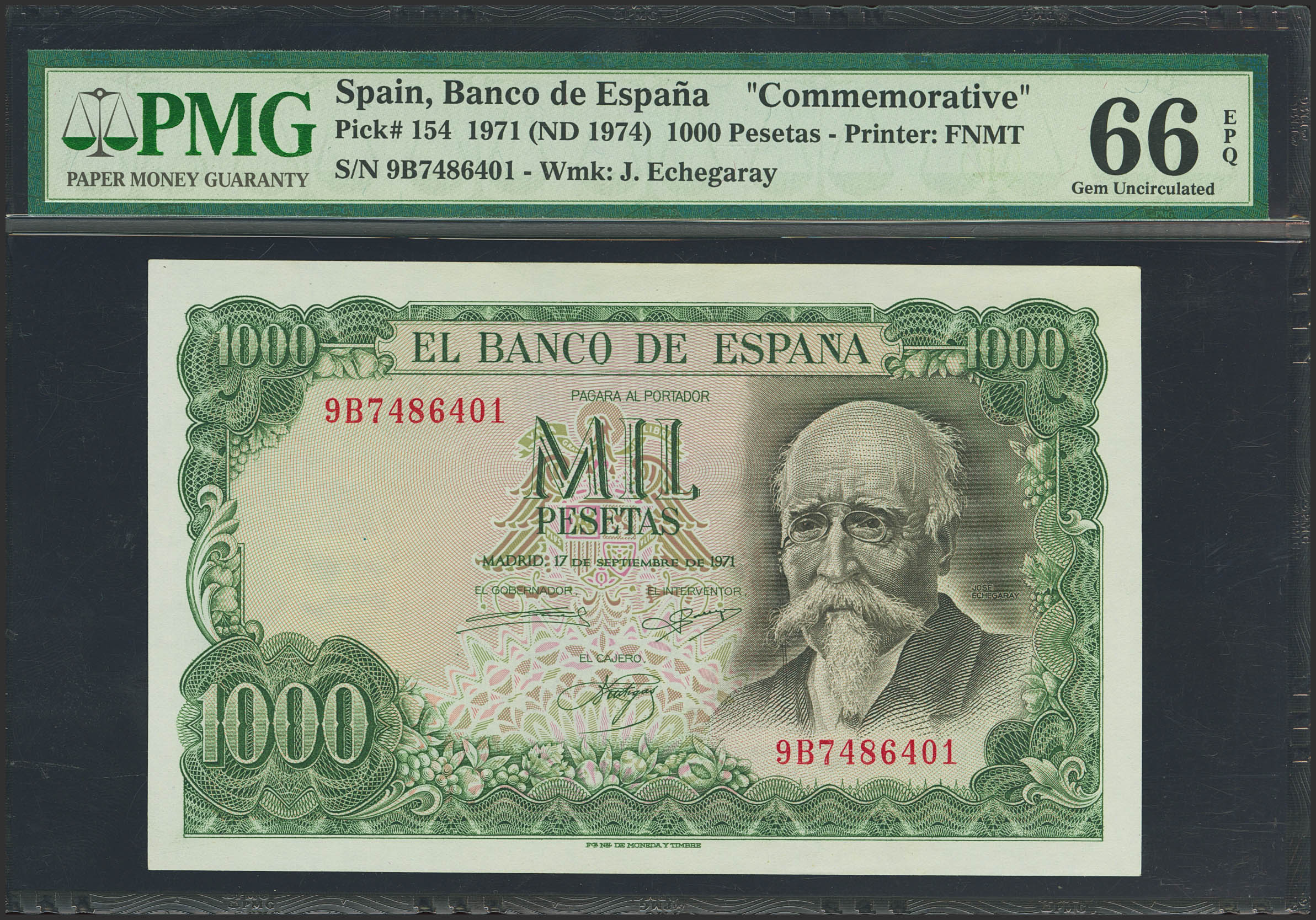 English 1000 Pesetas. September 17, 1971. Special Series 9B. (Edifil 2023: 474d, Pick: 154*). Original finish. Uncirculated. PMG66EPQ capsule.