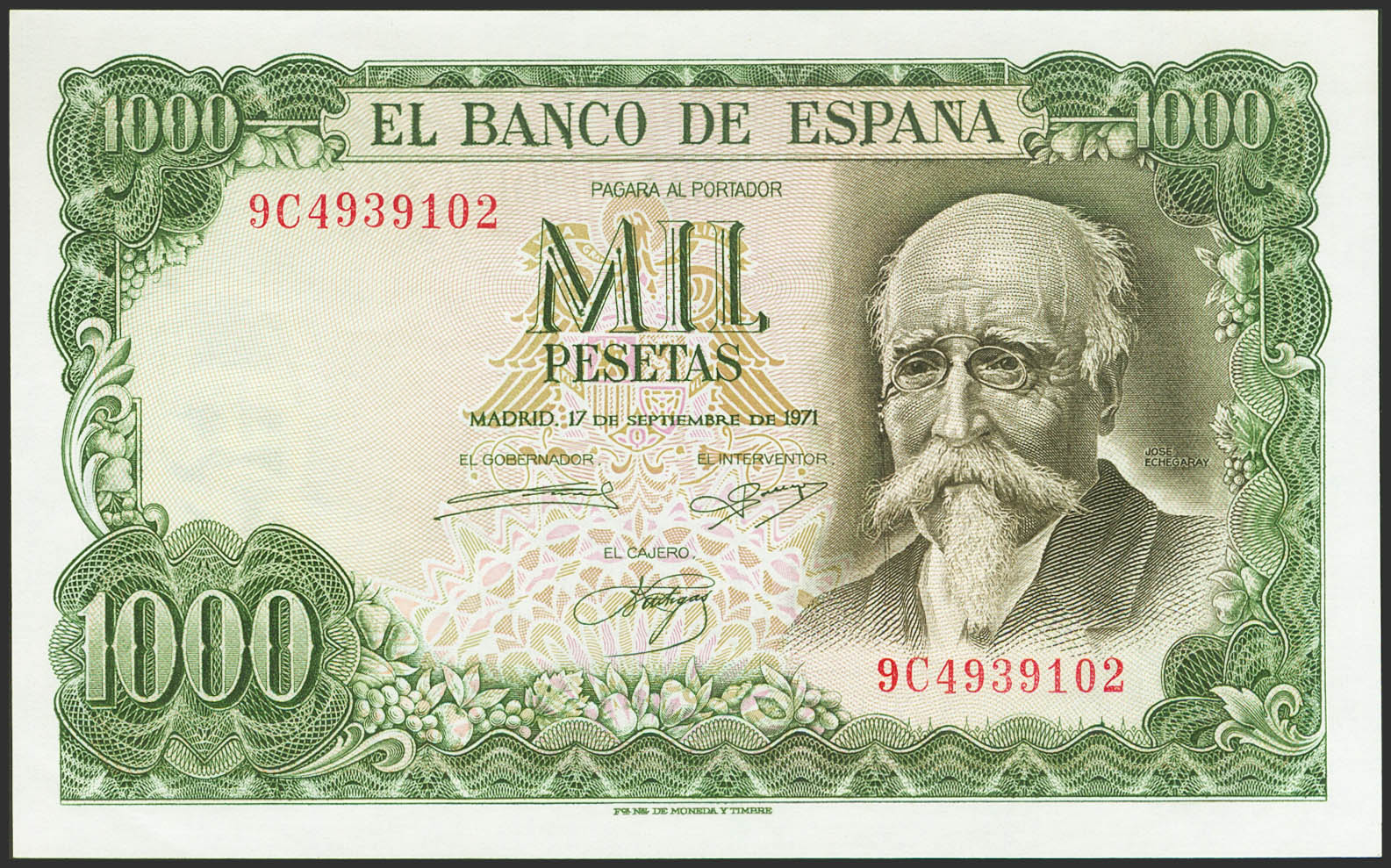 English 1000 Pesetas. September 17, 1971. Special Series 9C. (Edifil 2023: 474d). Rare series, original finish. Uncirculated.
