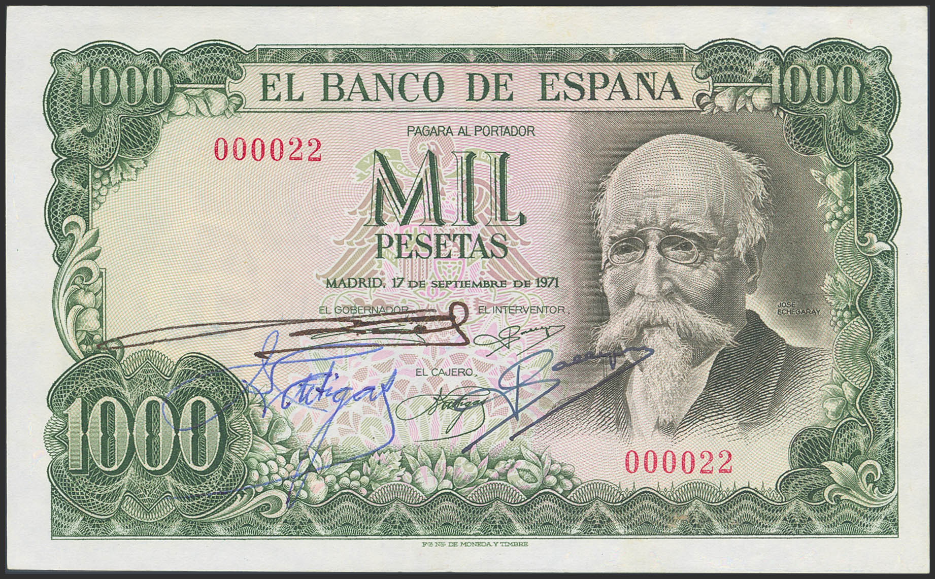 English 1000 Pesetas. September 17, 1971. No series, extremely low serial number 000022, and with the handwritten signatures of the Governor, Cashier, and Inventor of the Bank of Spain. (Edifil 2023: 474). Extremely rare, especially in this condition and with such a low serial number as mentioned in the catalog. Previously mounted. Uncirculated--.