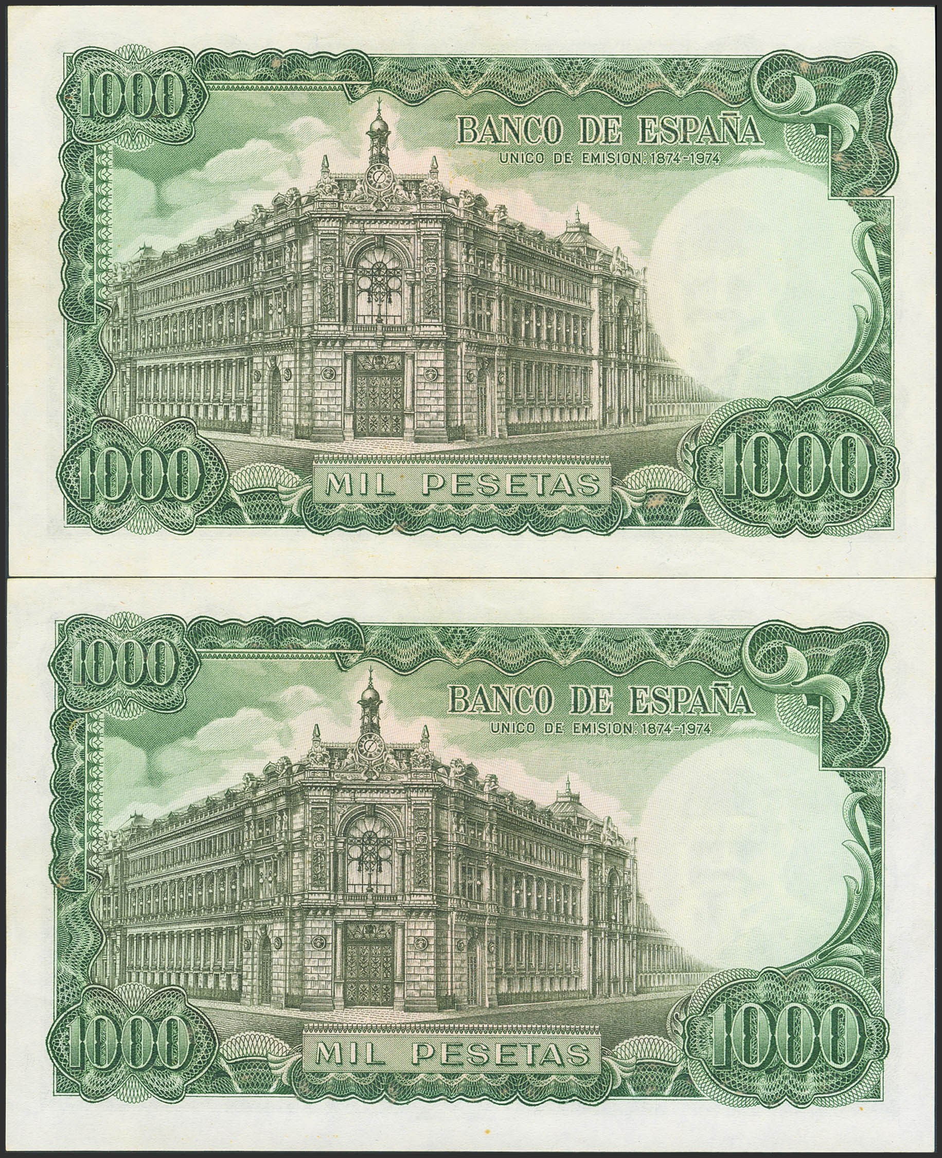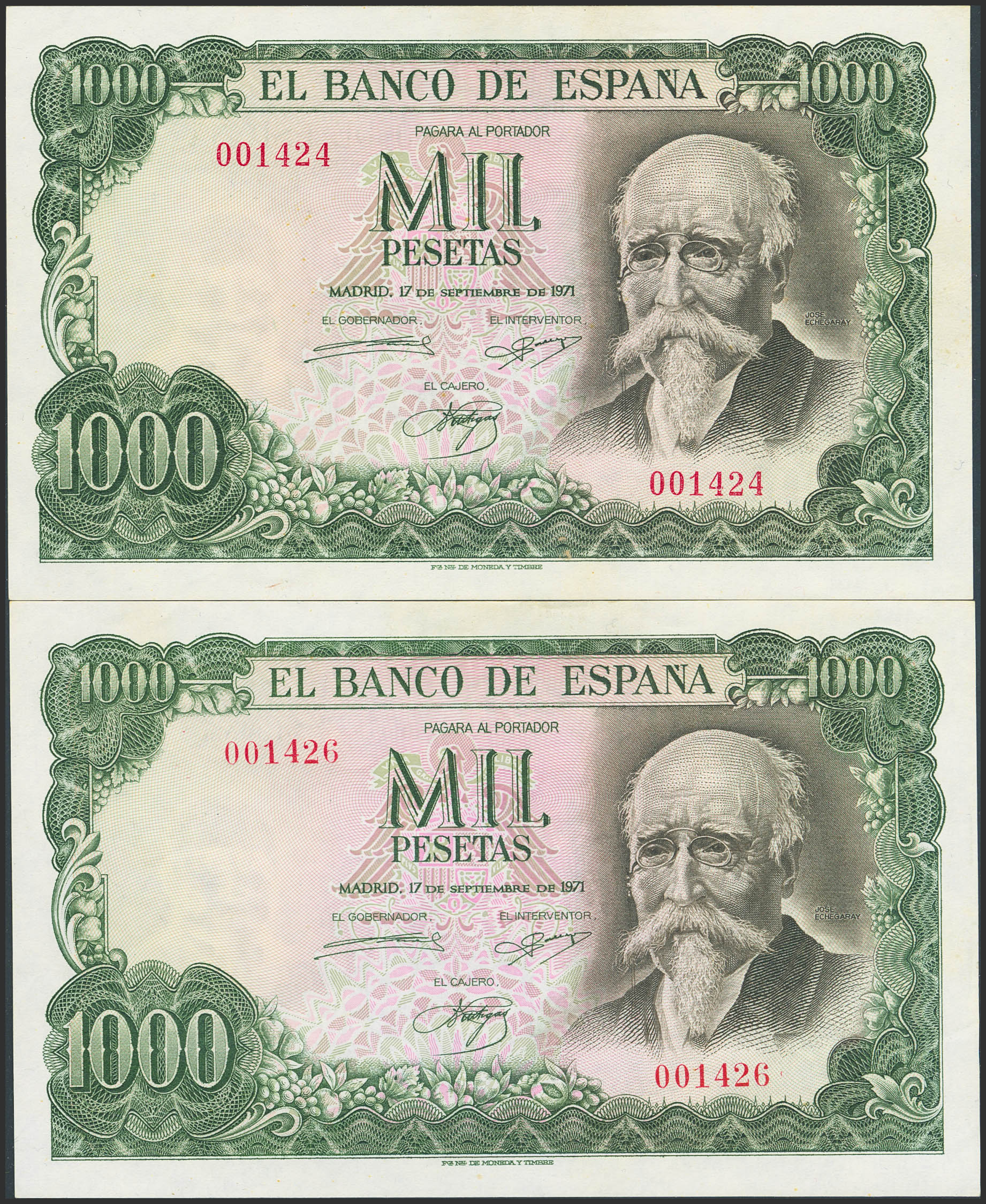 Set of two nearly consecutive 1000 Peseta banknotes, issued on September 17, 1971, without series and both with very low serial numbers (Edifil 2023: 474). They retain much of their original finish, showing signs of age. Extremely Fine.